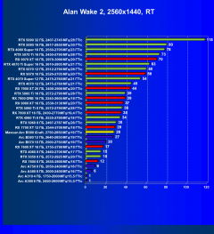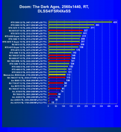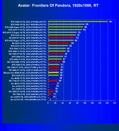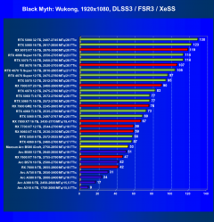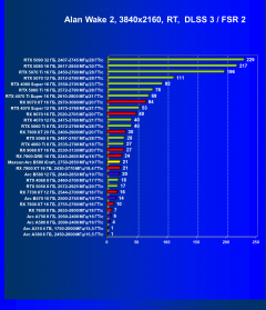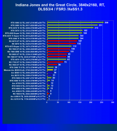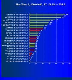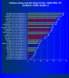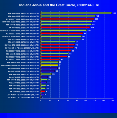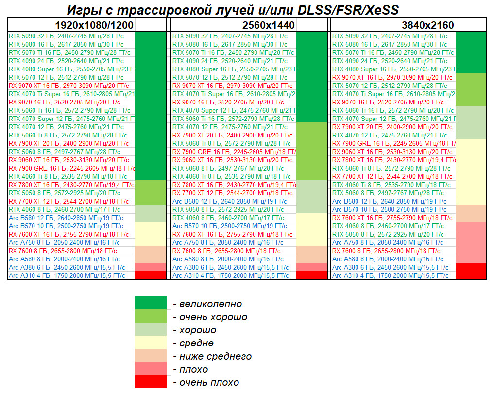 В играх с трассировкой лучей и(или) технологиями масштабирования снова свою роль сыграла эффективность DLSS4 для RTX 5xxx, так что выиграли оба участника ценовой группы — RTX 5050/5060, однако следует учитывать, что все же далеко не во всех играх можно получить комфортную играбельность в целом на подобных ускорителях. Ну разве что только в 1080p (Full HD) еще такое возможно. Но в целом все же мы видим, что рейтинг полезности у Arc B580 также на высоте.