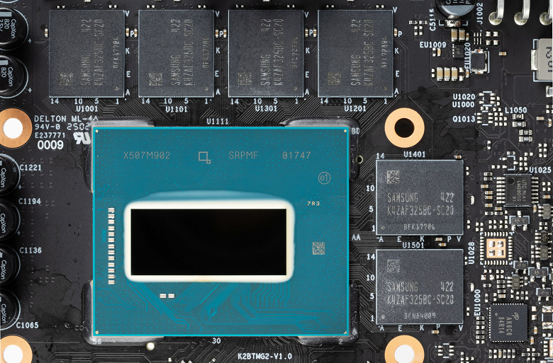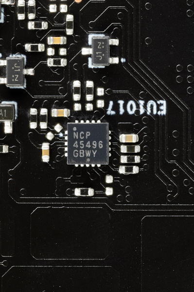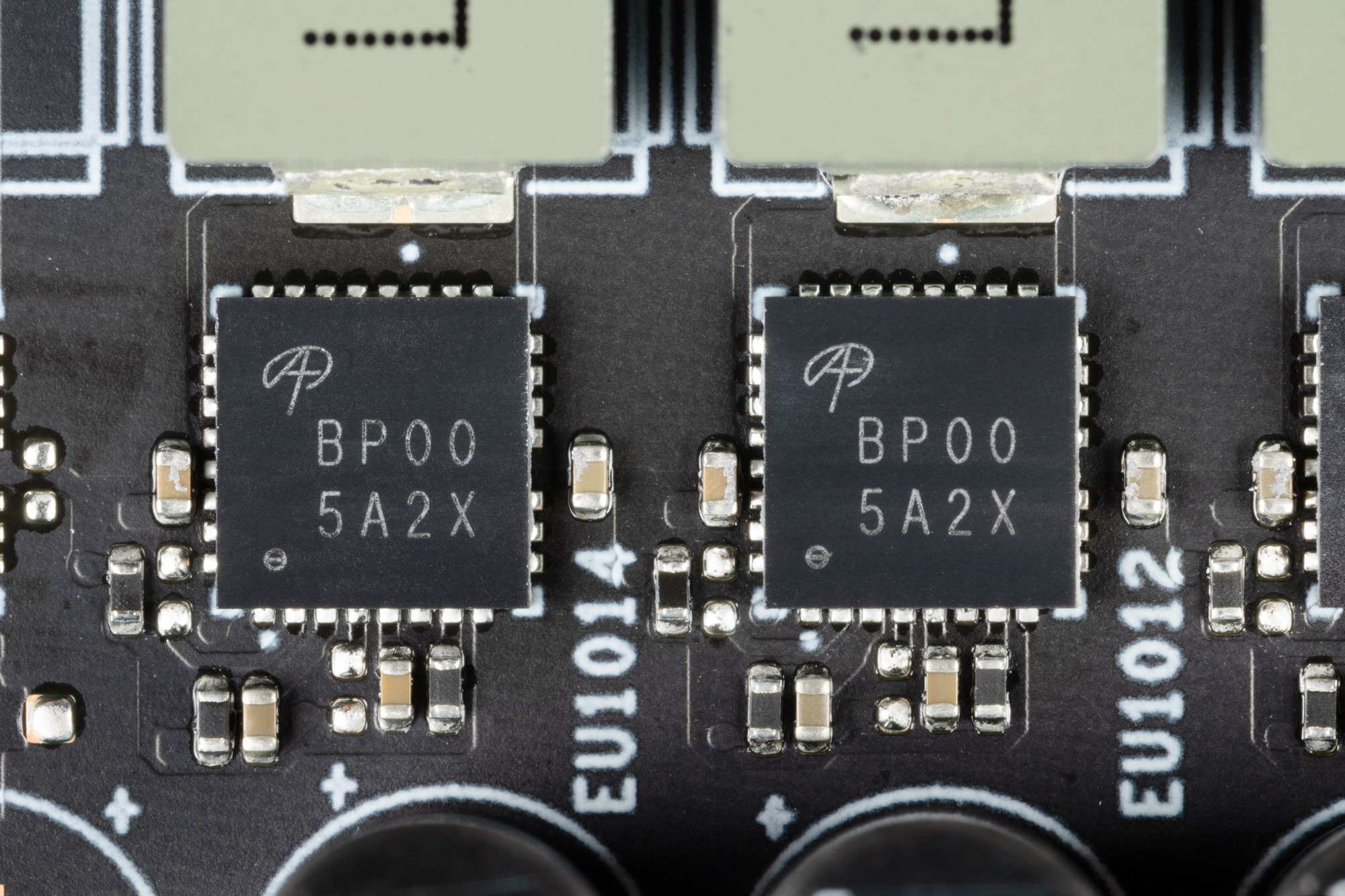 В преобразователе питания ядра используются транзисторные сборки DrMOS — Alpha&Omega Semiconductor AOZ5517QI (OEM-маркировка BP00), рассчитанные на 60 А.