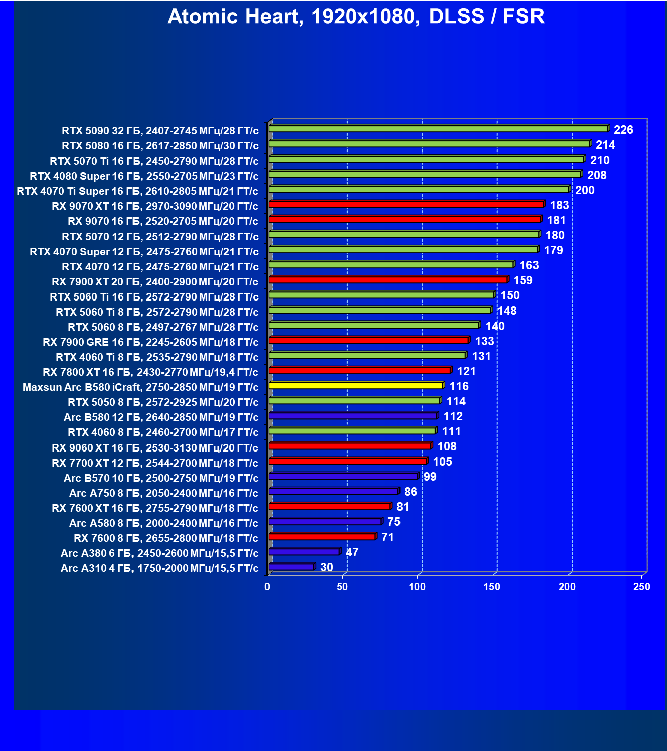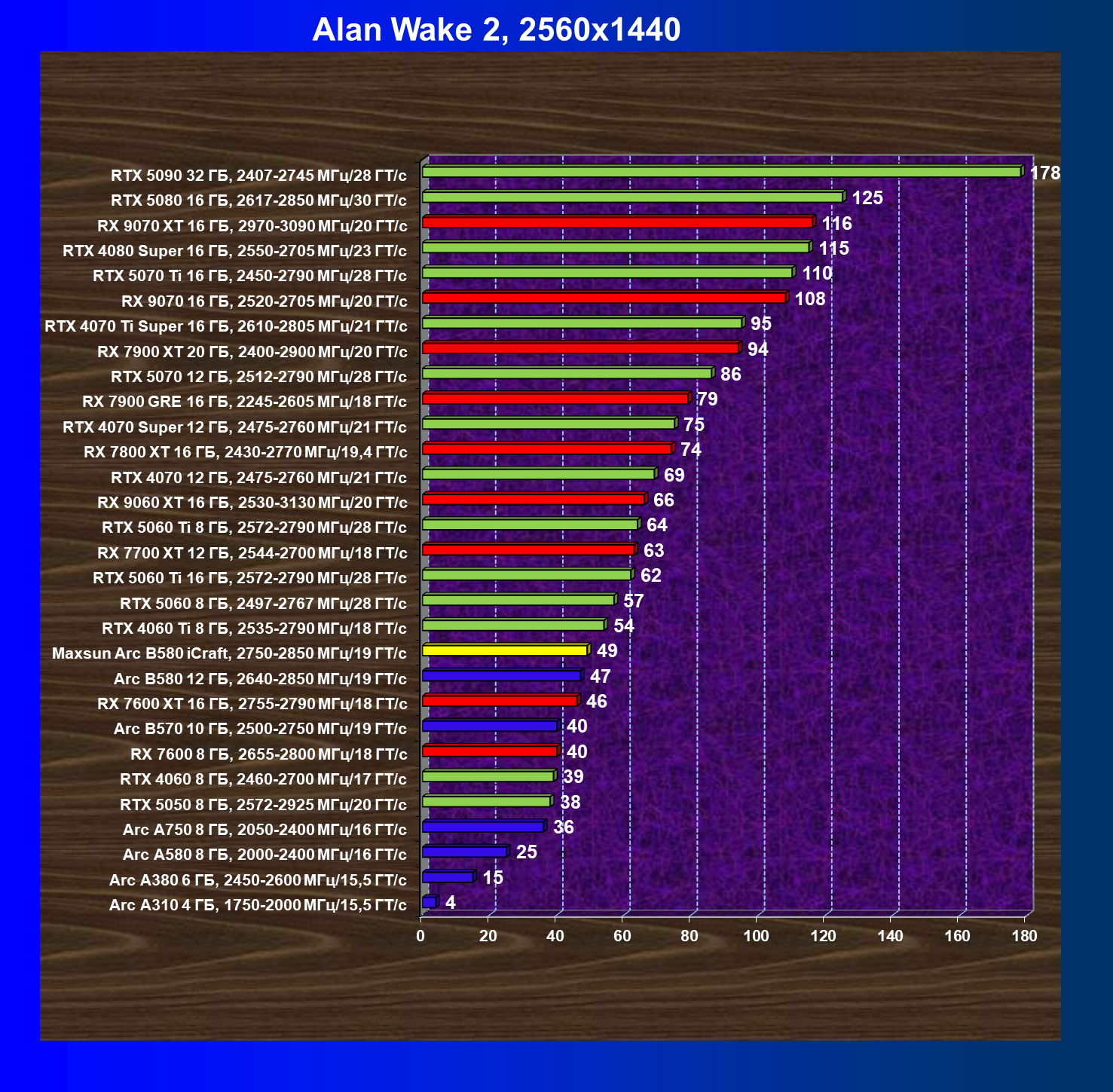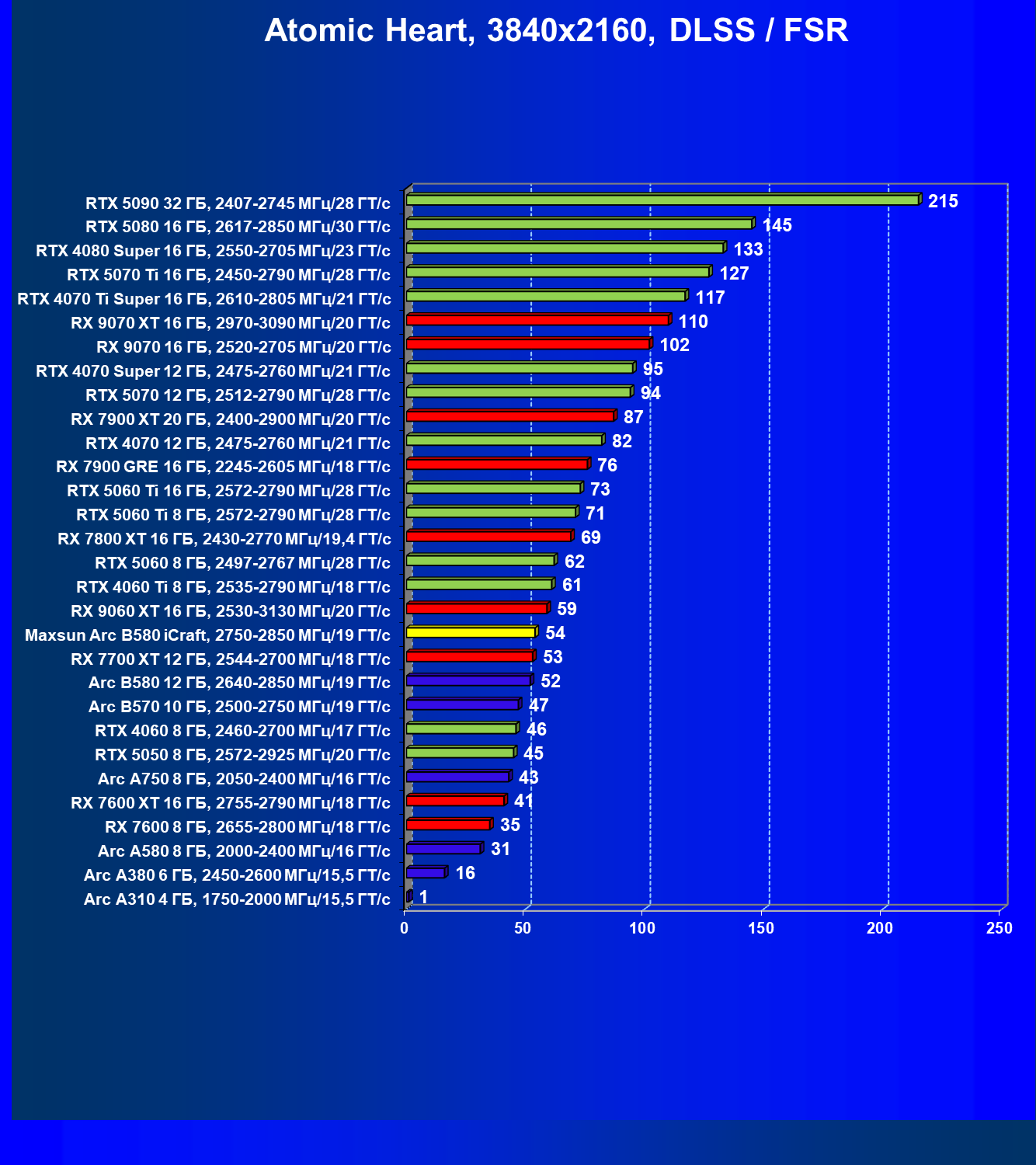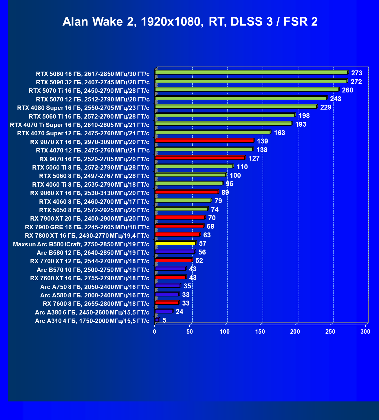 В играх с трассировкой лучей и(или) DLSS/FSR/XeSS ускоритель Arc B580 проиграл лишь RTX 5060 и RTX 4060 Ti, но отрыв от них весьма велик, и даже повышенных частот карты Maxsun недостаточно, чтобы ликвидировать такой разрыв. Конечно, во многом это вклад технологии DLSS 3/4.