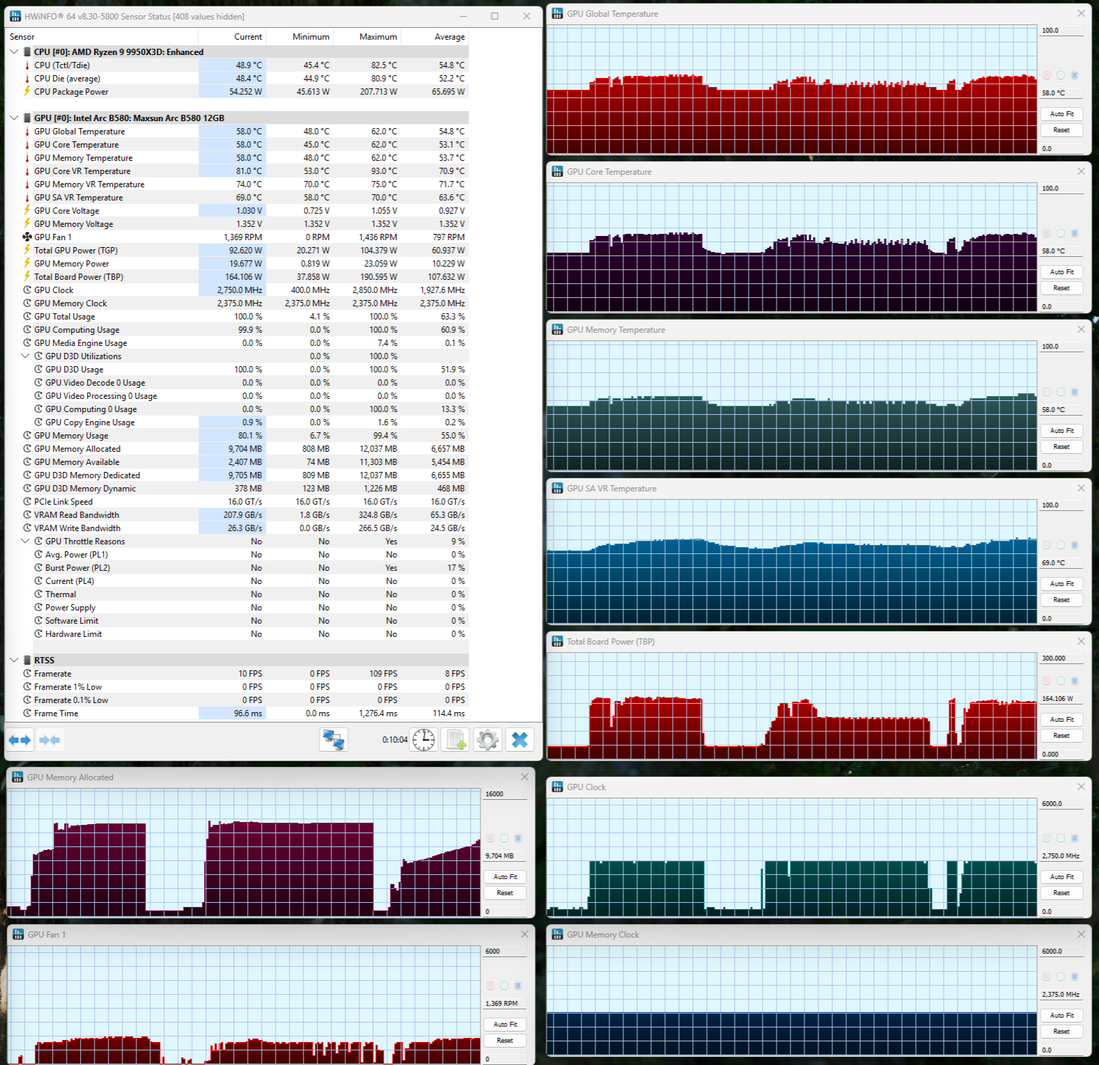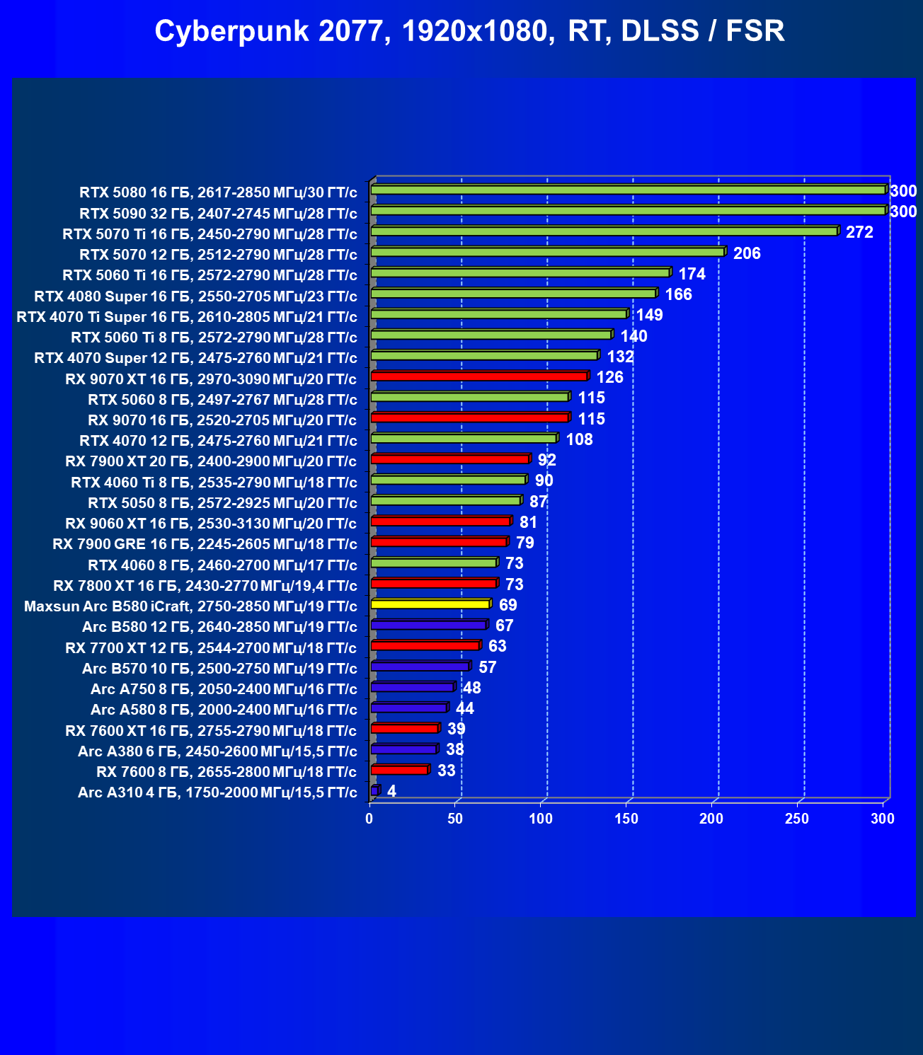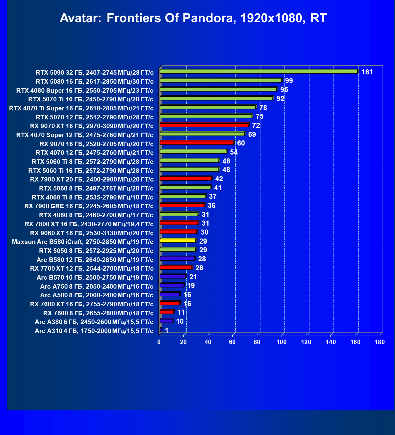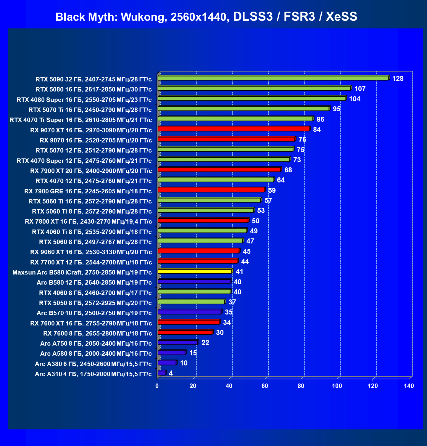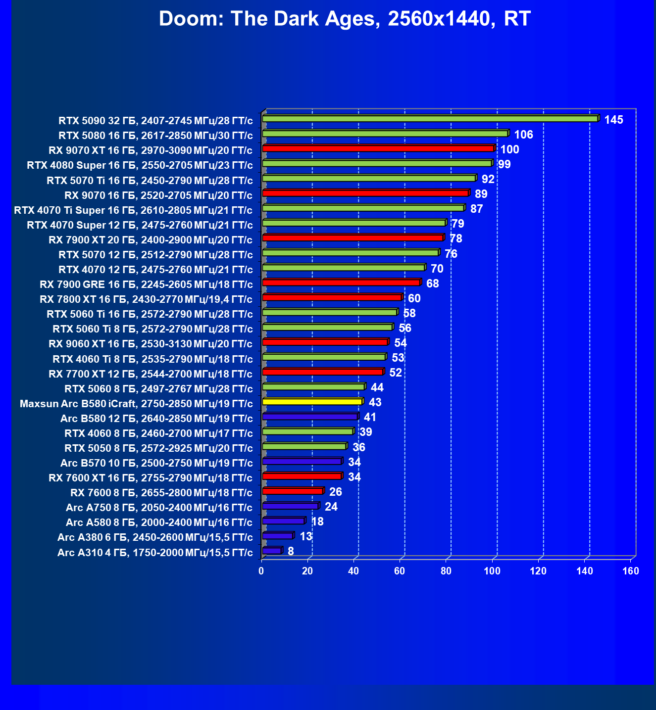 В играх с трассировкой лучей и(или) DLSS/FSR/XeSS ускоритель Arc B580 проиграл лишь RTX 5060 и RTX 4060 Ti, но отрыв от них весьма велик, и даже повышенных частот карты Maxsun недостаточно, чтобы ликвидировать такой разрыв. Конечно, во многом это вклад технологии DLSS 3/4.