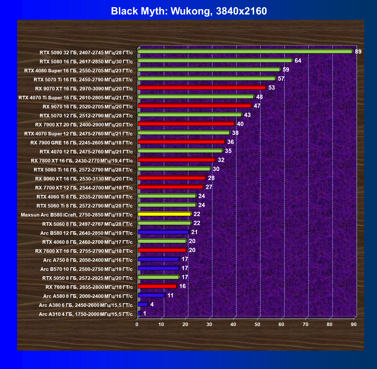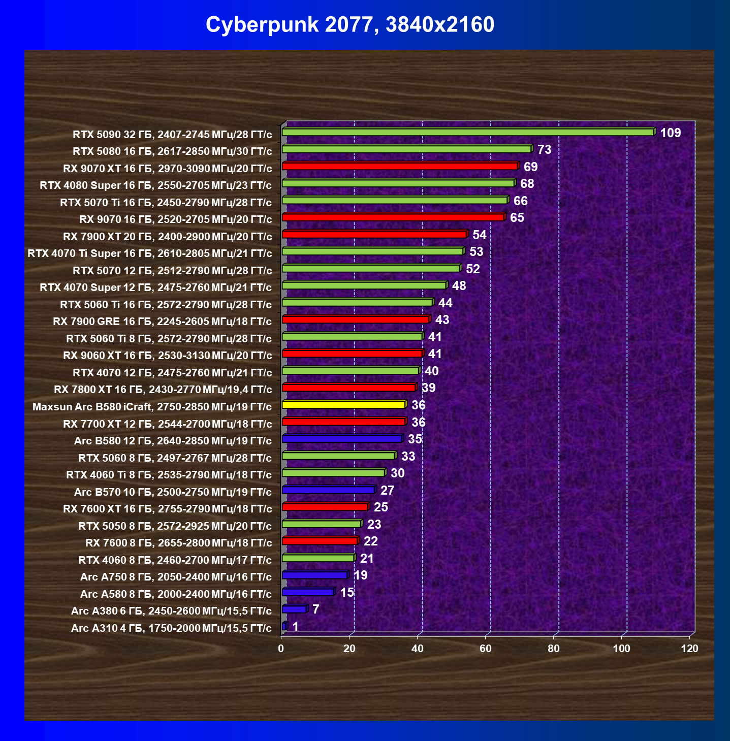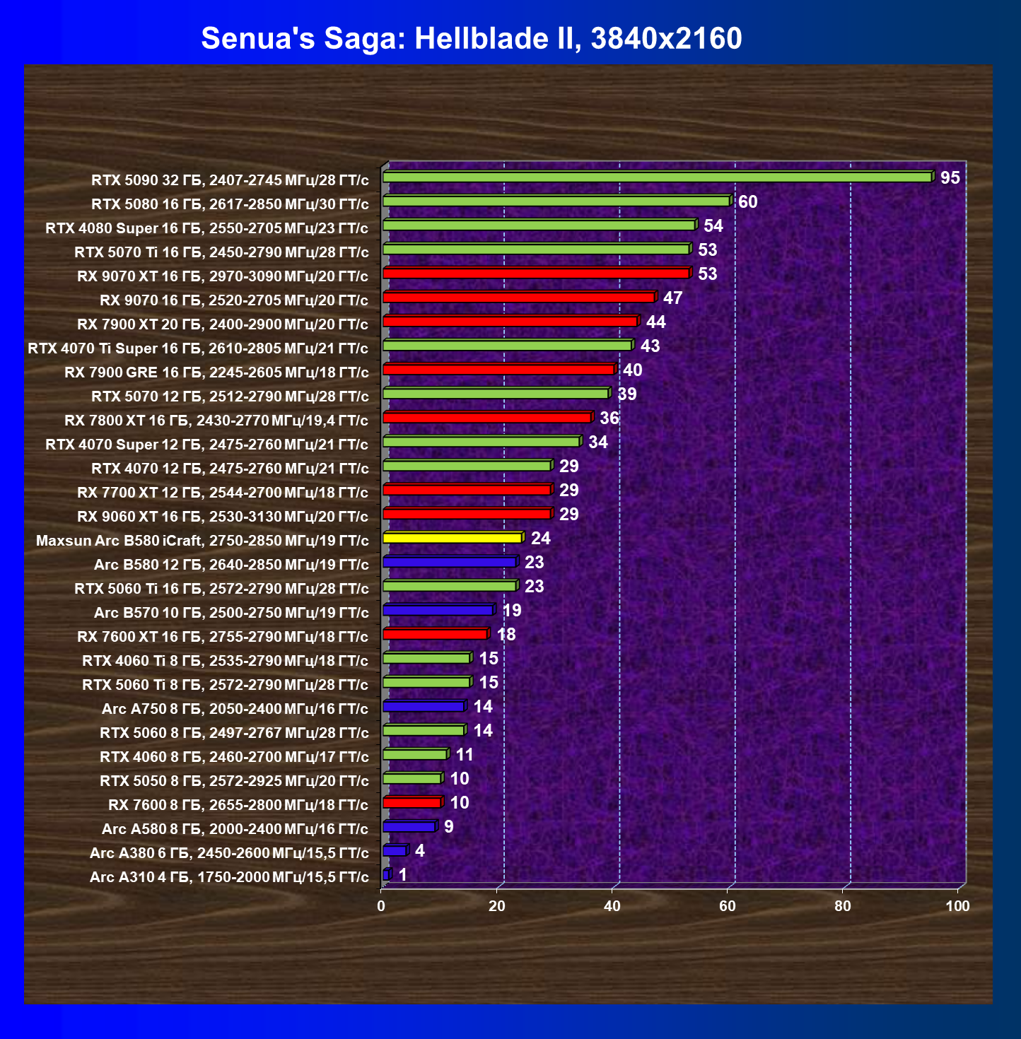 | 16 | Arc B570 10 ГБ, 2500—2750 МГц/19 ГТ/с | 503 | 1410 | 28 000 |
