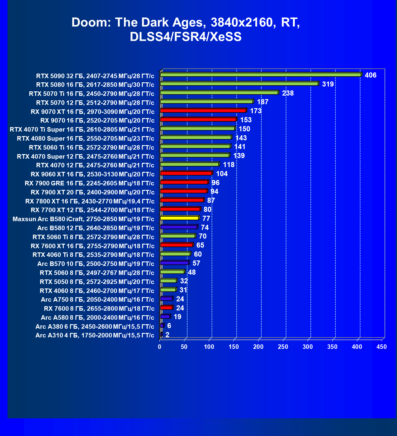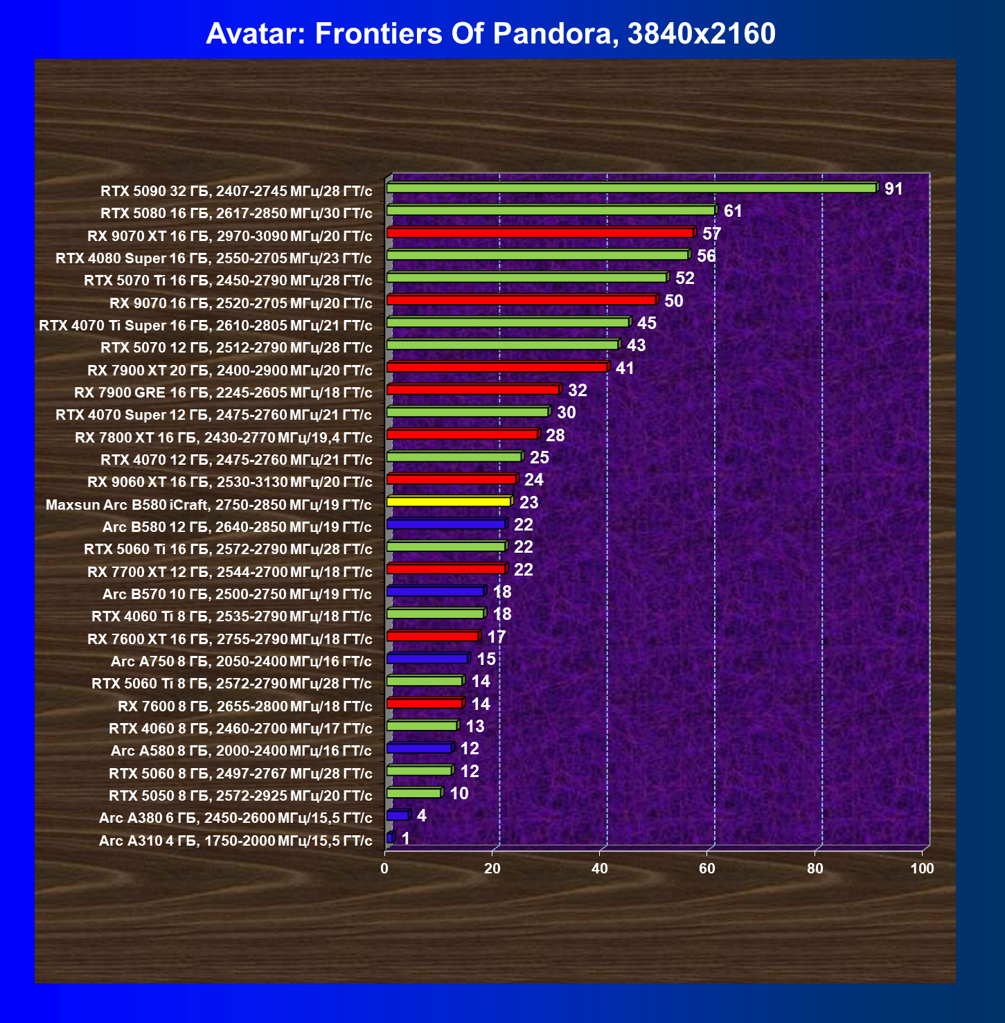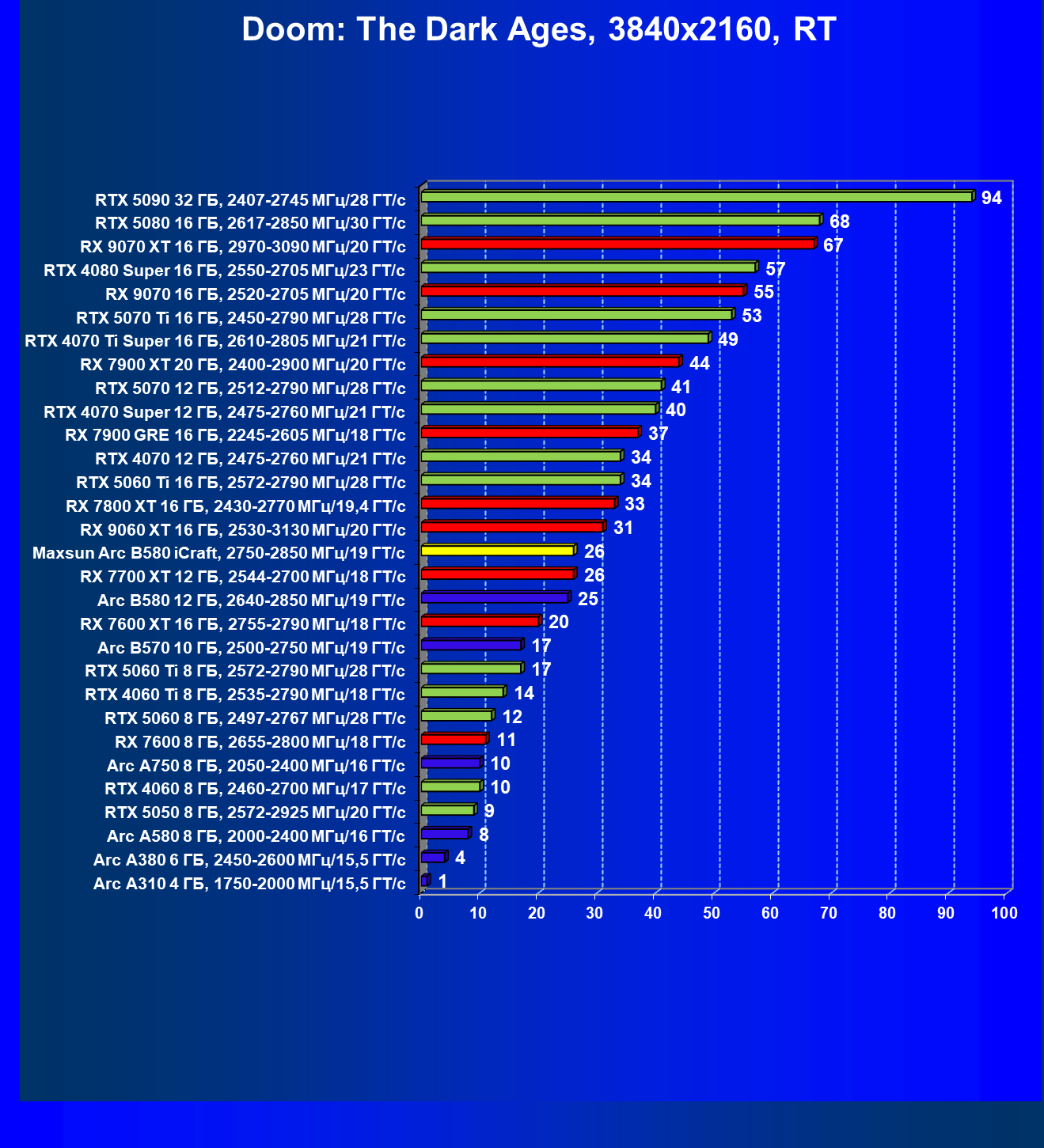 | 16 | Arc B570 10 ГБ, 2500—2750 МГц/19 ГТ/с | 503 | 1410 | 28 000 |