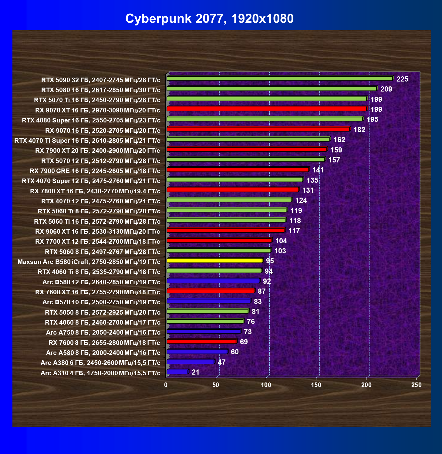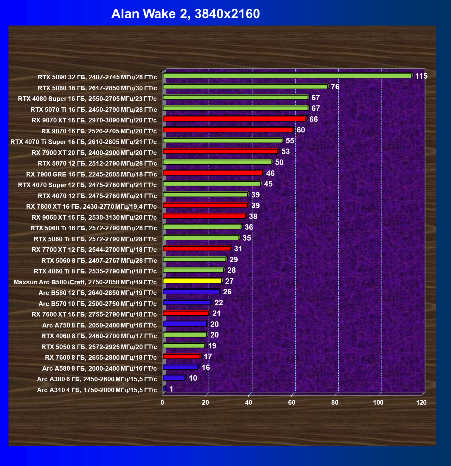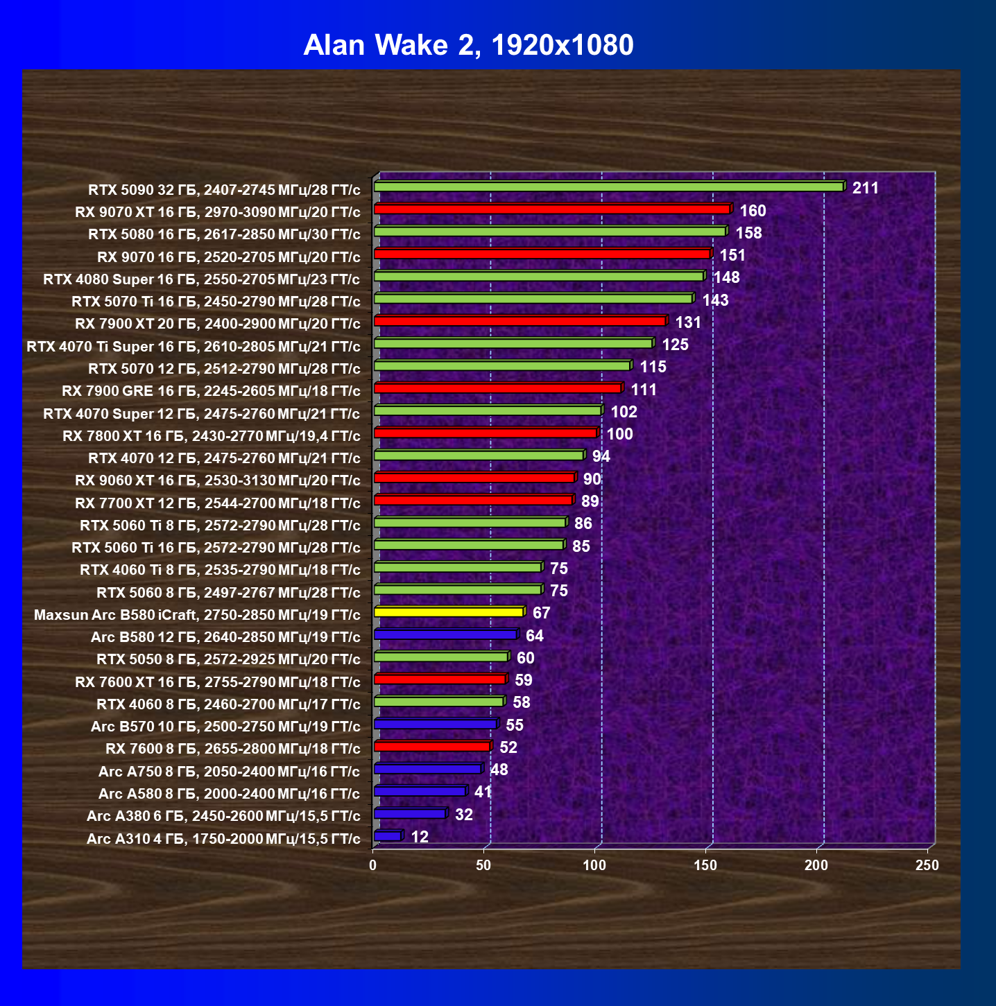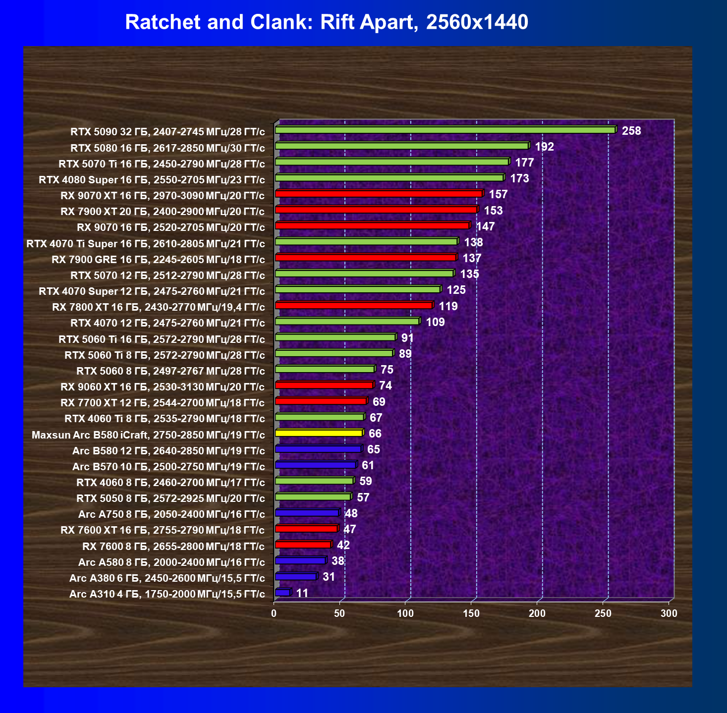 | 09 | Maxsun Arc B580 iCraft, 2750—2850 МГц/19 ГТ/с | 558 | 1730 | 31 000 |