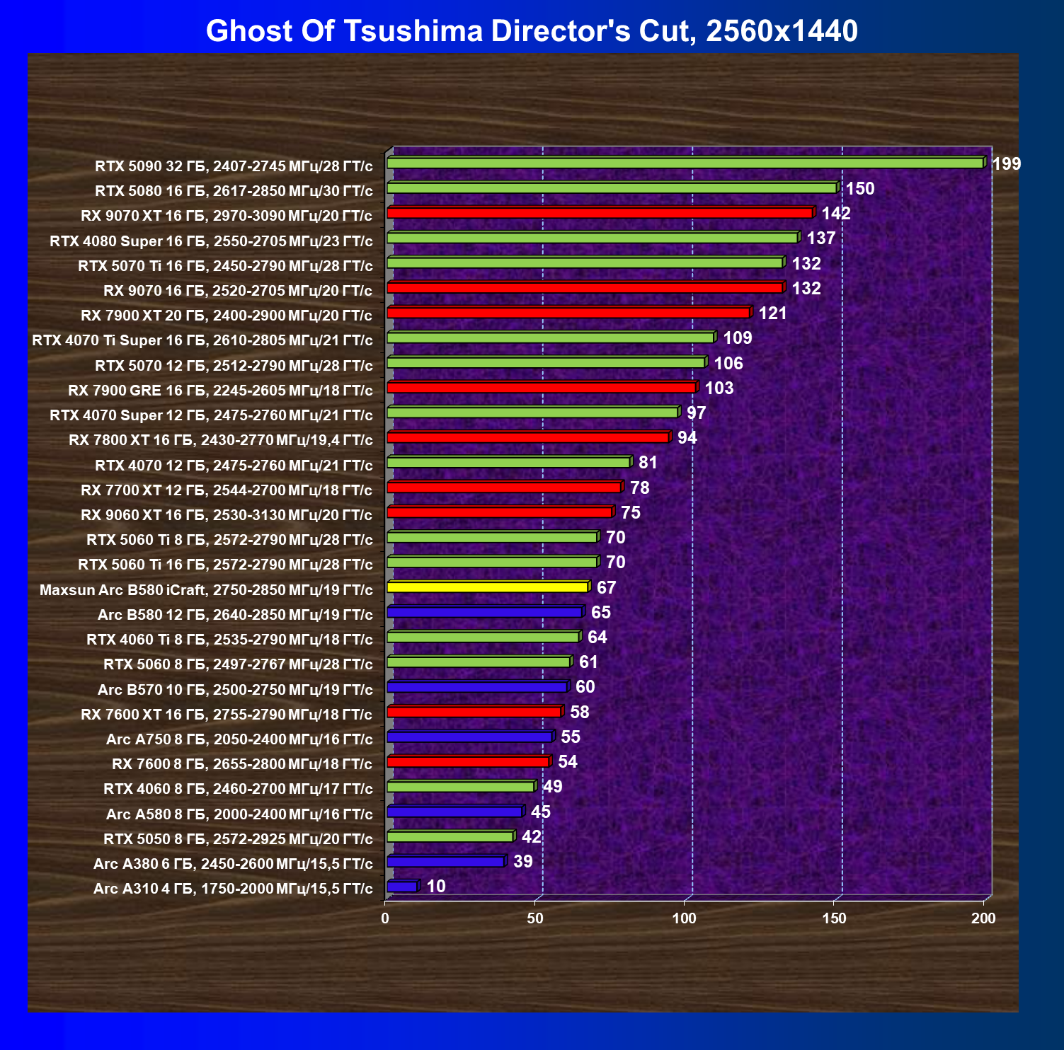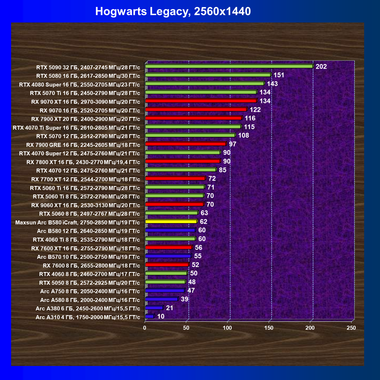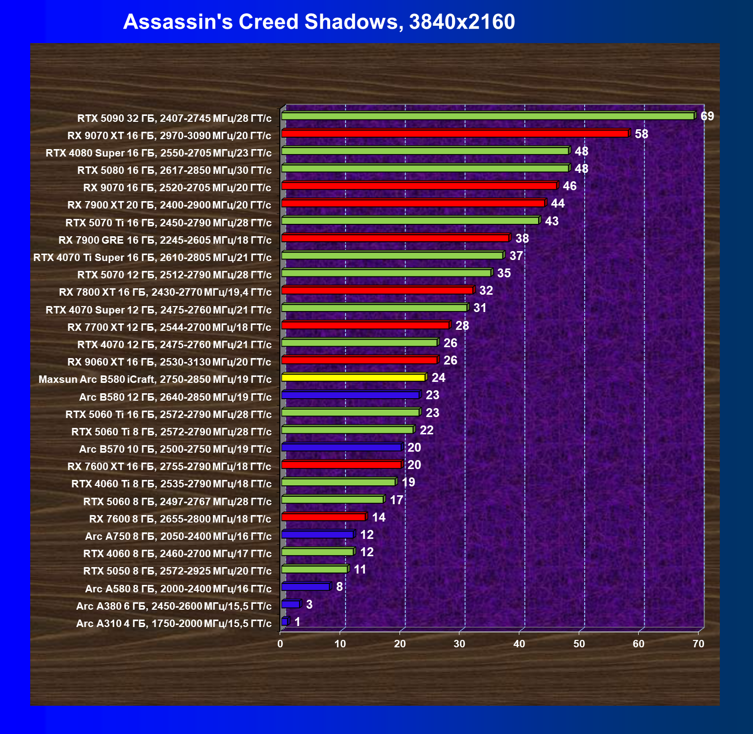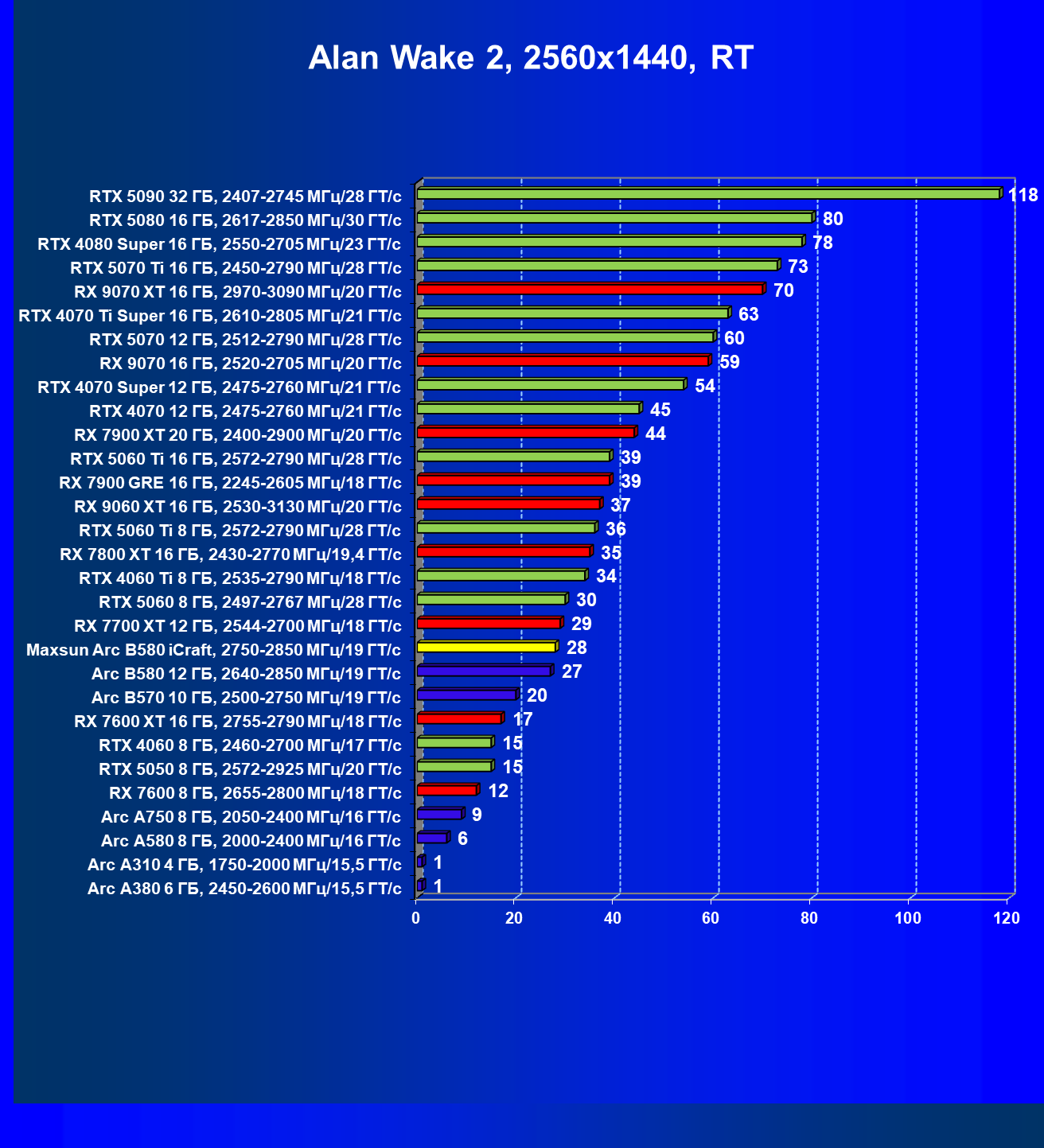 | 09 | Maxsun Arc B580 iCraft, 2750—2850 МГц/19 ГТ/с | 558 | 1730 | 31 000 |