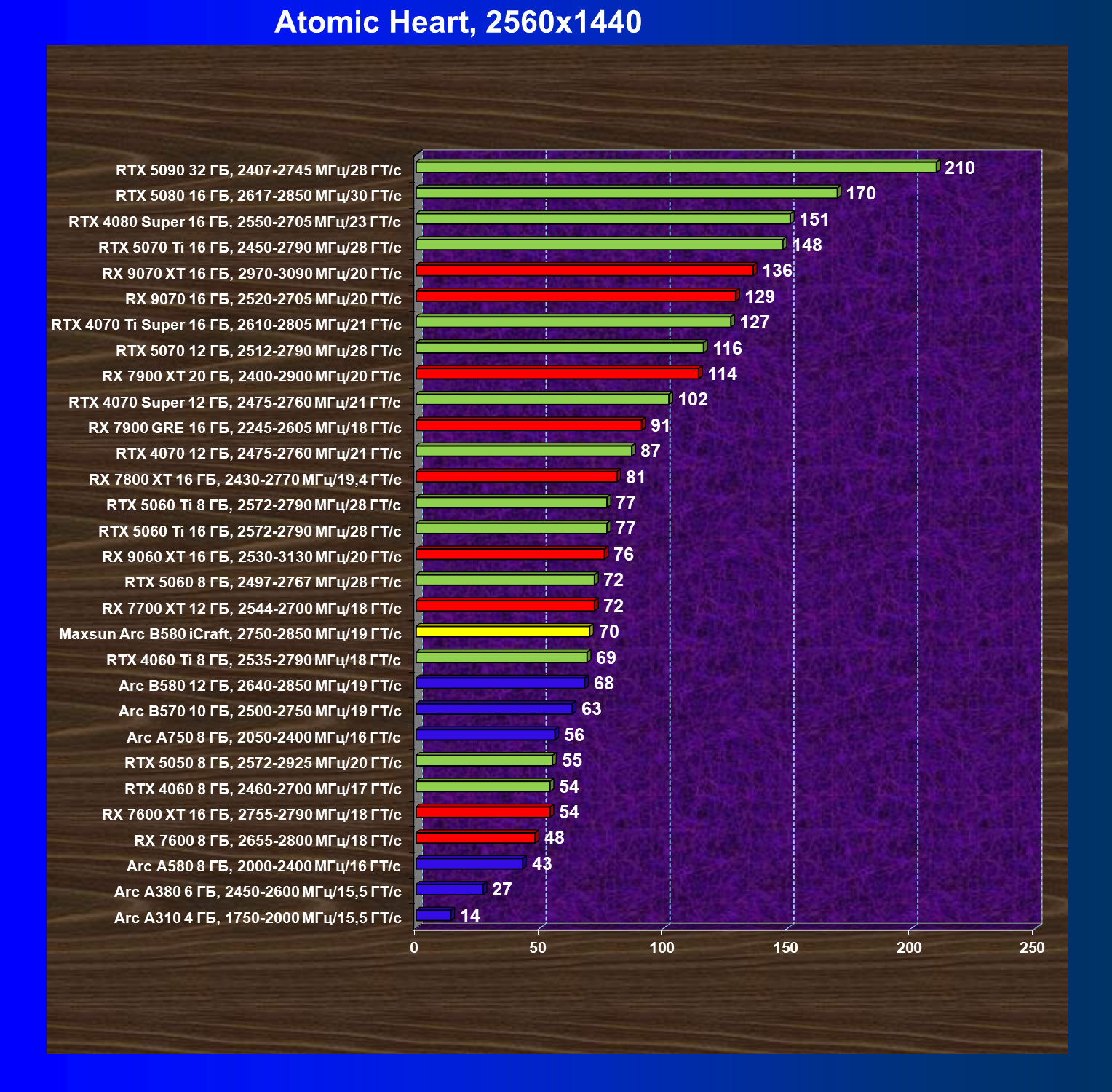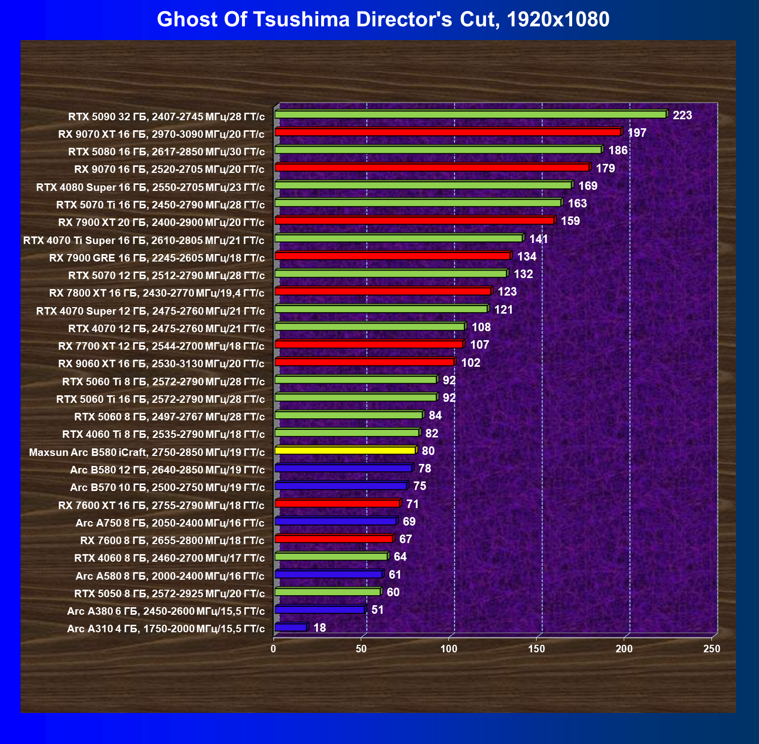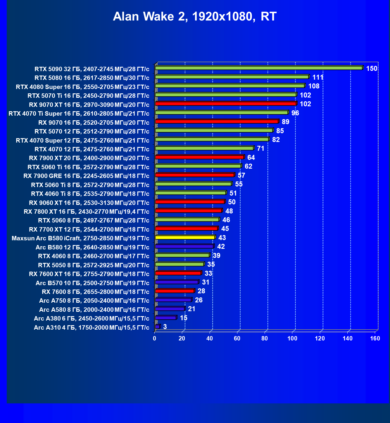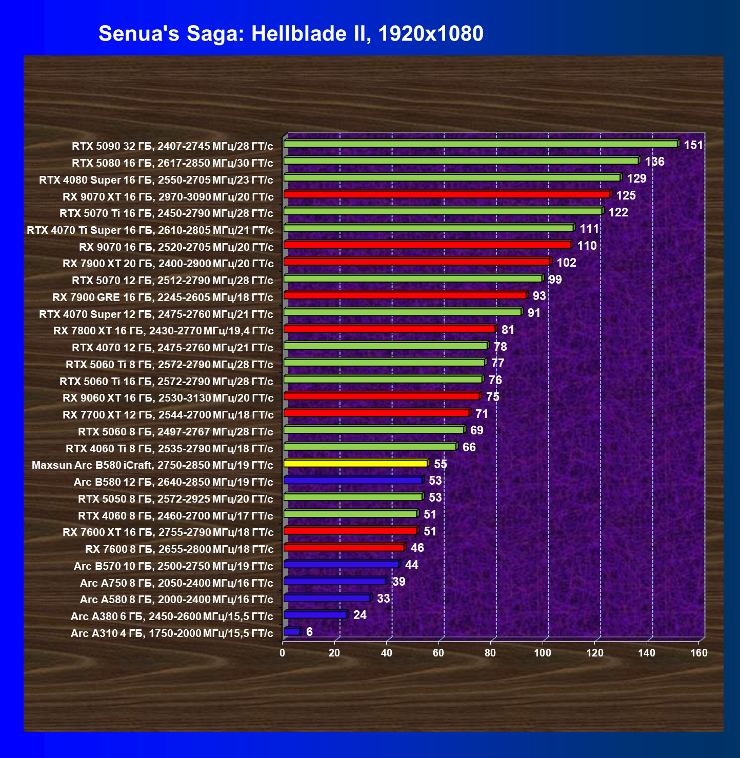 | 09 | Maxsun Arc B580 iCraft, 2750—2850 МГц/19 ГТ/с | 558 | 1730 | 31 000 |