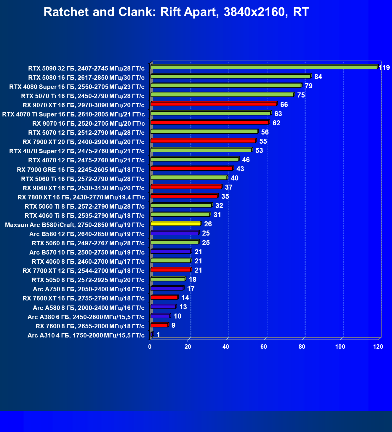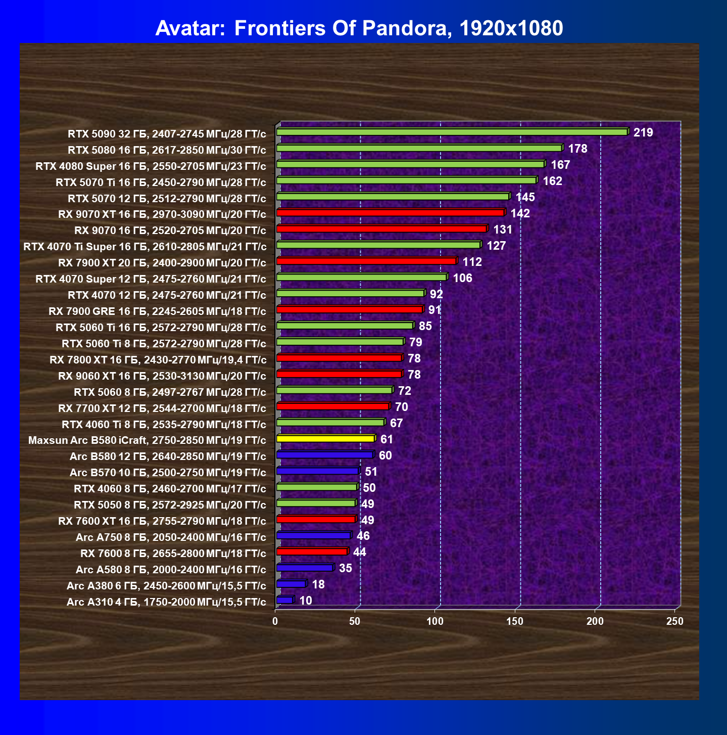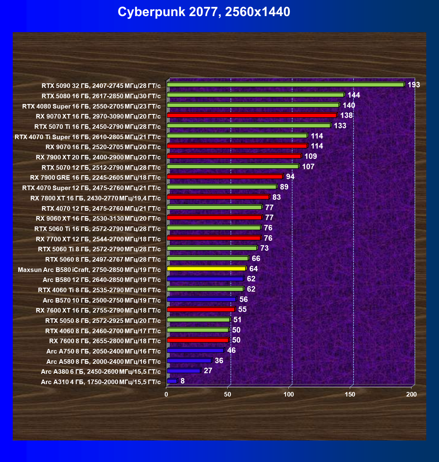 | 01 | Maxsun Arc B580 iCraft, 2750—2850 МГц/19 ГТ/с | 351 | 1088 | 31 000 |