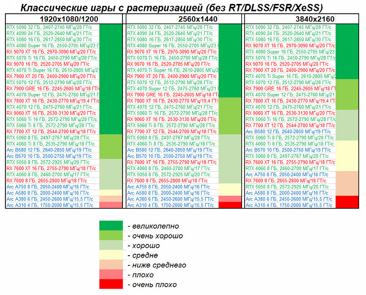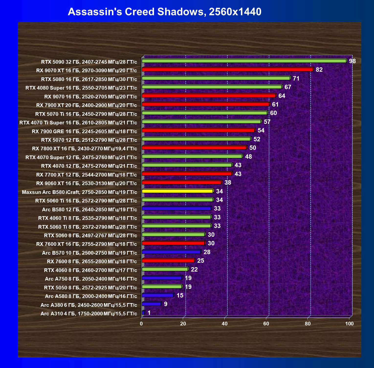 | 21 | Arc B580 12 ГБ, 2640—2850 МГц/19 ГТ/с | 1678 | 541 | 31 000 |