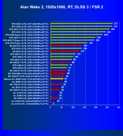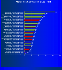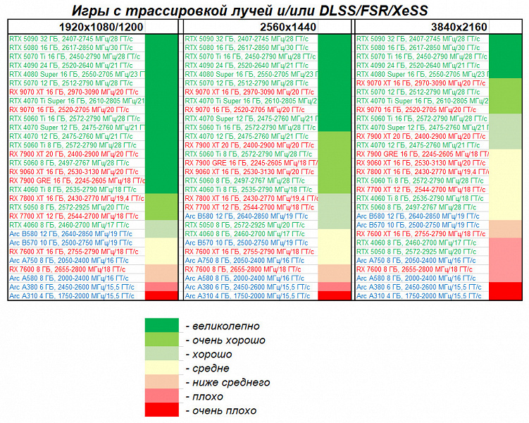 Результаты тестов со включенной аппаратной трассировкой лучей и/или DLSS/FSR/XeSS в разрешениях 1920×1080, 2560×1440 и 3840×2160
