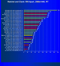 Рейтинг составлен по 10 тестам, в которых используется технология трассировки лучей и одновременно технология Nvidia DLSS, AMD FSR или Intel XeSS. Этот рейтинг нормирован по самому слабому ускорителю в данной группе — Arc A310 (то есть сочетание скорости и функций Arc A310 приняты за 100%).