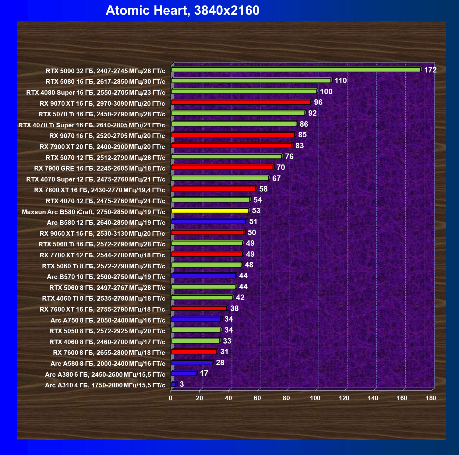 | 20 | Maxsun Arc B580 iCraft, 2750—2850 МГц/19 ГТ/с | 1730 | 558 | 31 000 |