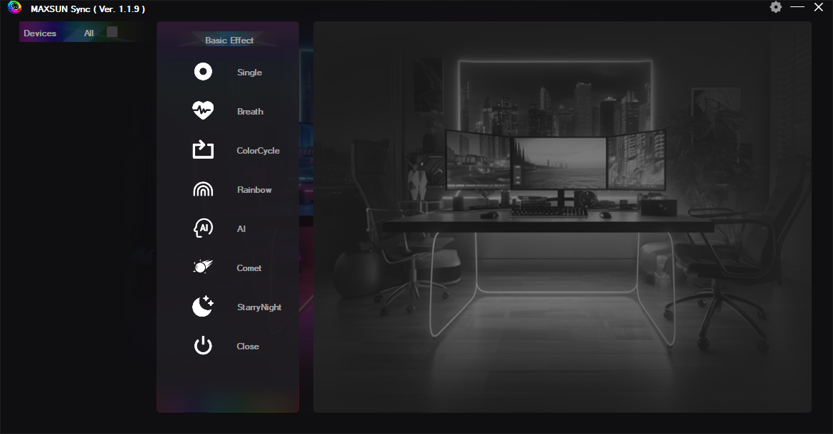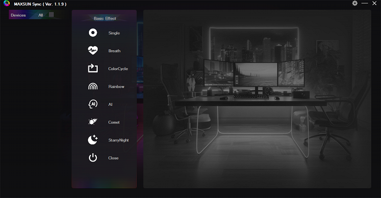 Управление режимами подсветки, в том числе и ее отключением, осуществляется утилитой Maxsun Sync. Вариантов сценариев немного. Синхронизация подсветки предусмотрена только с материнскими платами того же производителя.