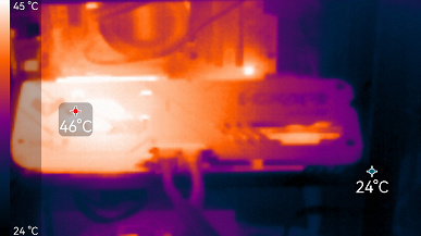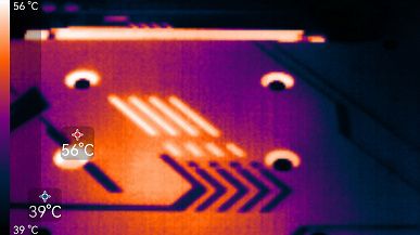 Максимальный нагрев наблюдался в нижней части PCB около разъема PCIe, а также в области GPU.