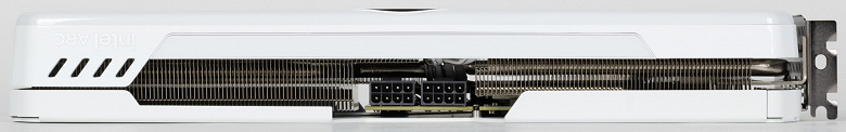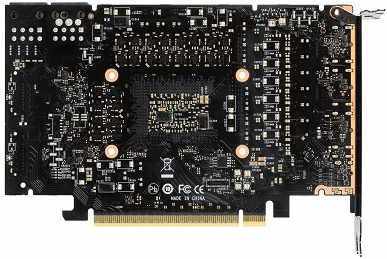 Габариты карты в целом невелики, толщина составляет 4,4 см, так что видеокарта чуть-чуть вылезает за пределы второго слота. Де-факто она занимает 3 слота в системном блоке, но зато может быть установлена в компактных корпусах, предусматривающих два слота расширения.