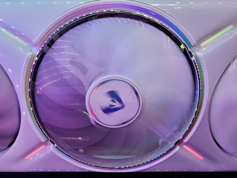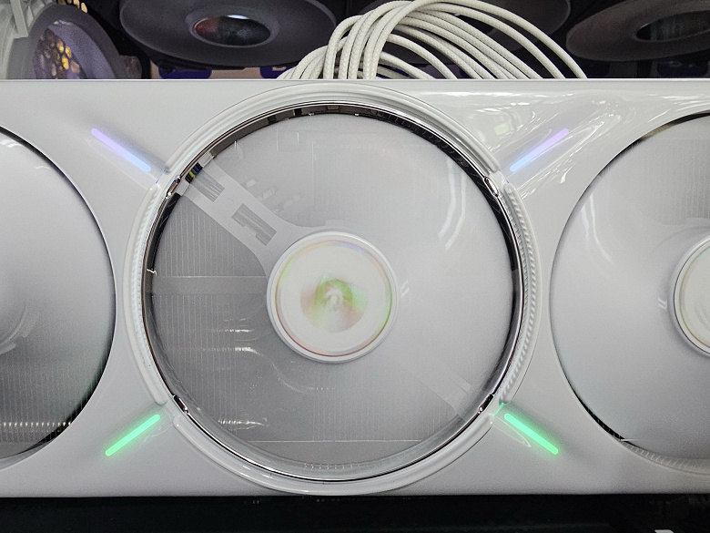Поверх радиатора установлен кожух с тремя вентиляторами ∅95 мм. Концы лопастей объединены в кольцо, что помогает повысить эффективность воздушного потока. Поверхность кожуха напоминает керамику.
