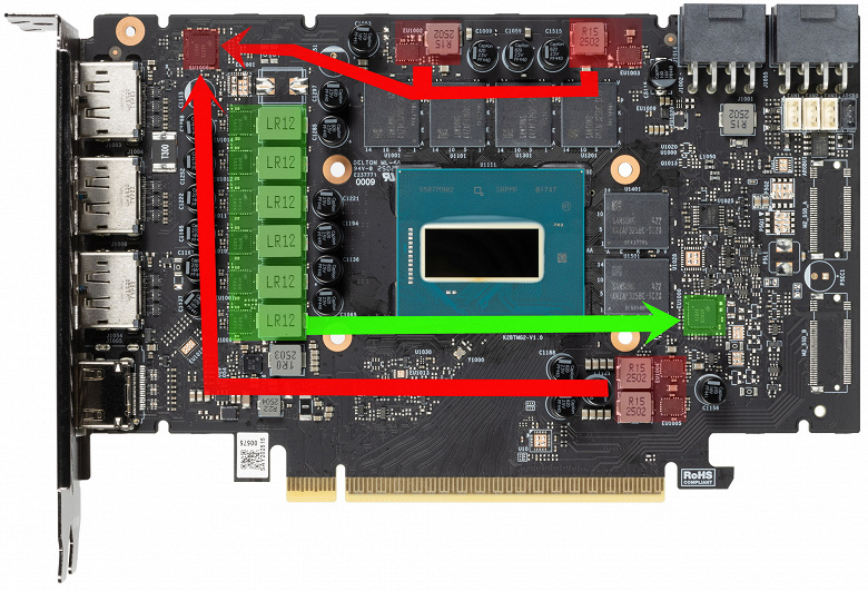Зеленым цветом отмечена схема питания ядра, красным — памяти. Все ШИМ-контроллеры расположены на лицевой стороне PCB.