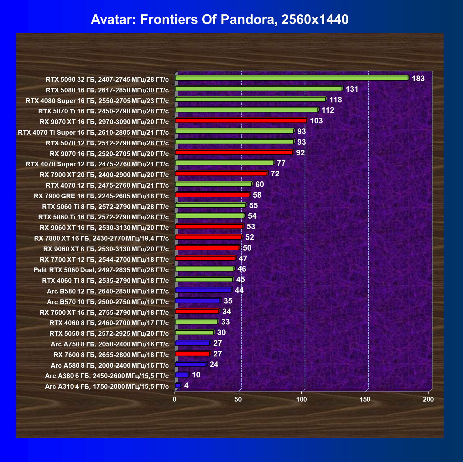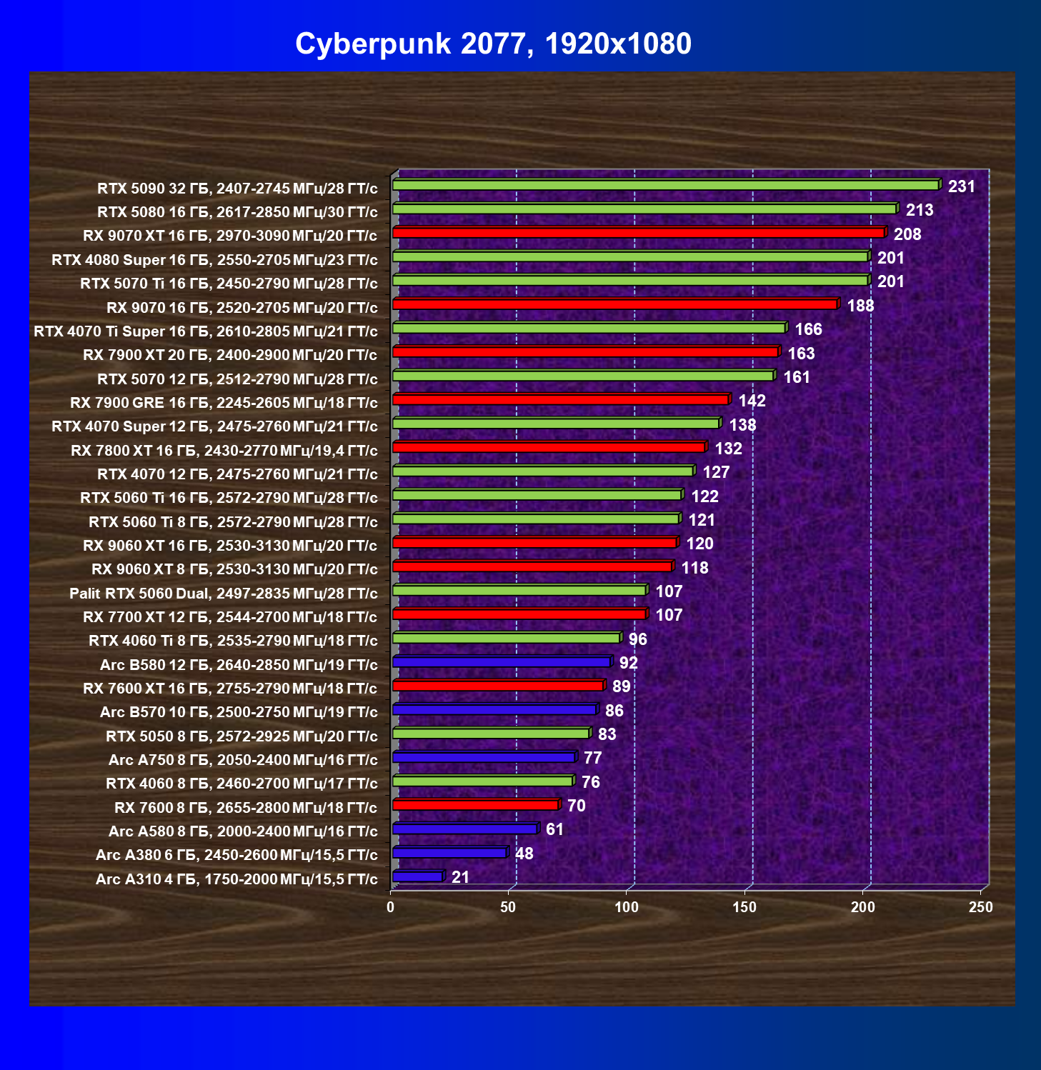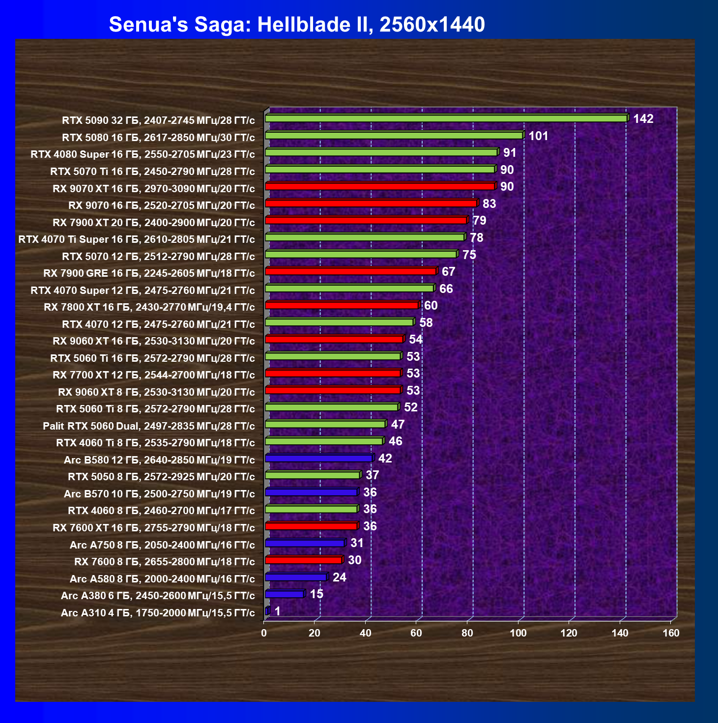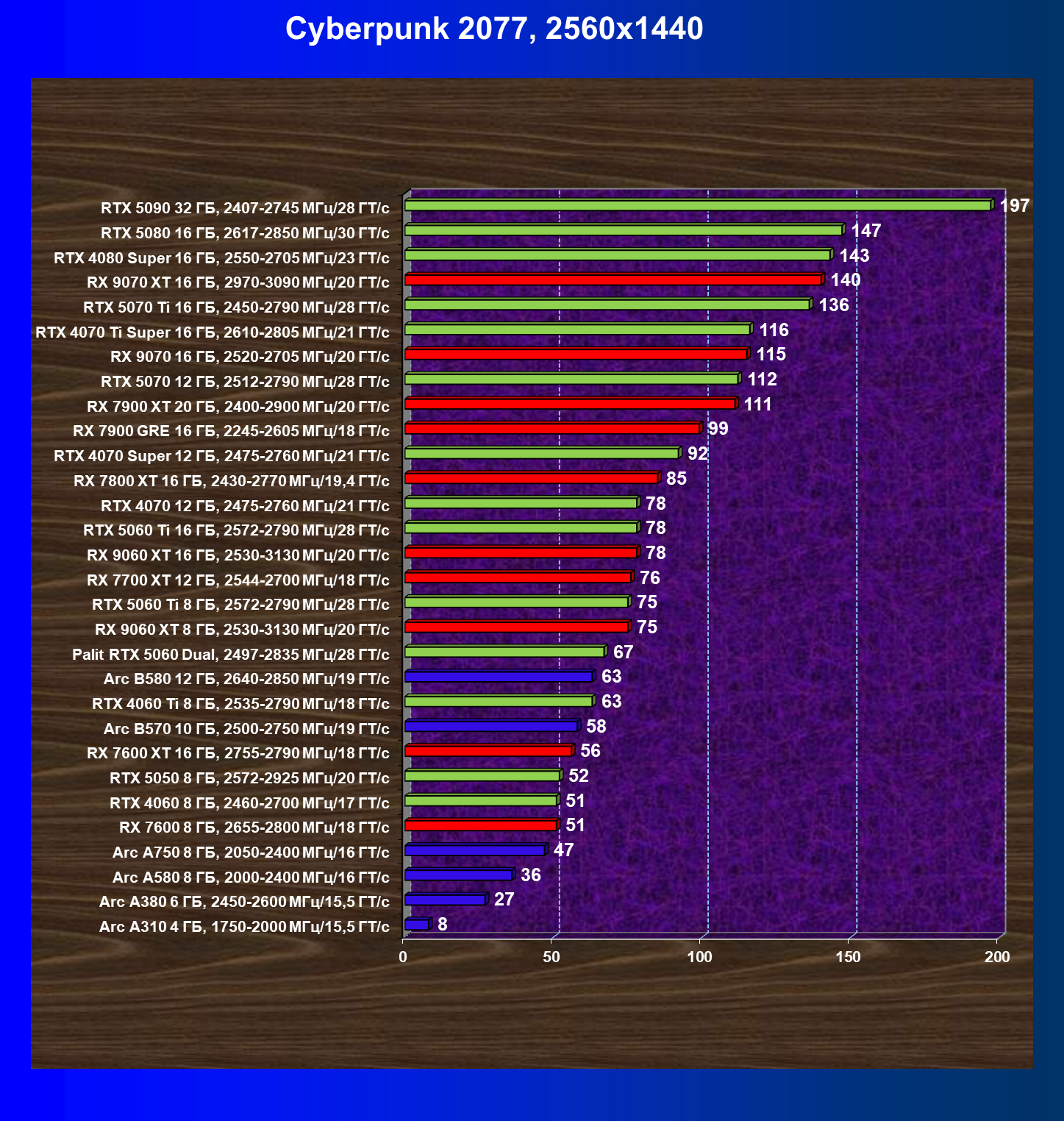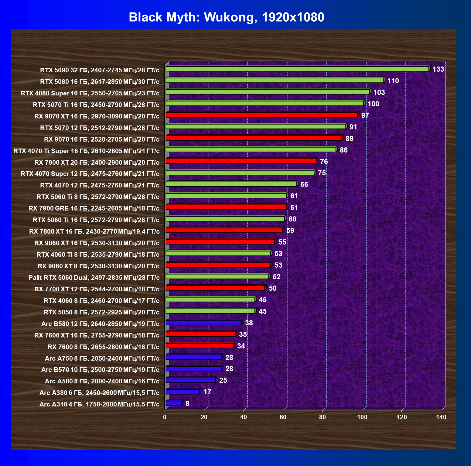 Мы видим, что GeForce RTX 5060 намного быстрее, чем Radeon RX 7600 XT (при этом последний дороже), также опережает GeForce RTX 4060 Ti, Arc B580 (однако последний сильно дешевле).