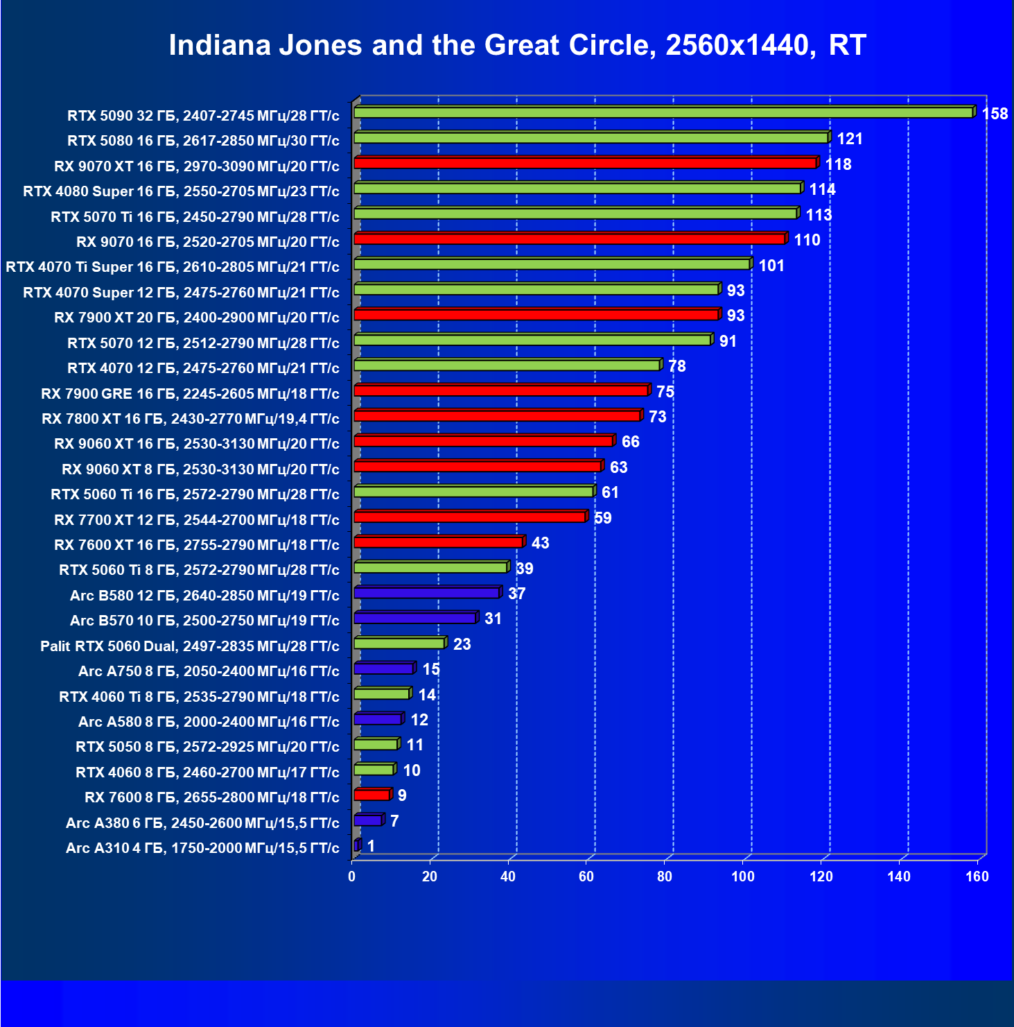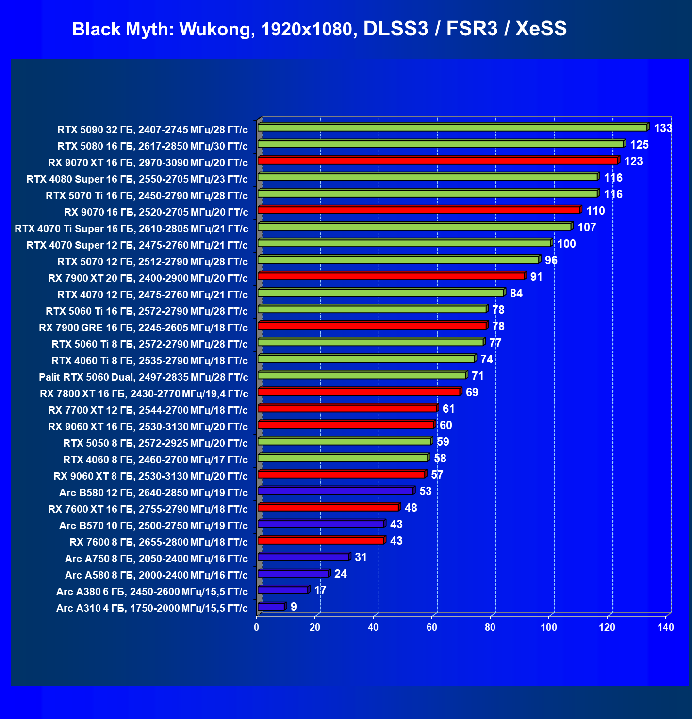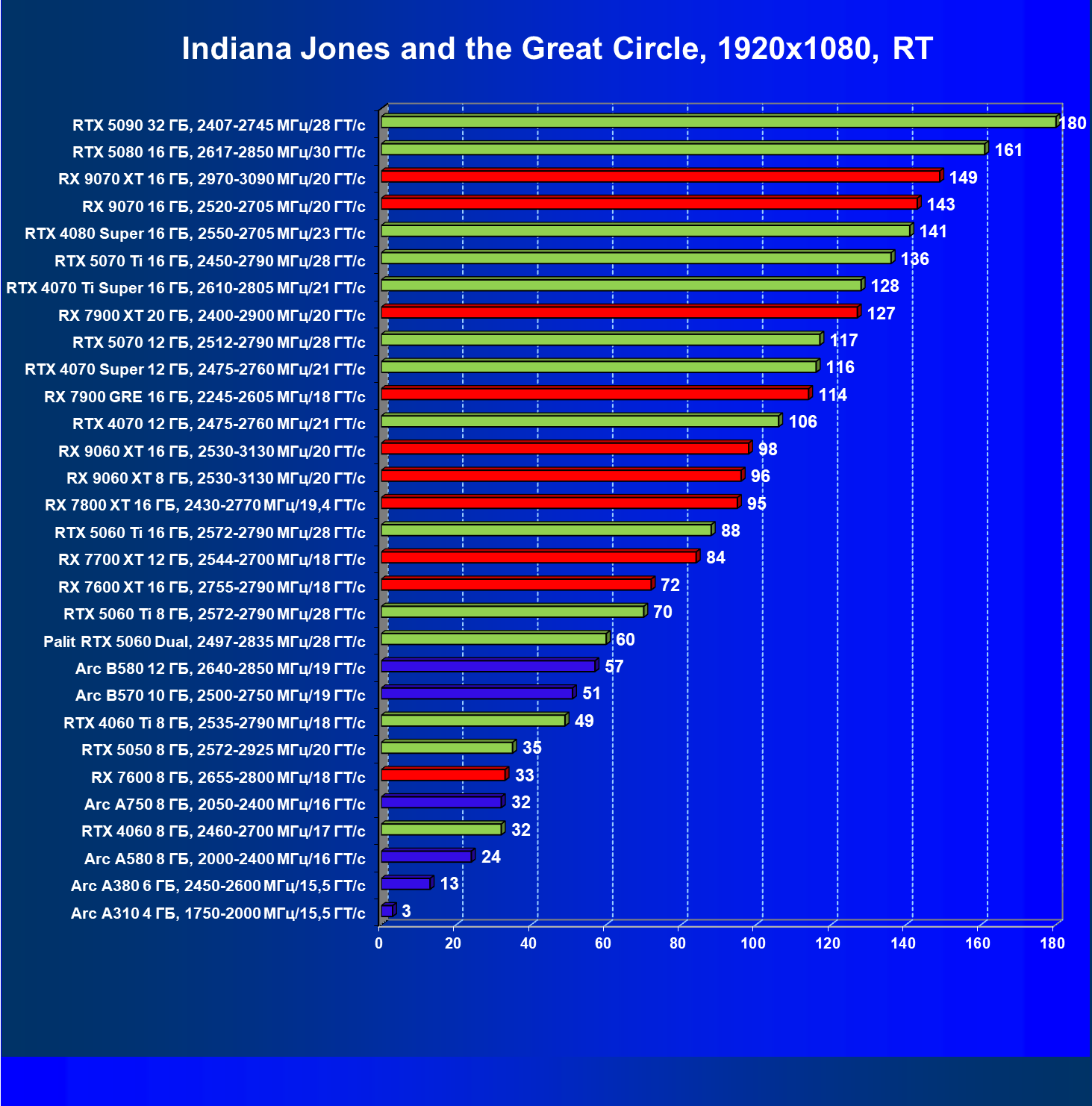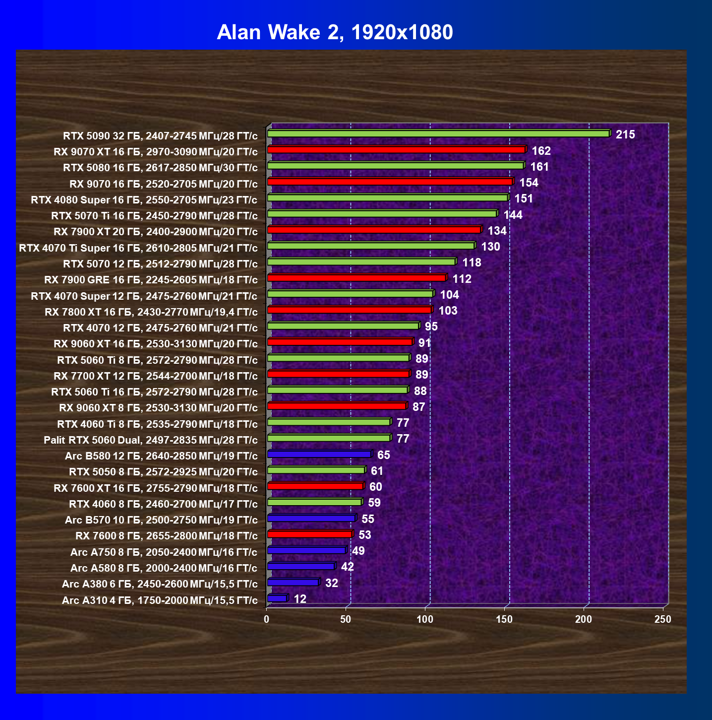 Мы видим, что GeForce RTX 5060 намного быстрее, чем Radeon RX 7600 XT (при этом последний дороже), также опережает GeForce RTX 4060 Ti, Arc B580 (однако последний сильно дешевле).
