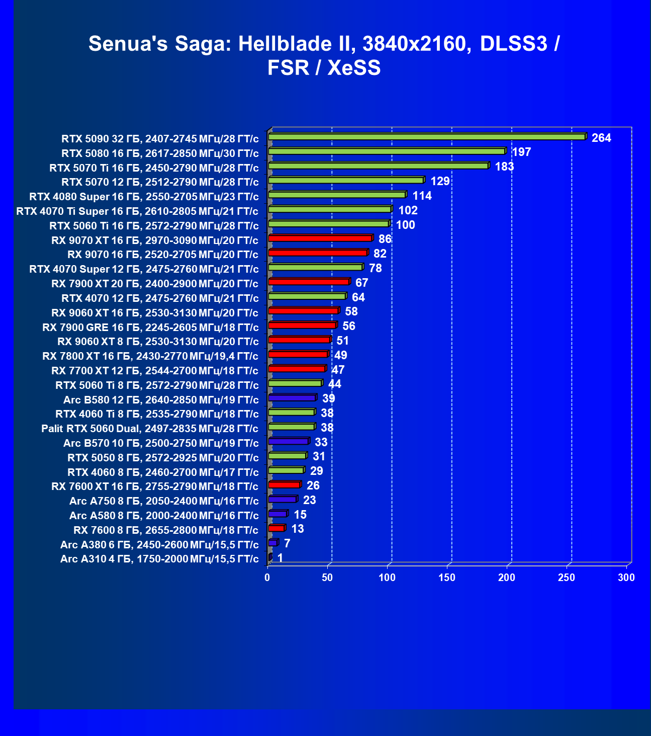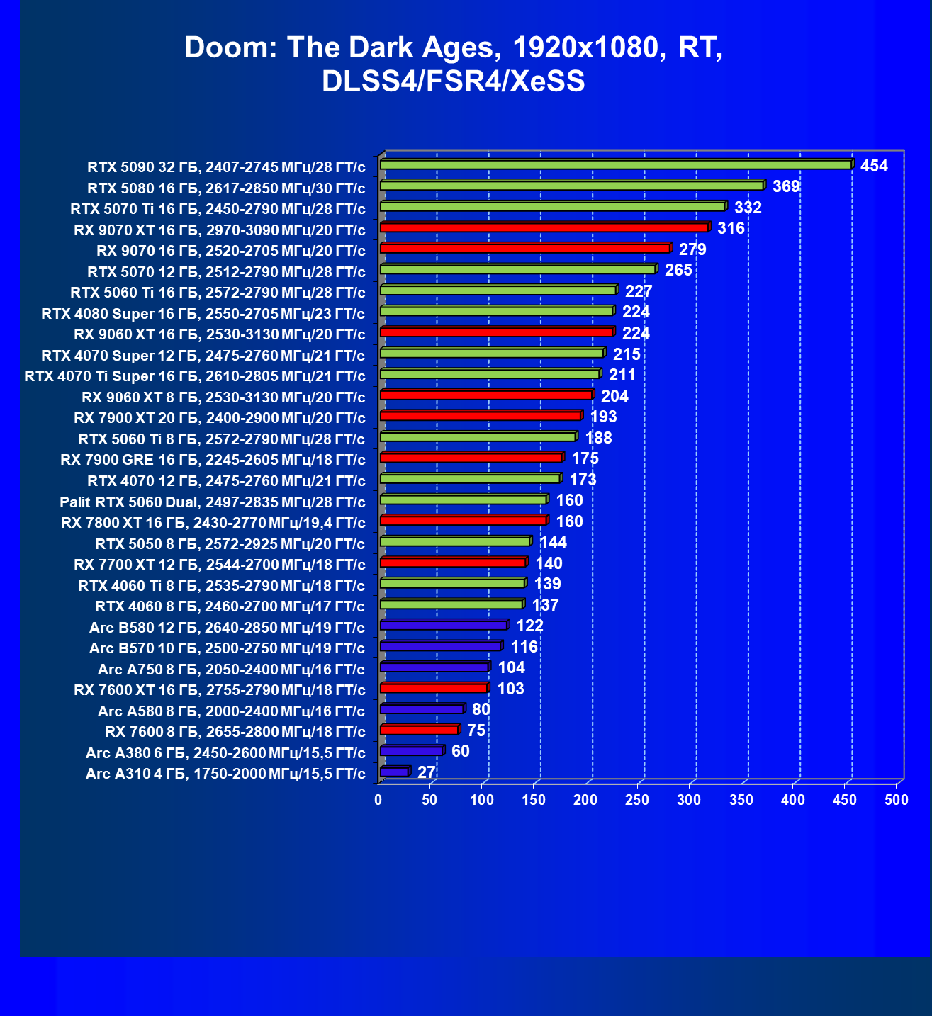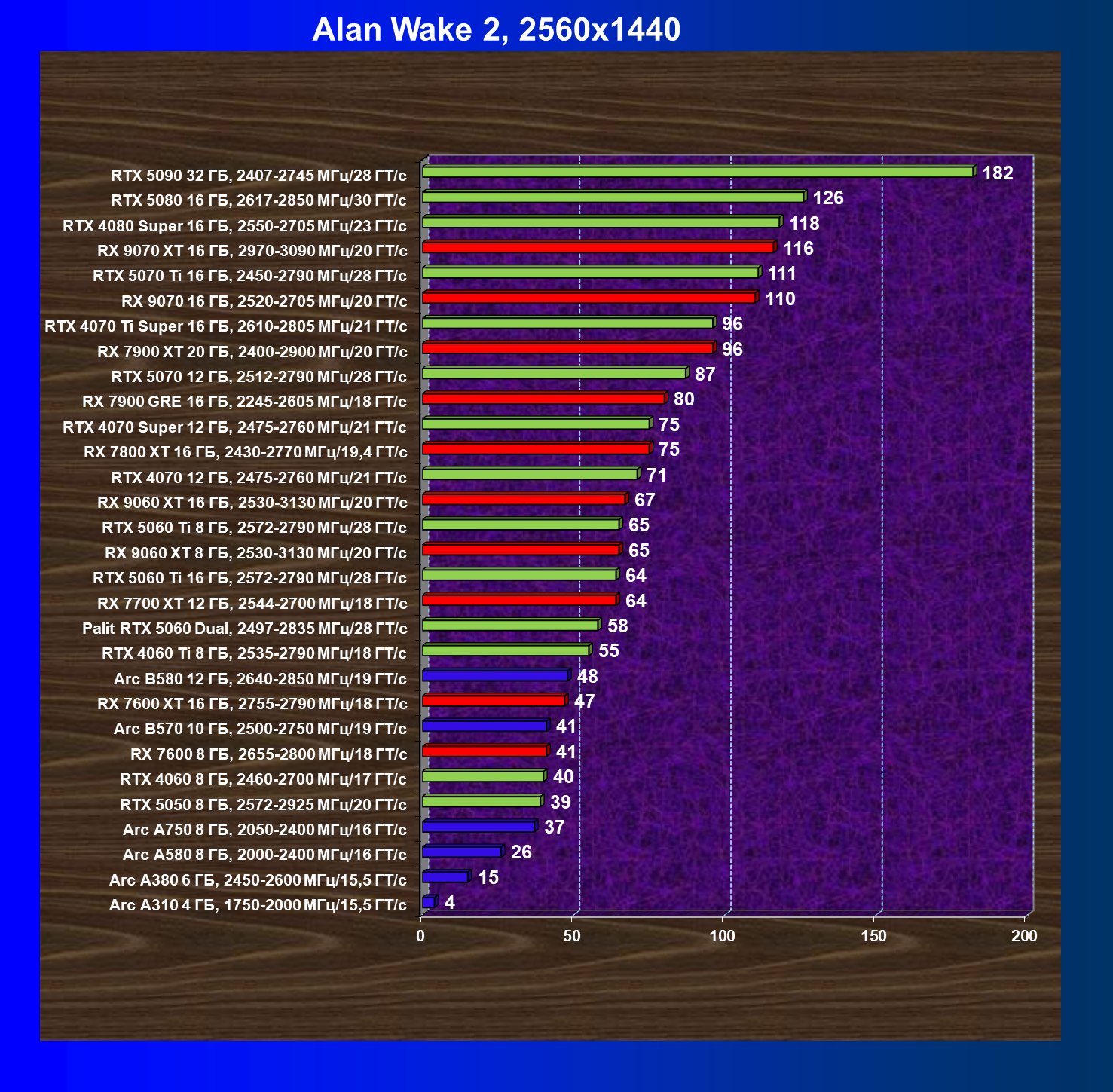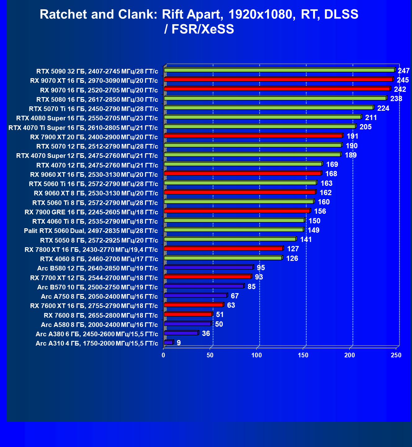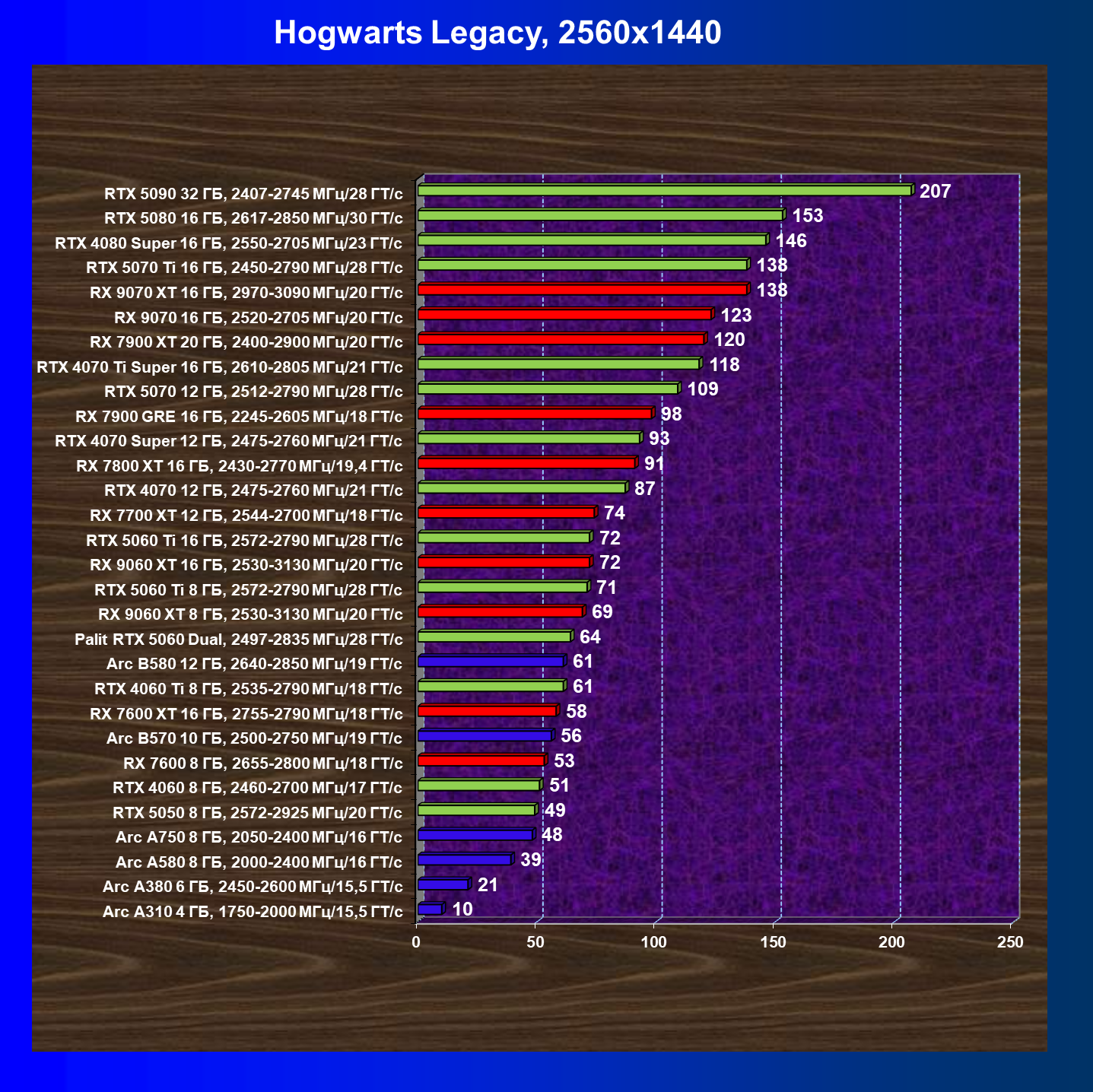 Мы видим, что GeForce RTX 5060 намного быстрее, чем Radeon RX 7600 XT (при этом последний дороже), также опережает GeForce RTX 4060 Ti, Arc B580 (однако последний сильно дешевле).