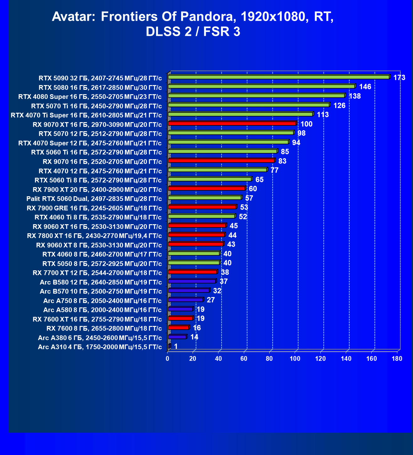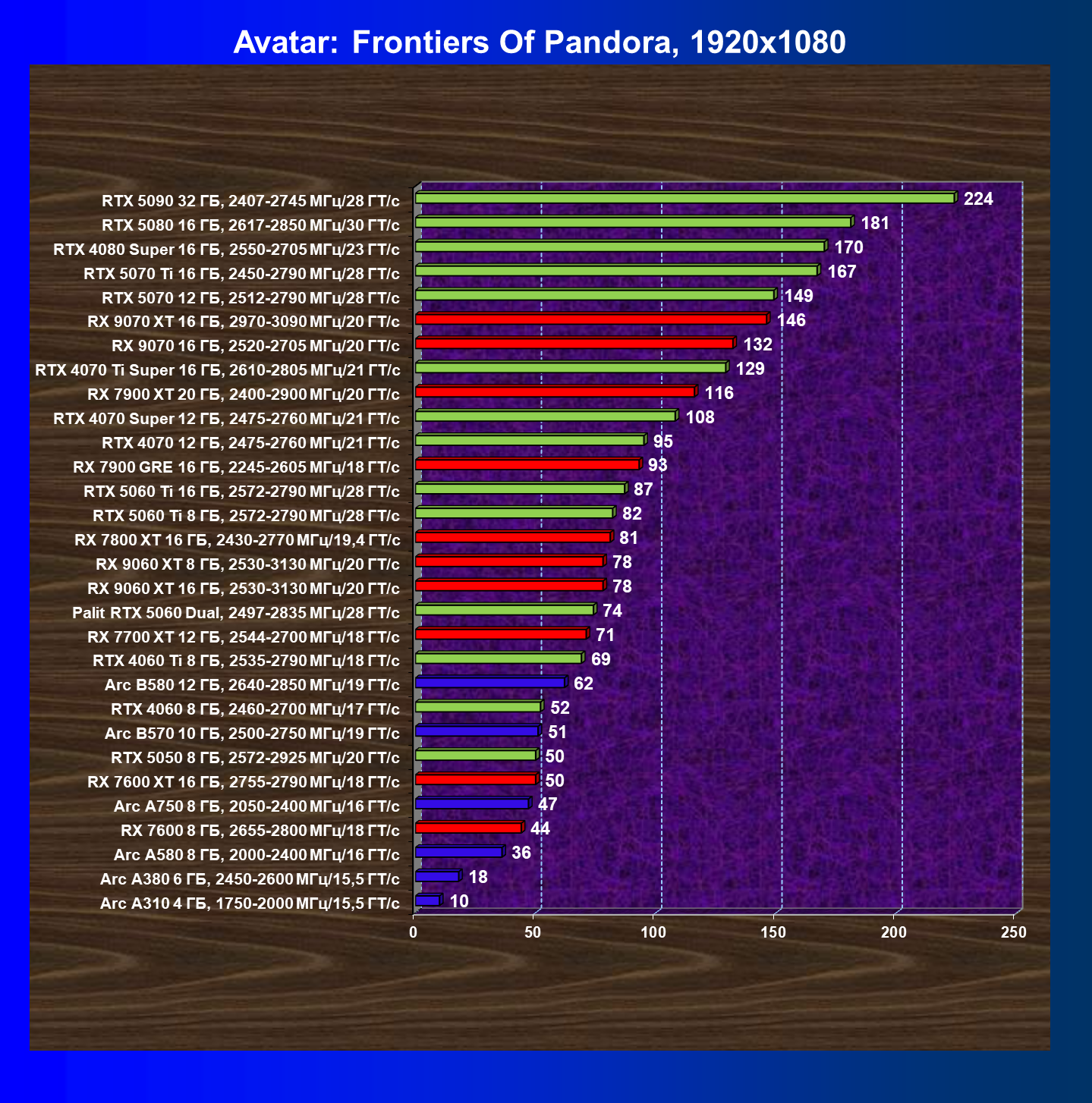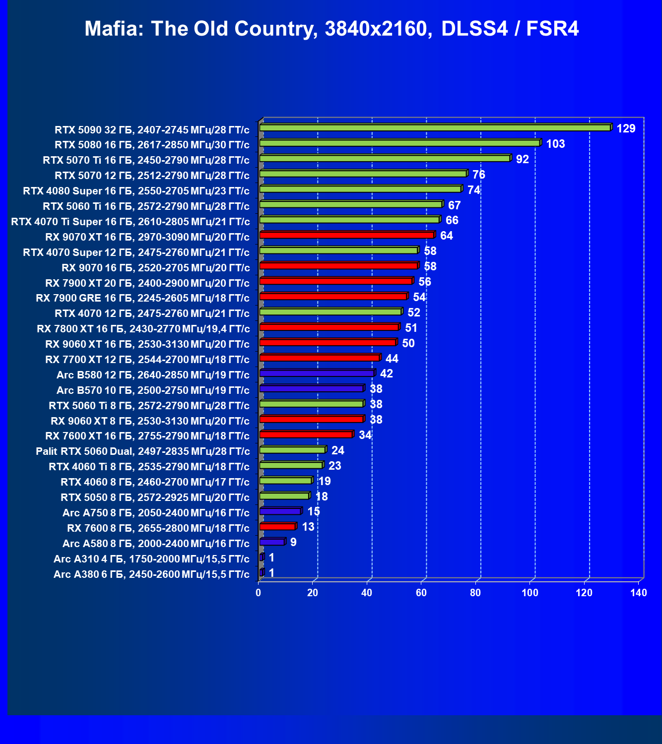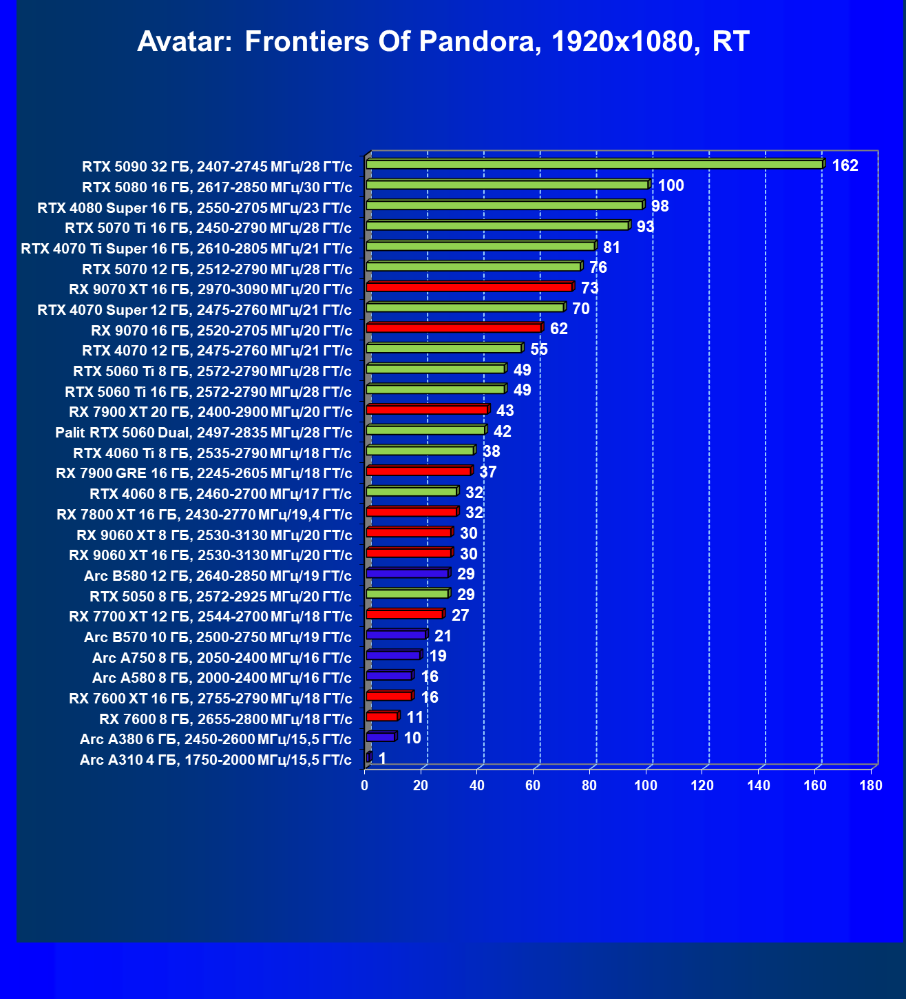 Мы видим, что GeForce RTX 5060 намного быстрее, чем Radeon RX 7600 XT (при этом последний дороже), также опережает GeForce RTX 4060 Ti, Arc B580 (однако последний сильно дешевле).