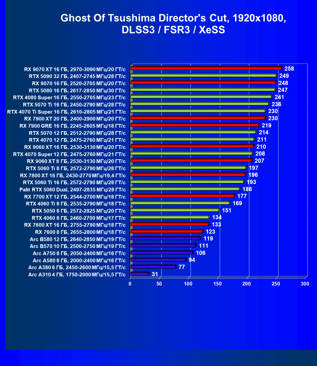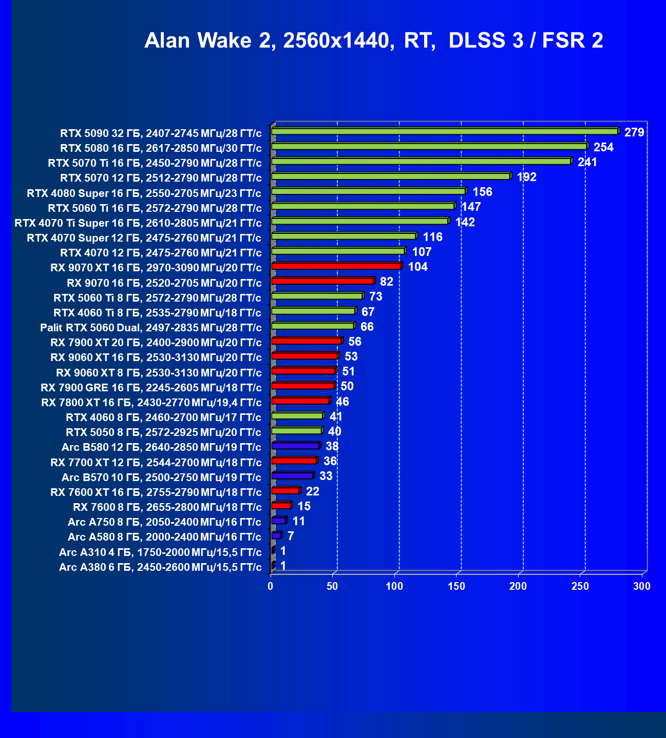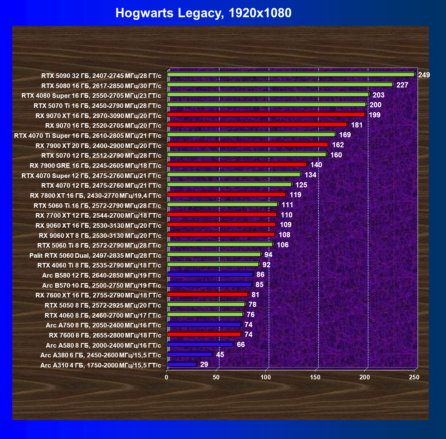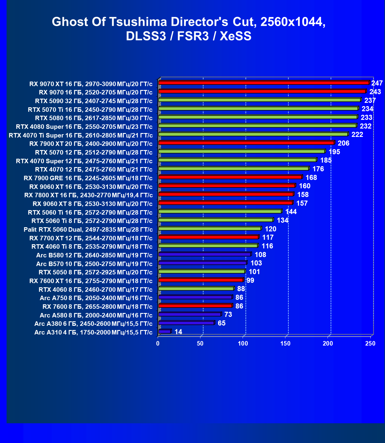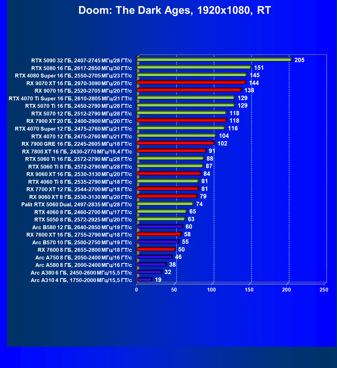 Мы видим, что GeForce RTX 5060 намного быстрее, чем Radeon RX 7600 XT (при этом последний дороже), также опережает GeForce RTX 4060 Ti, Arc B580 (однако последний сильно дешевле).