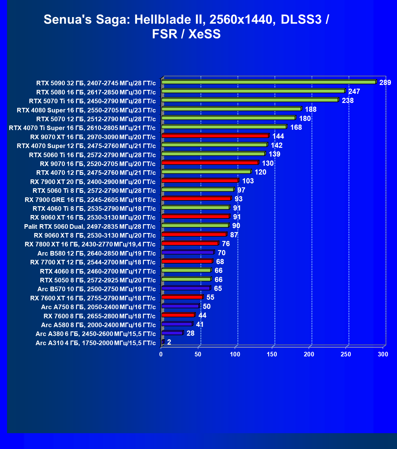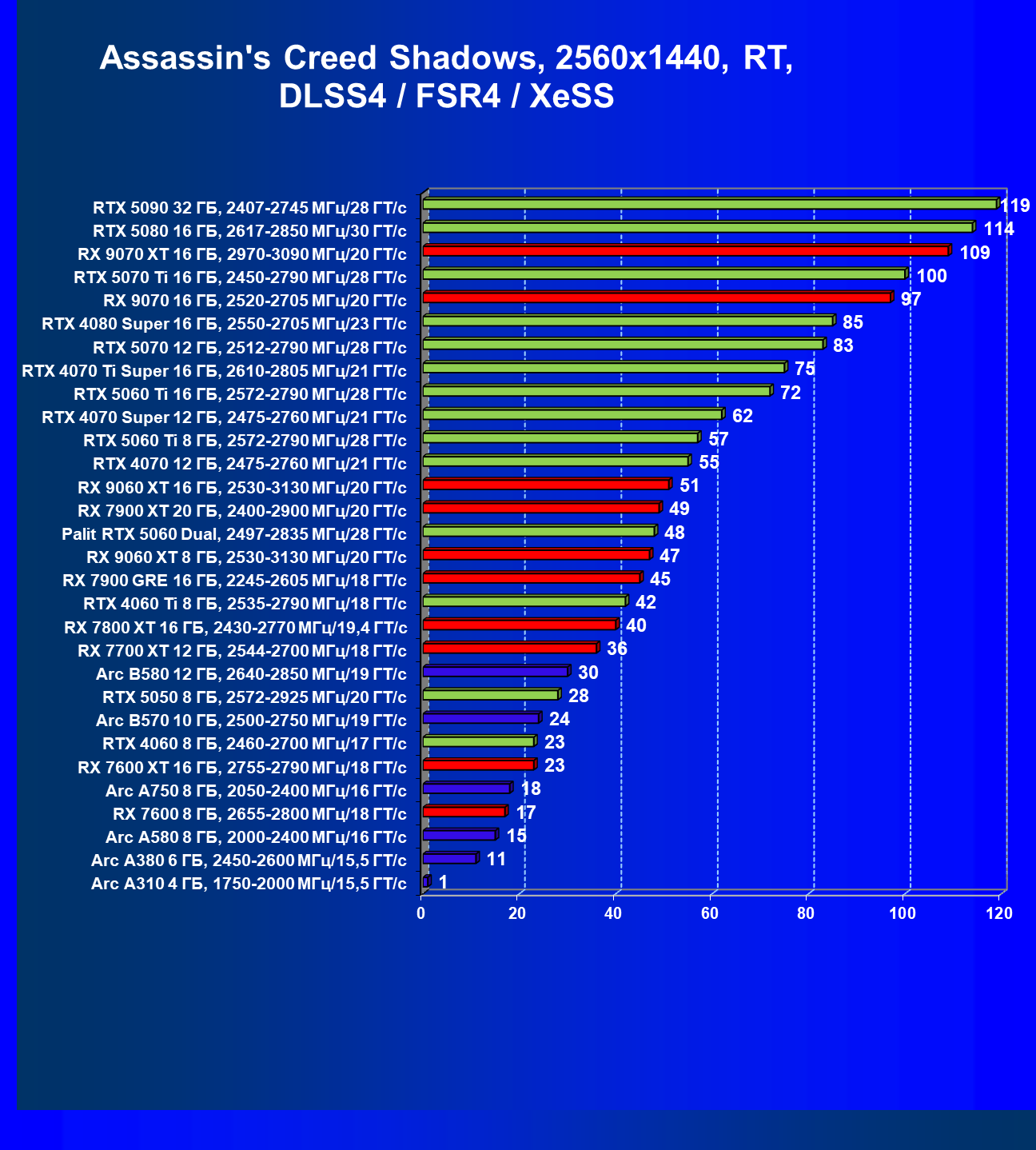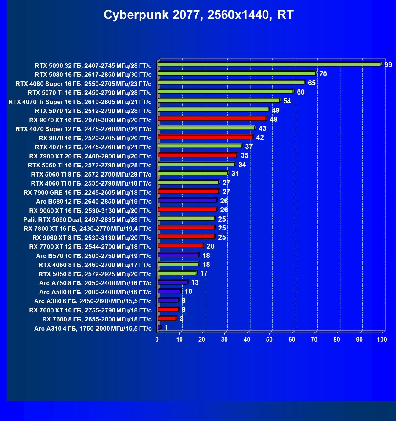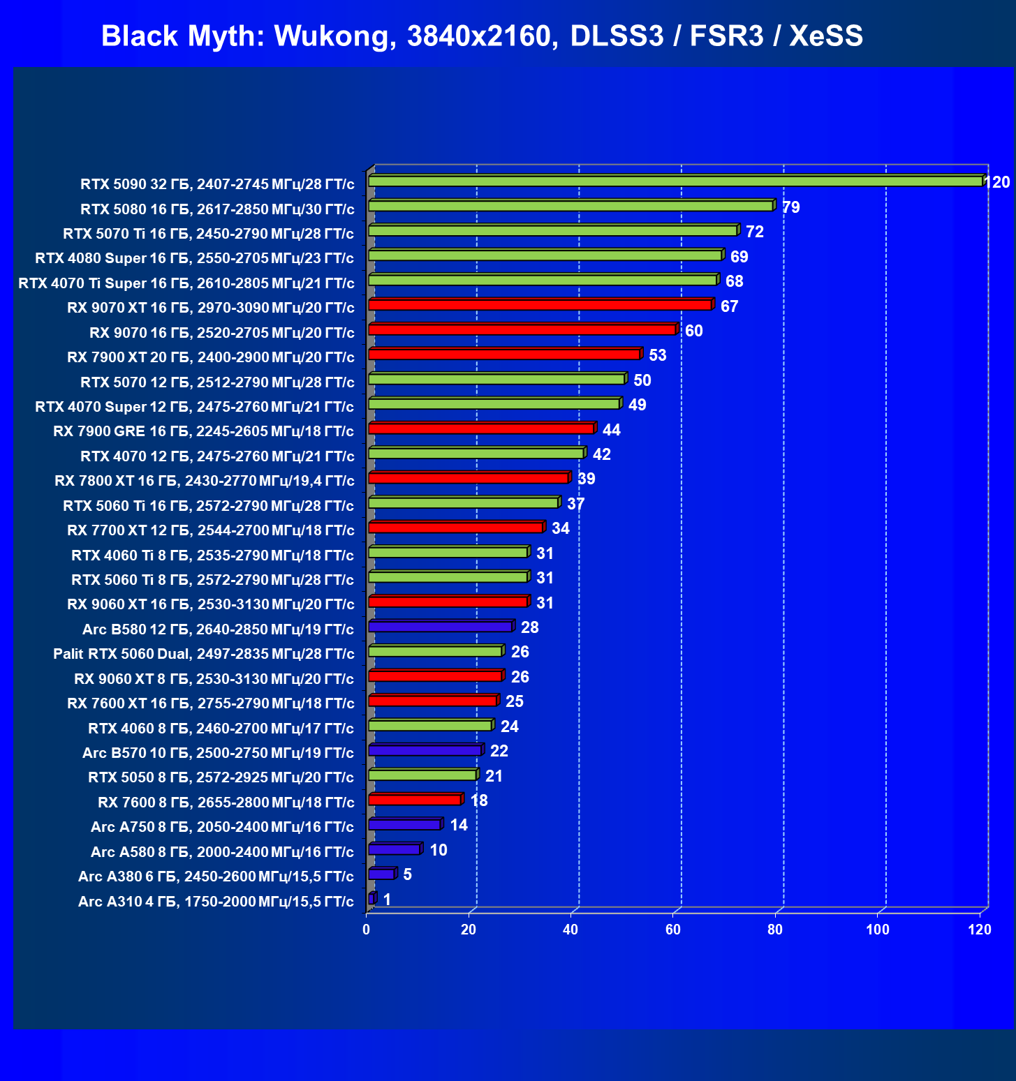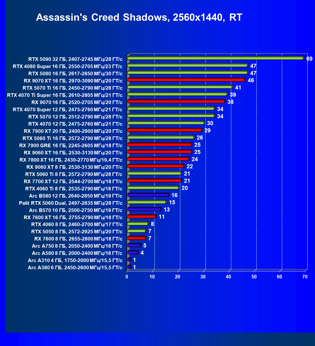 | 21 | Arc B580 12 ГБ, 2640—2850 МГц/19 ГТ/с | 510 | 170 | 30 000 |