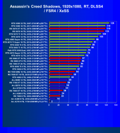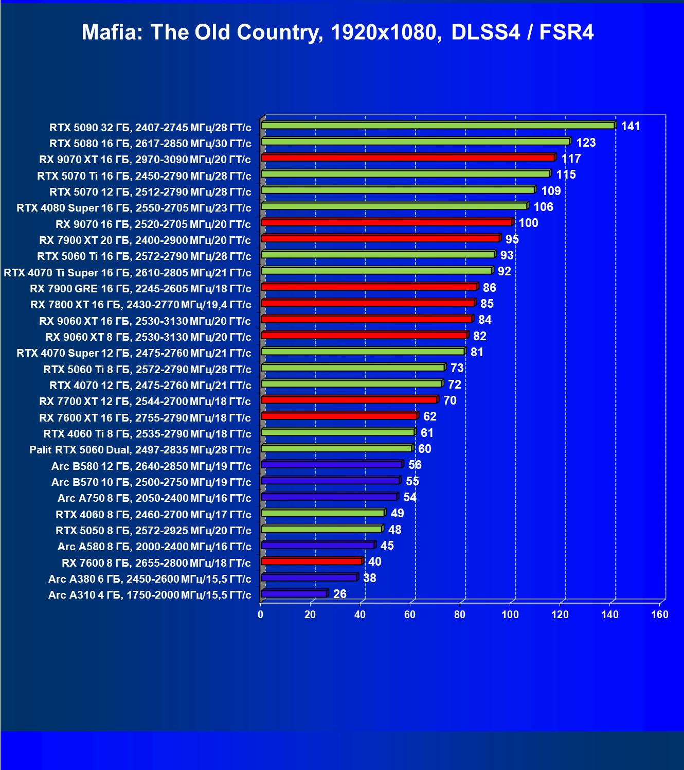 Ситуация почти аналогичная (в нашем наборе тестов пока игр с поддержкой FSR 4 немного (а это вид апскейлинга — главный козырь семейства Radeon RX 9xxx), а поддержка DLSS 4.* — более широкая, поэтому и здесь RTX 5060 опередил соперника из стана AMD.