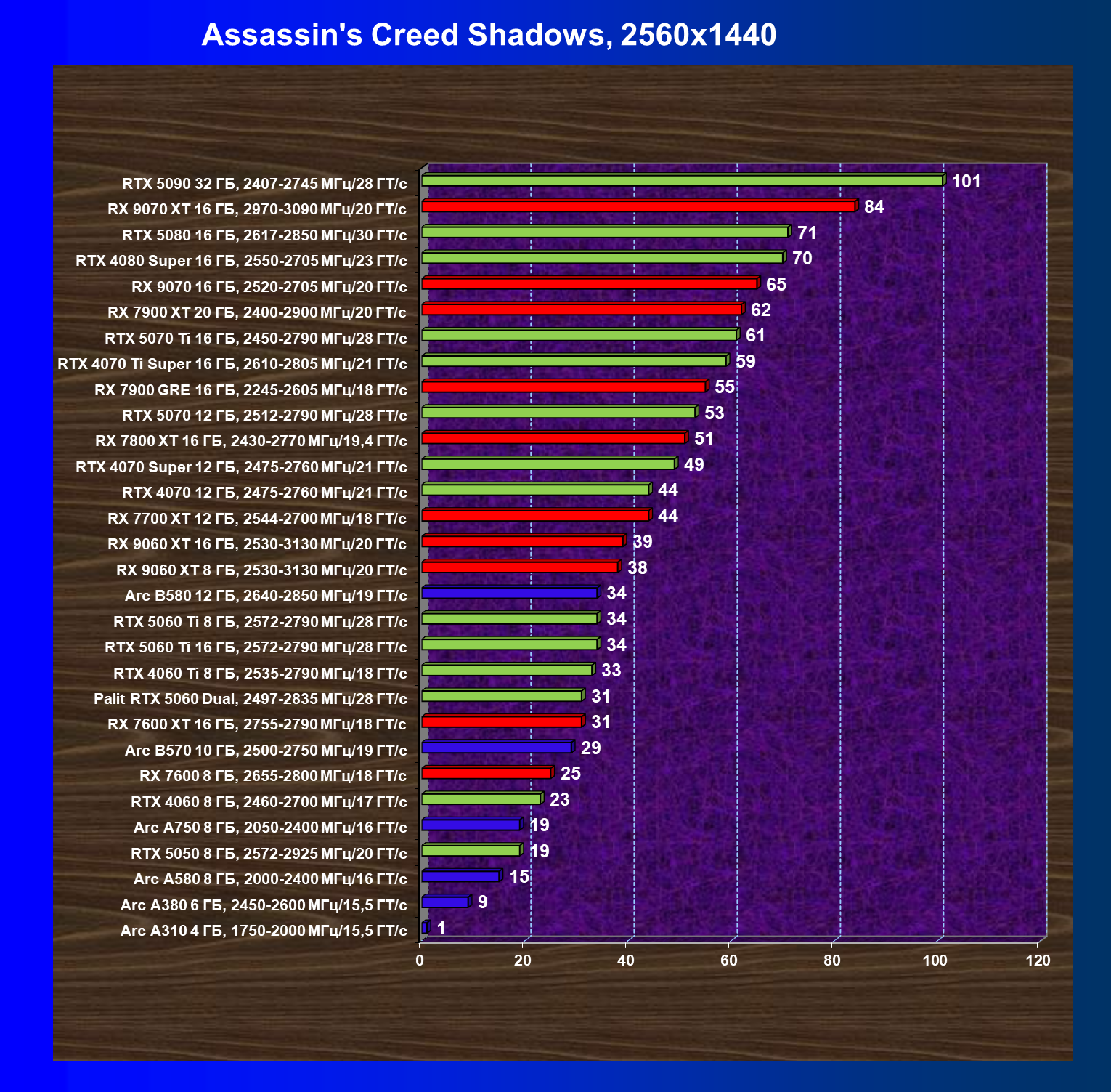 | 16 | RX 9060 XT 8 ГБ, 2530—3130 МГц/20 ГТ/с | 657 | 160 | 41 000 |