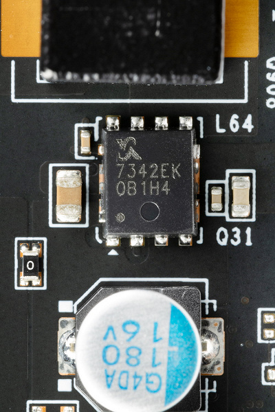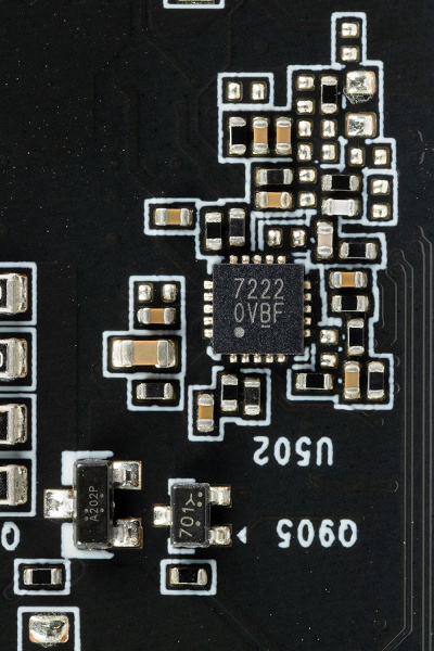 Питанием микросхем памяти управляет ШИМ-контроллер GS7222TQ (Niko Semi). Он также расположен на оборотной стороне платы.