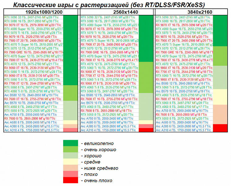 В настоящее время Radeon RX 9060 XT (8 ГБ) весьма подорожал, поэтому с первого места (что держал в конце 2025 года) перешел на четвертой. А RTX 5060 оказался в лидерах в классических играх.