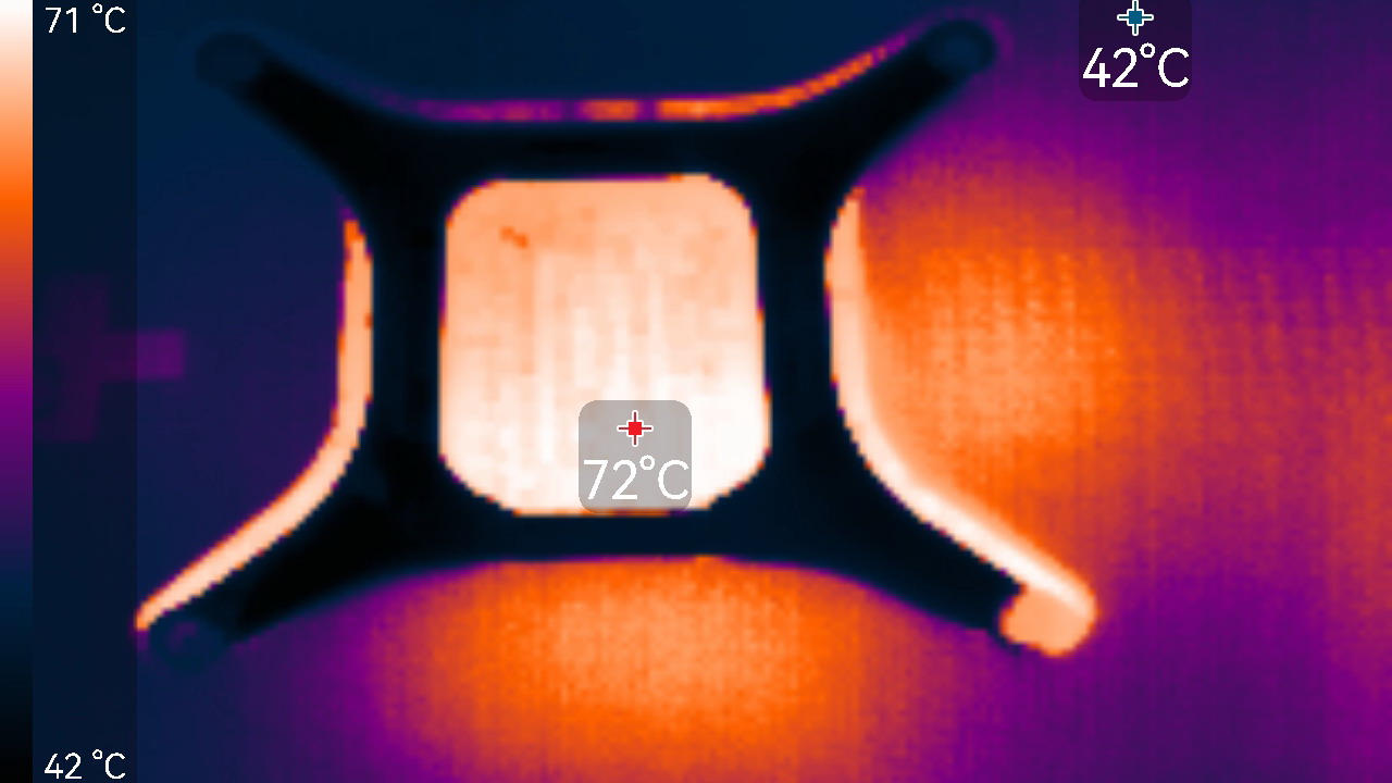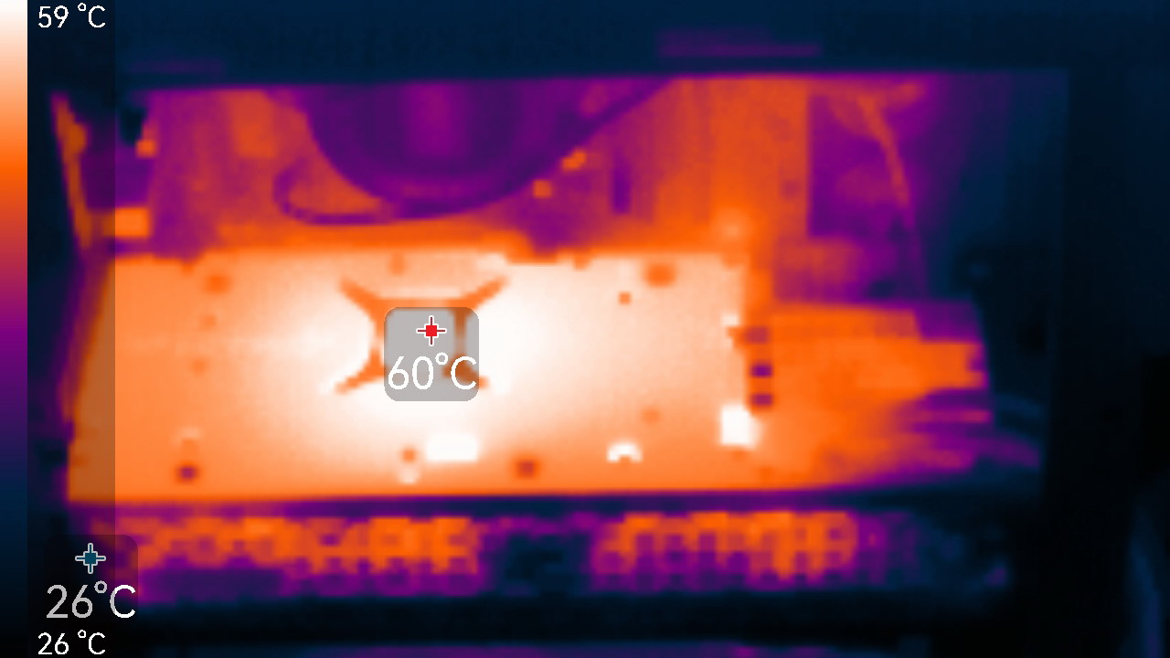 После прогона под нагрузкой максимальная температура ядра не превысила 57 градусов (hot spot — 88 °C; допускается нагрев до 110 градусов), а микросхем памяти — 90 °C, что является хорошим результатом. Энергопотребление карты доходило до 331 Вт.