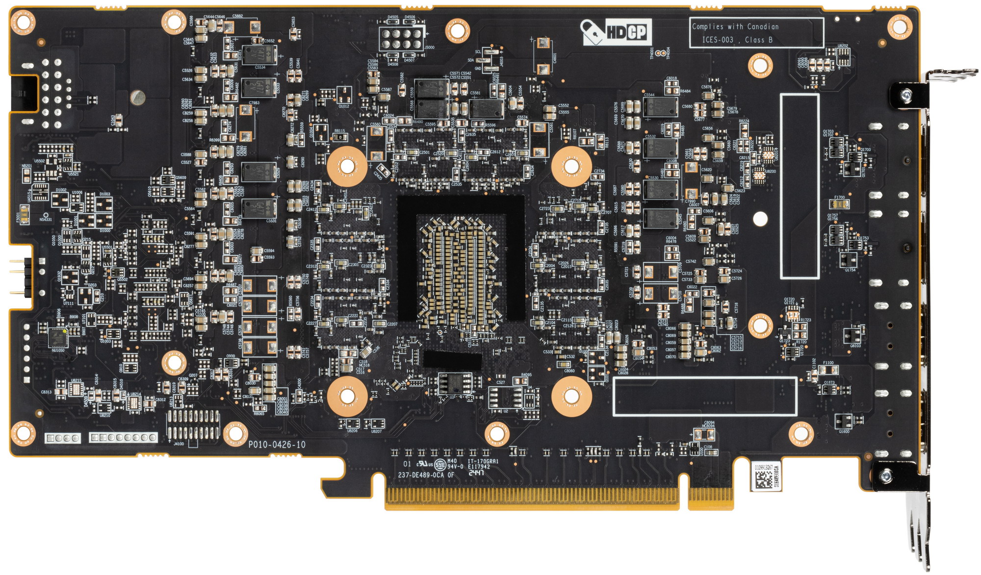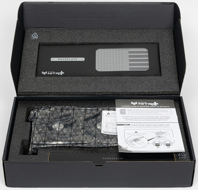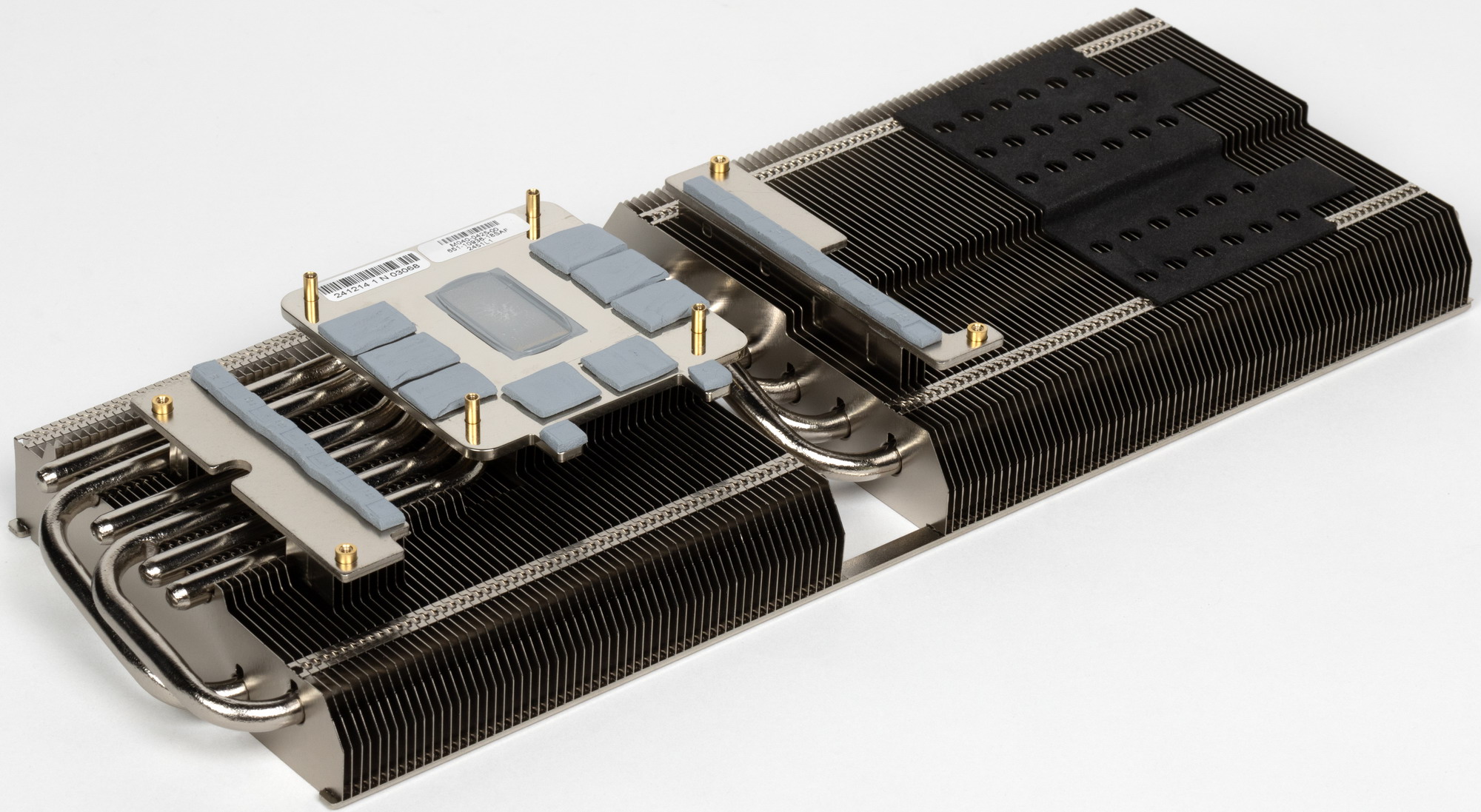 8 трубок припаяны к большой пластине, которая охлаждает ядро и микросхемы памяти. Для охлаждения преобразователей питания VRM имеются свои подошвы на радиаторе. Задних пластин две: несъемная пластина не только служит элементом защиты PCB, но и участвует в охлаждении тыльной стороны PCB через термопрокладки. Съемная пластина на магнитах крепится к предыдущей и имеет лишь эстетическое предназначение по скрытию кабель питания.