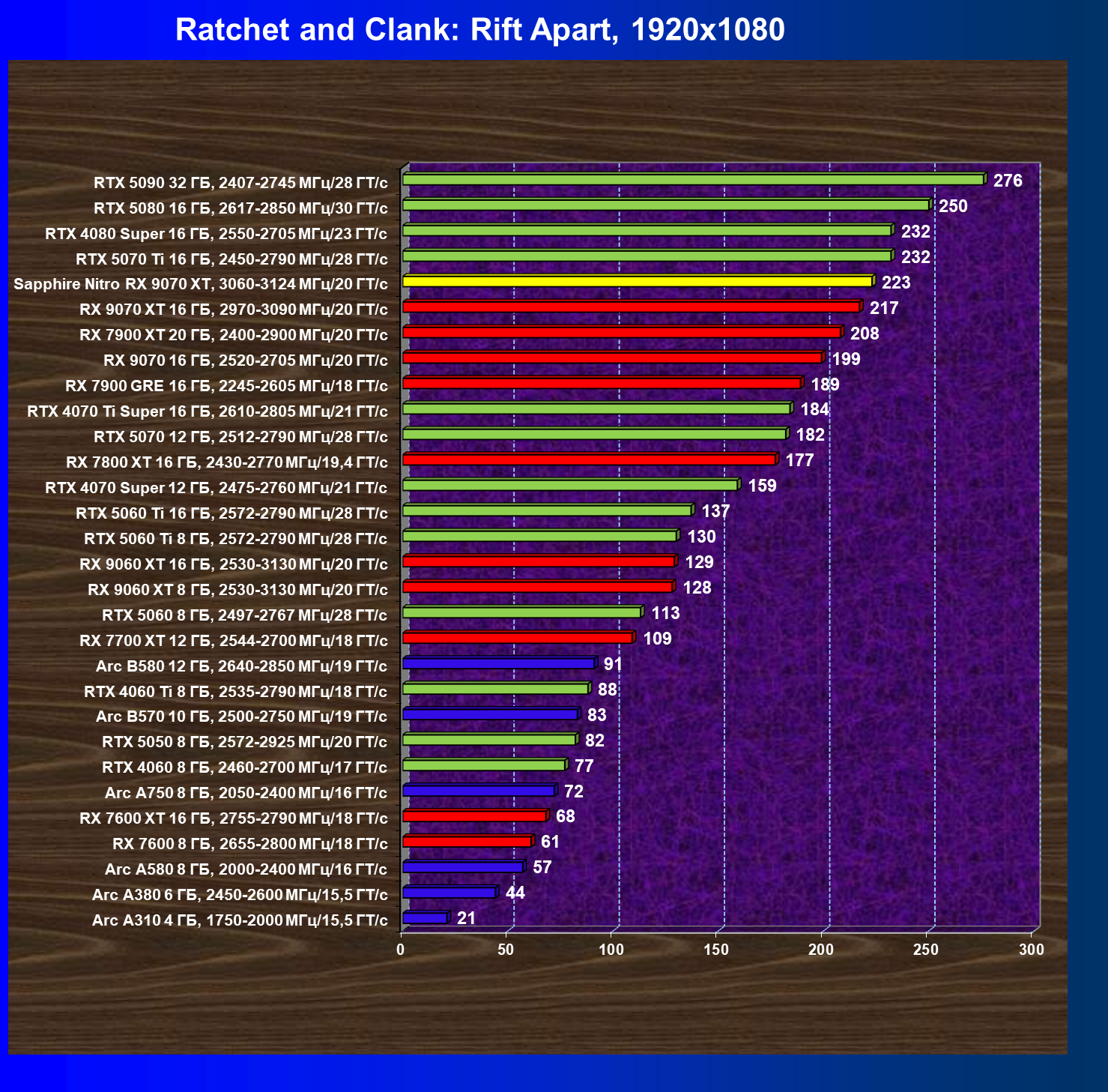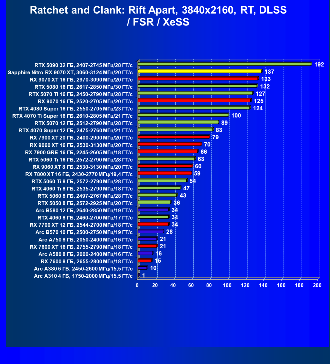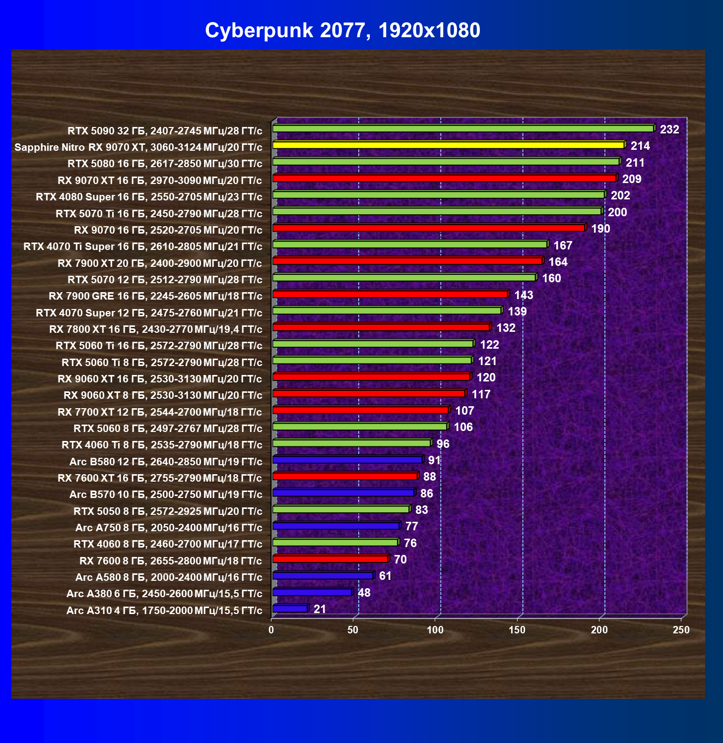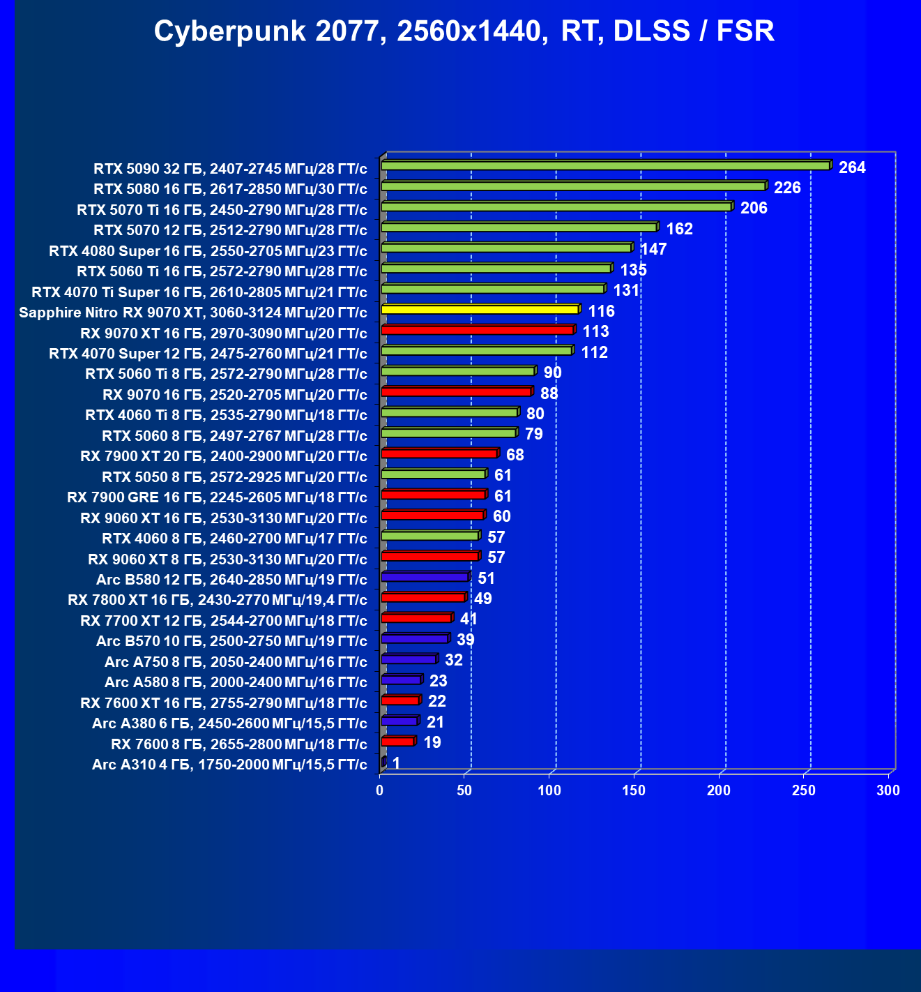 | 07 | Sapphire Nitro RX 9070 XT, 3060—3124 МГц/20 ГТ/с | 306 | 2482 | 81 000 |