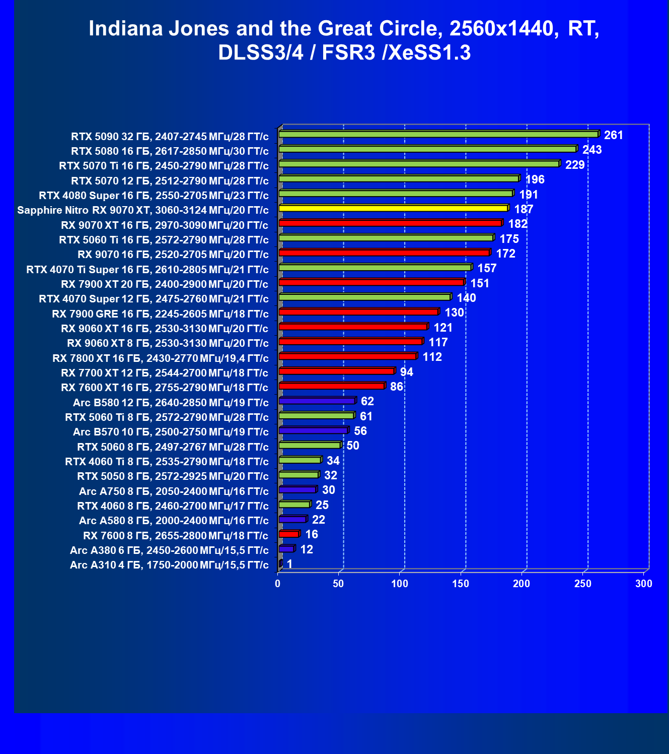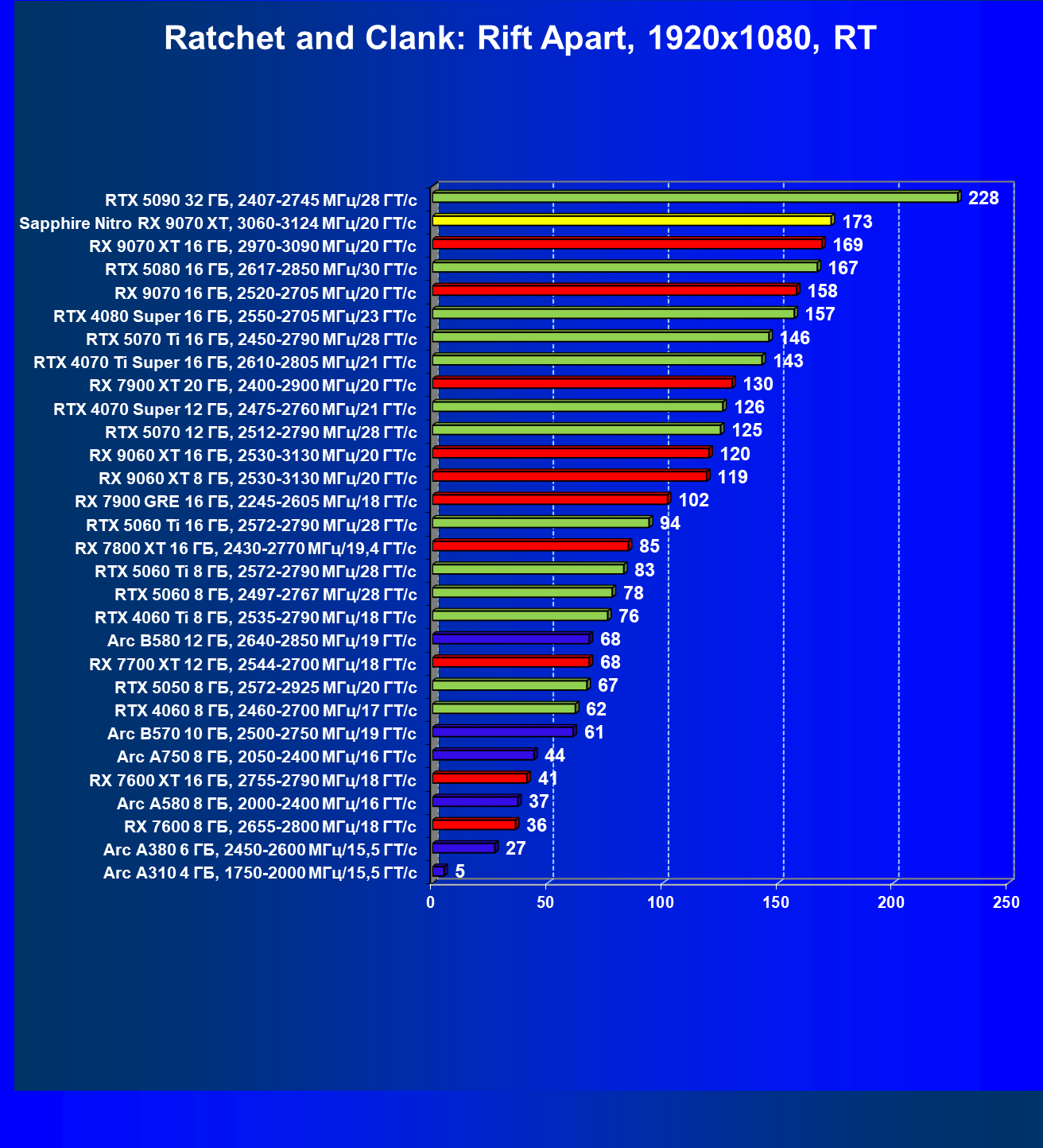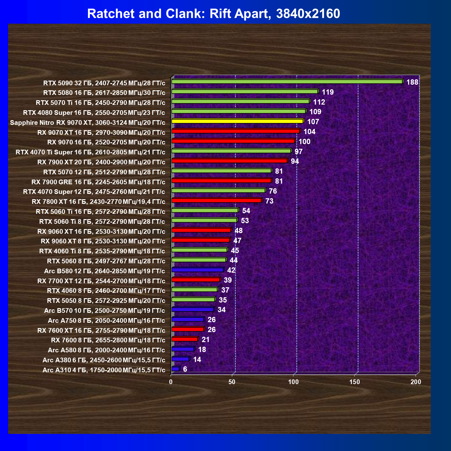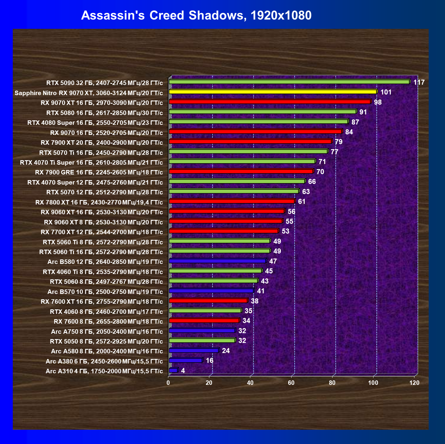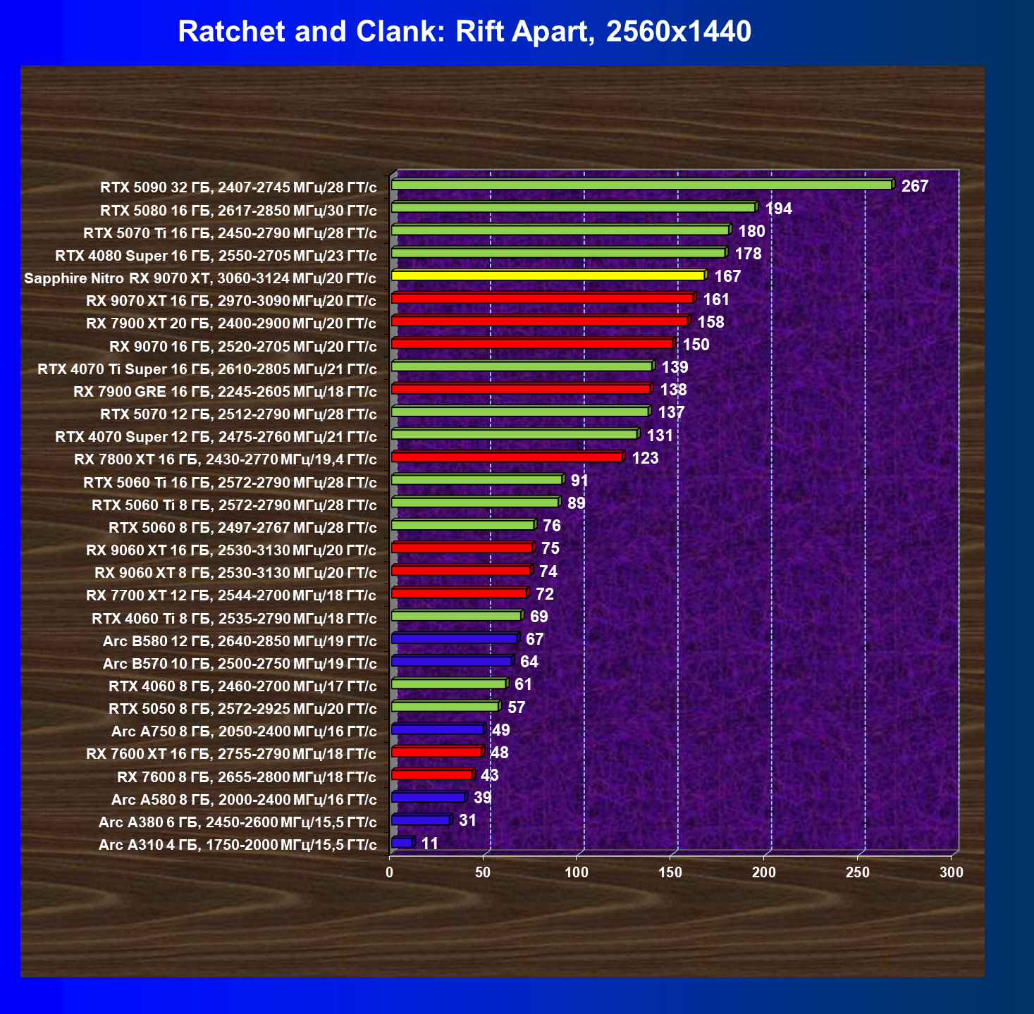 | 07 | Sapphire Nitro RX 9070 XT, 3060—3124 МГц/20 ГТ/с | 306 | 2482 | 81 000 |