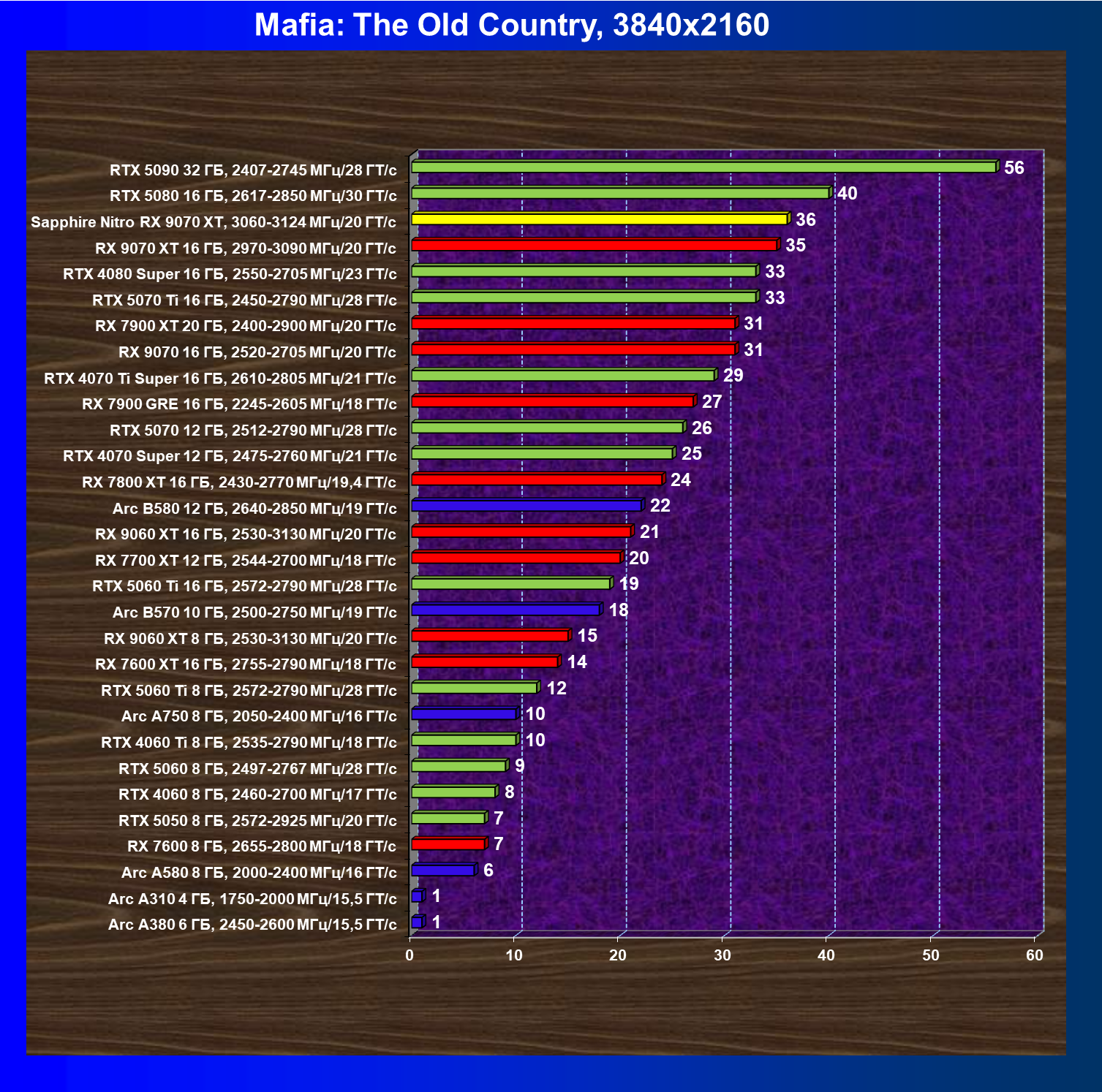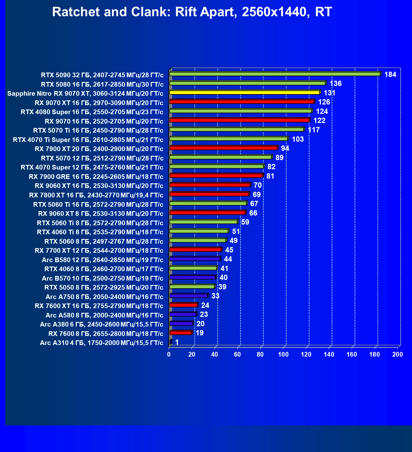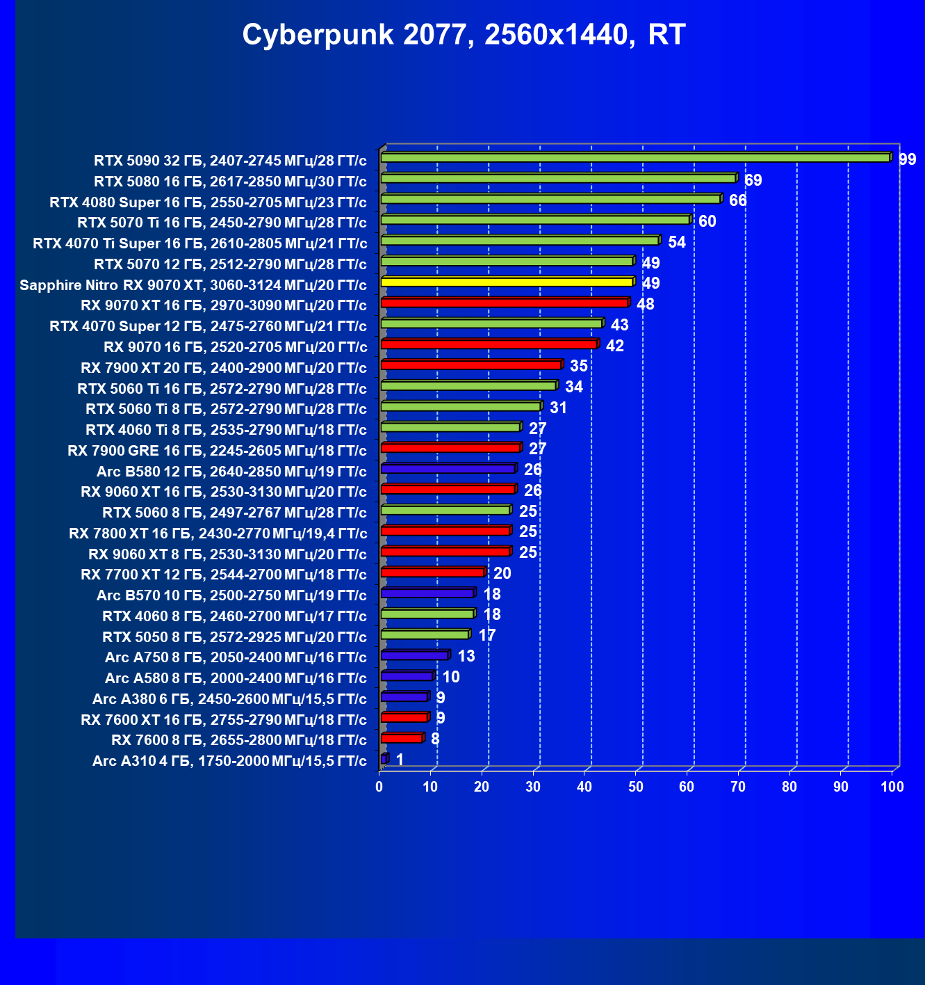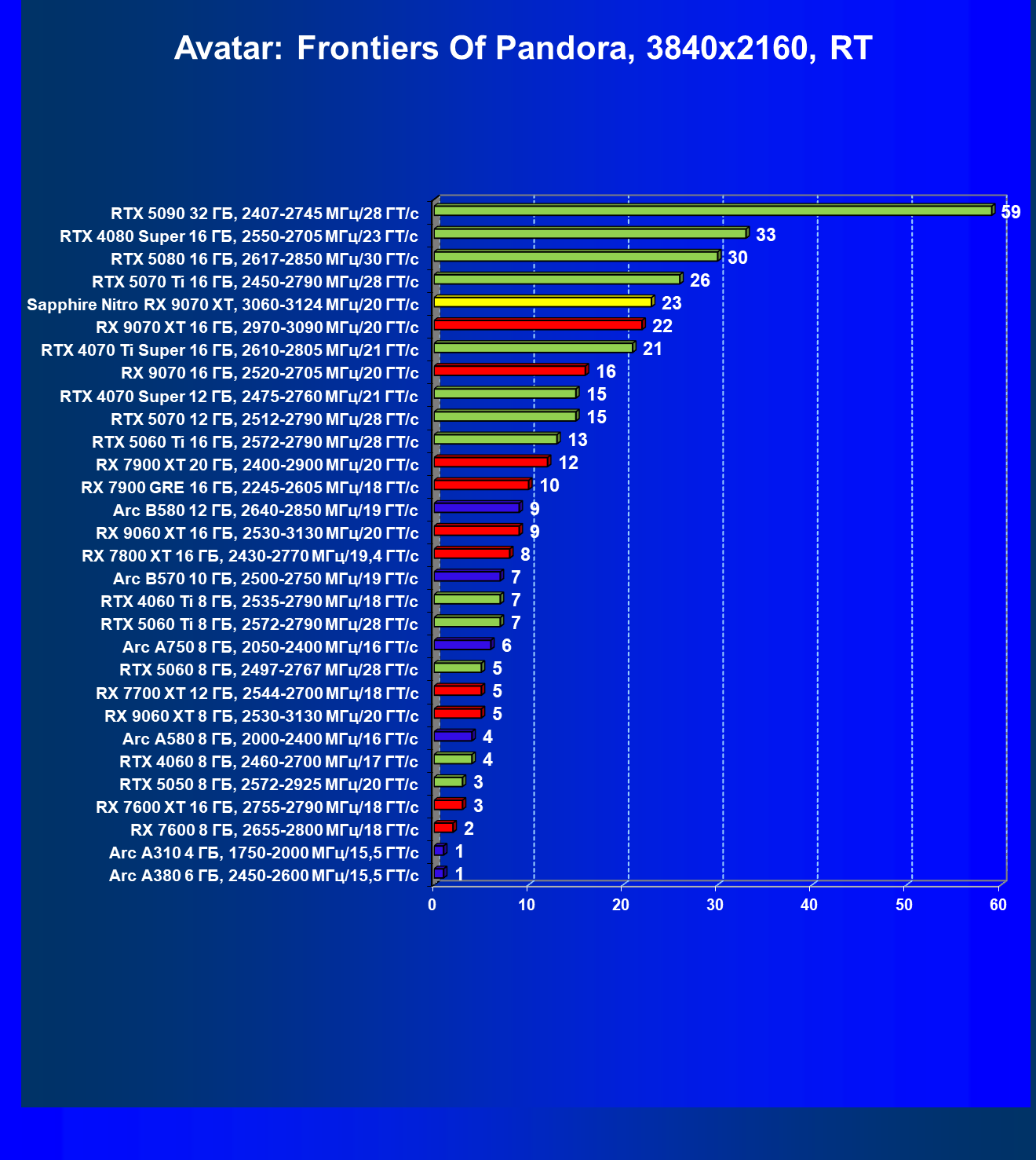 | 07 | Sapphire Nitro RX 9070 XT, 3060—3124 МГц/20 ГТ/с | 306 | 2482 | 81 000 |