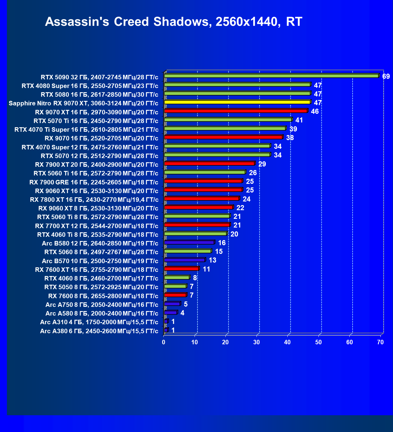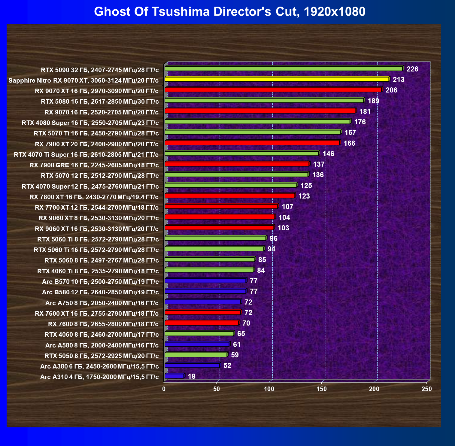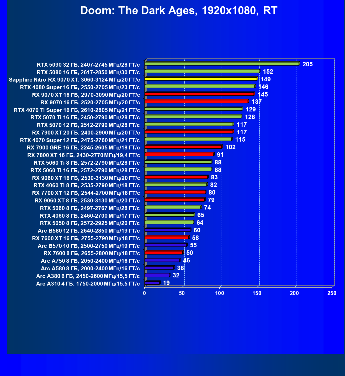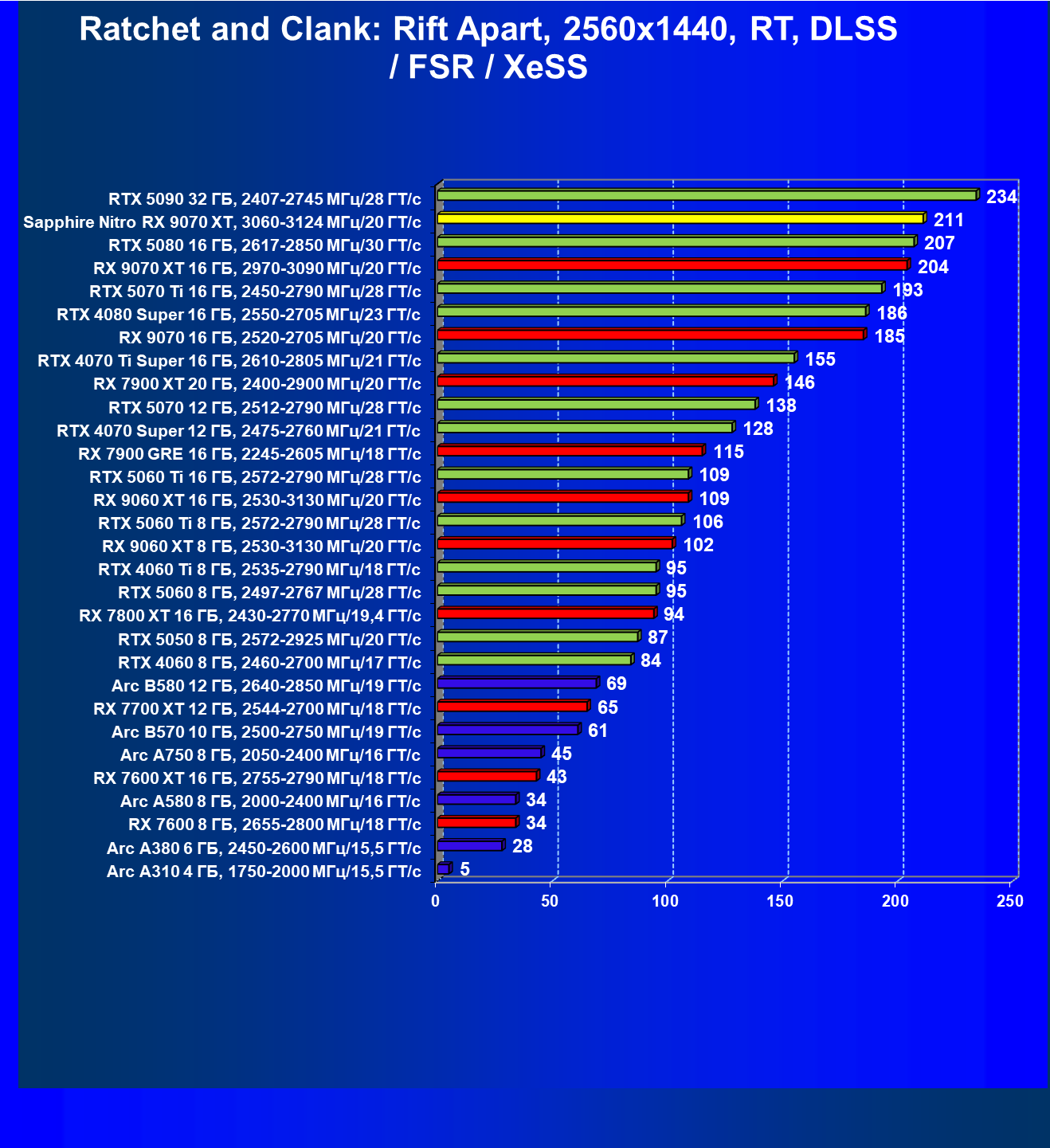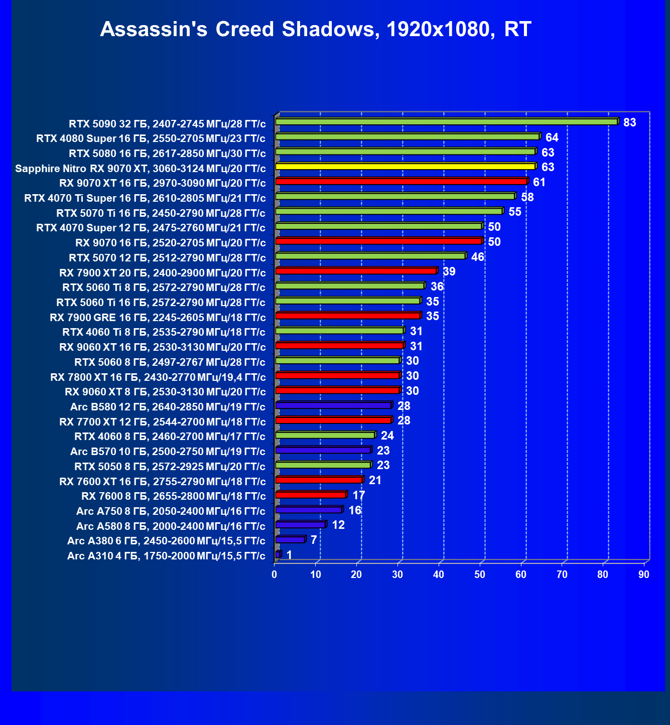 | 07 | Sapphire Nitro RX 9070 XT, 3060—3124 МГц/20 ГТ/с | 306 | 2482 | 81 000 |