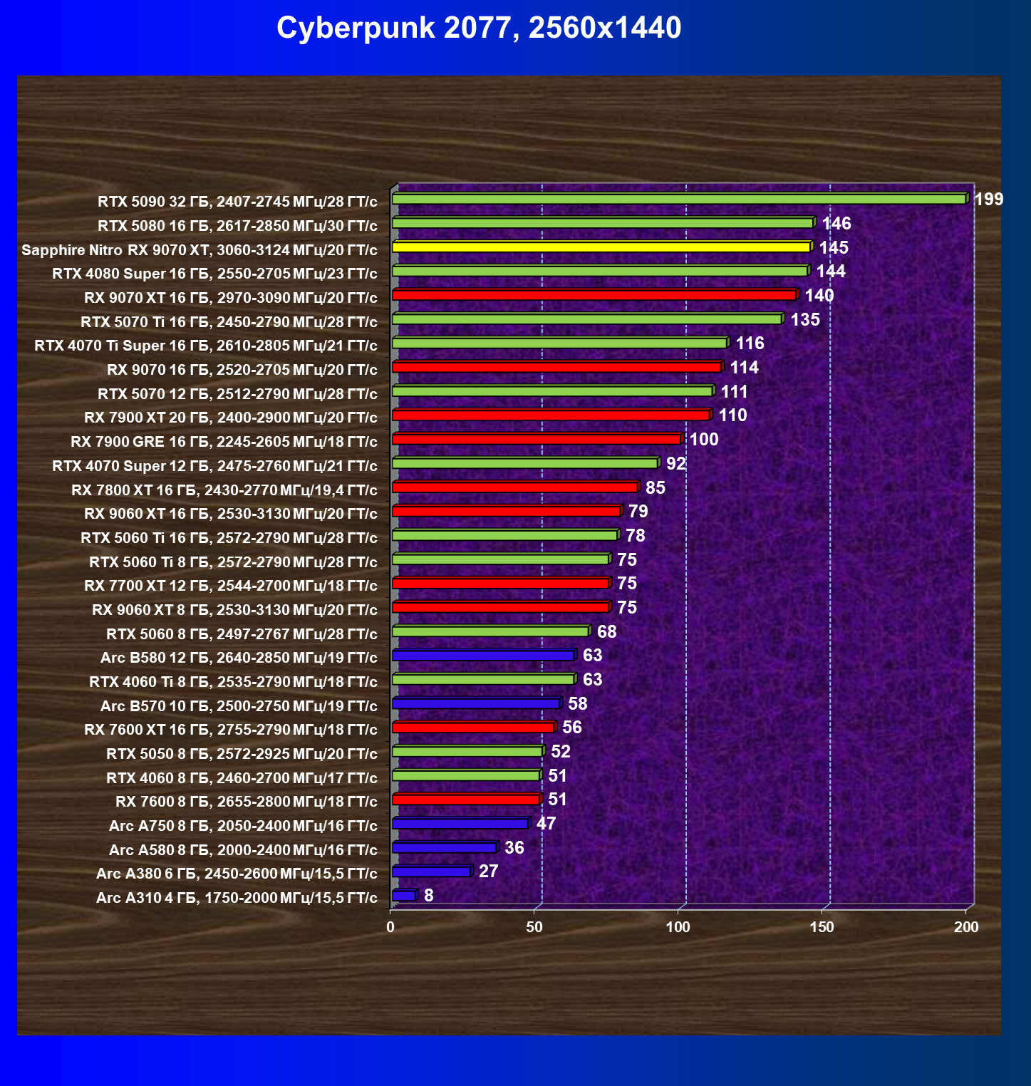 | 05 | RX 9070 XT 16 ГБ, 2970—3090 МГц/20 ГТ/с | 2402 | 308 | 78 000 |