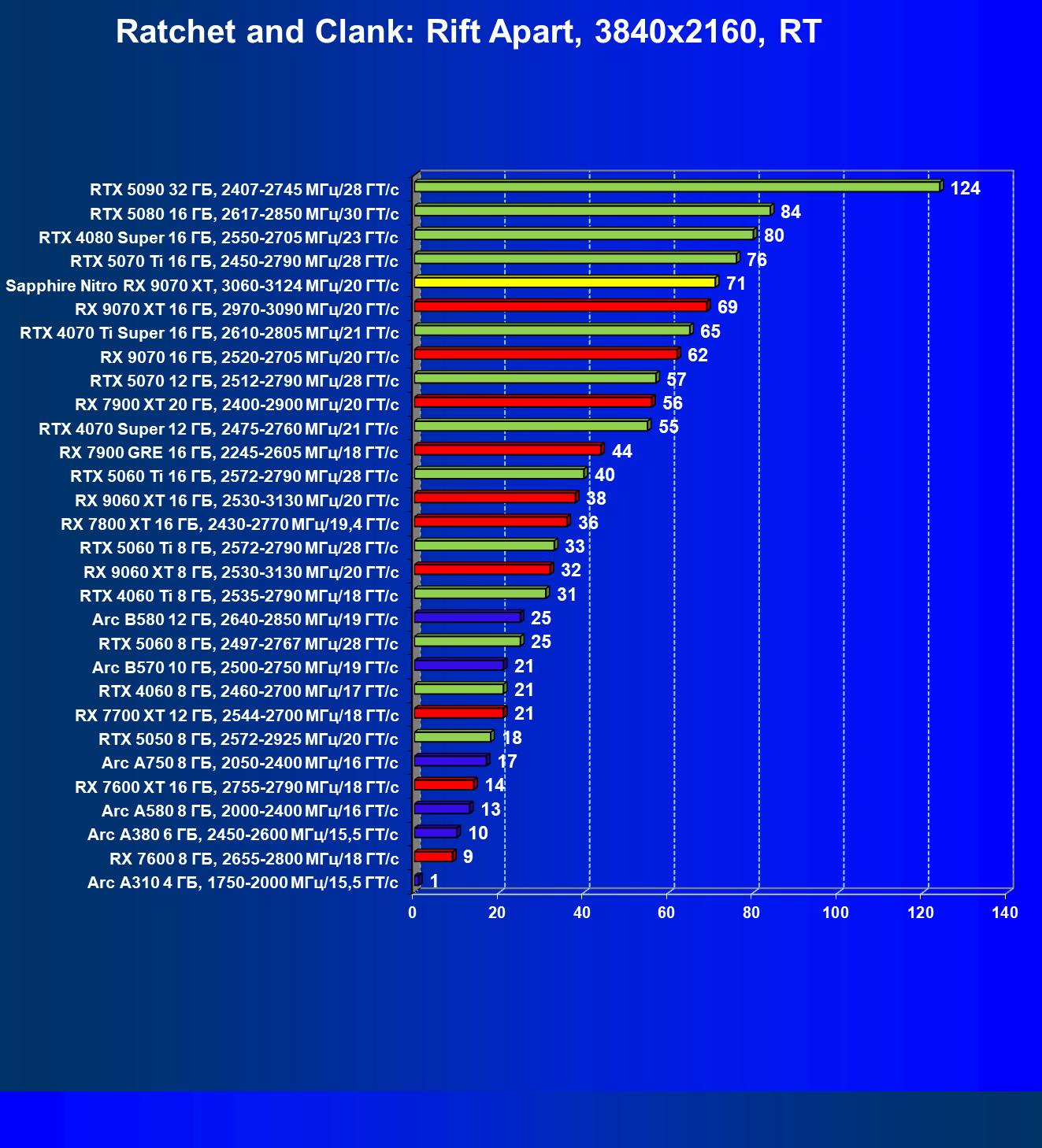 | 05 | Sapphire Nitro RX 9070 XT, 3060—3124 МГц/20 ГТ/с | 5175 | 639 | 81 000 |