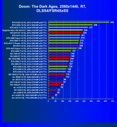 Рейтинг составлен по 10 тестам, в которых используется технология трассировки лучей и одновременно технология Nvidia DLSS, AMD FSR или Intel XeSS. Этот рейтинг нормирован по самому слабому ускорителю в данной группе — Arc A310 (то есть сочетание скорости и функций Arc A310 приняты за 100%).