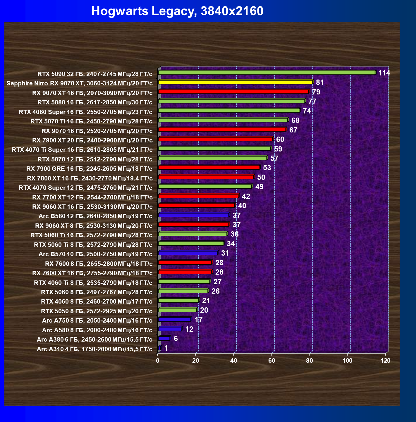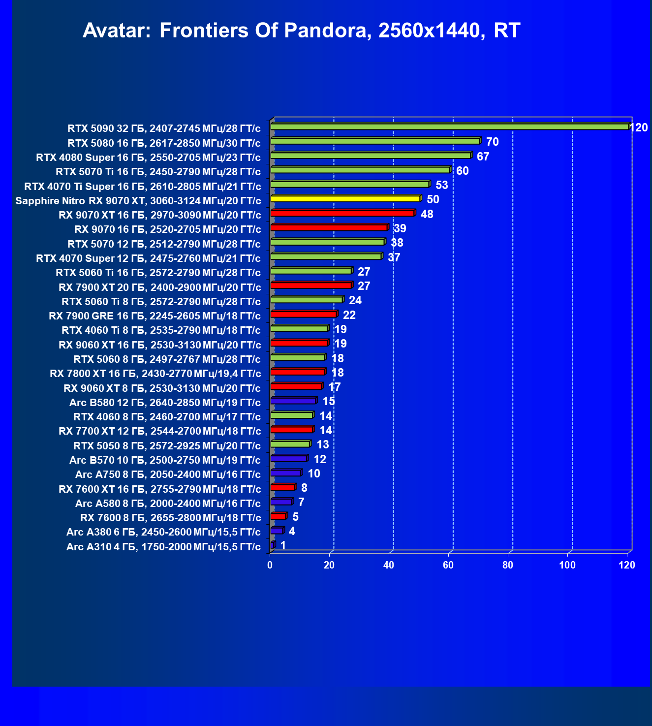 | 07 | RX 9070 XT 16 ГБ, 2970—3090 МГц/20 ГТ/с | 5031 | 645 | 78 000 |