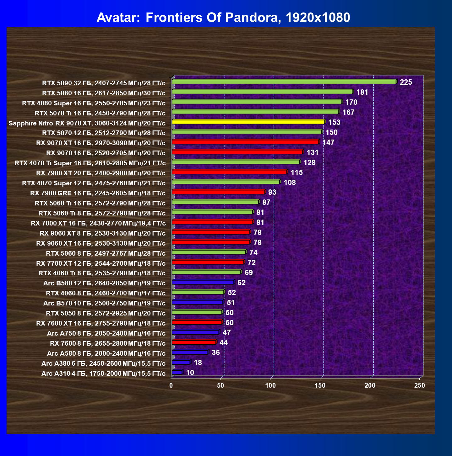 | 10 | RX 9070 XT 16 ГБ, 2970—3090 МГц/20 ГТ/с | 645 | 5031 | 78 000 |