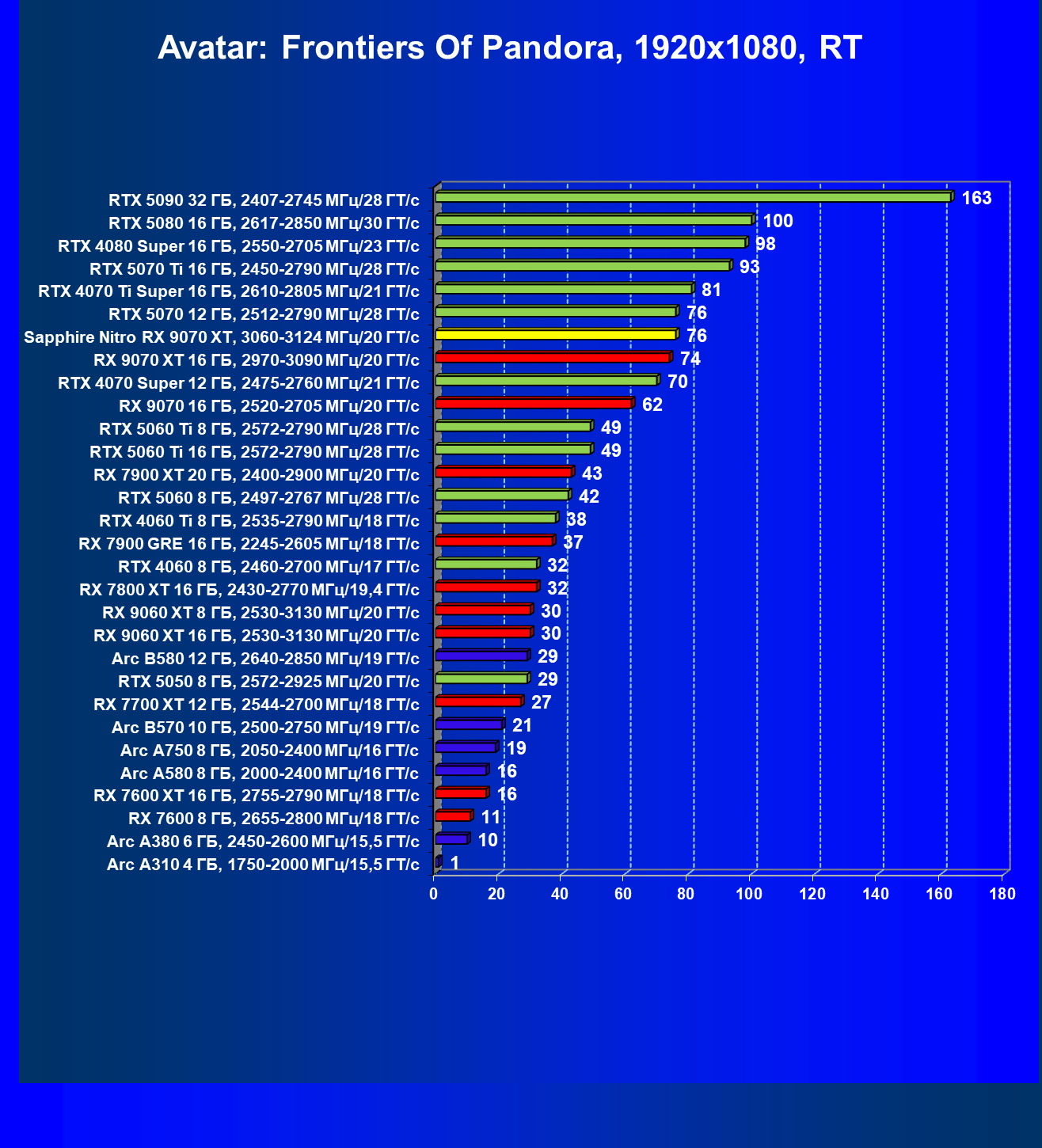 | 11 | Sapphire Nitro RX 9070 XT, 3060—3124 МГц/20 ГТ/с | 639 | 5175 | 81 000 |
