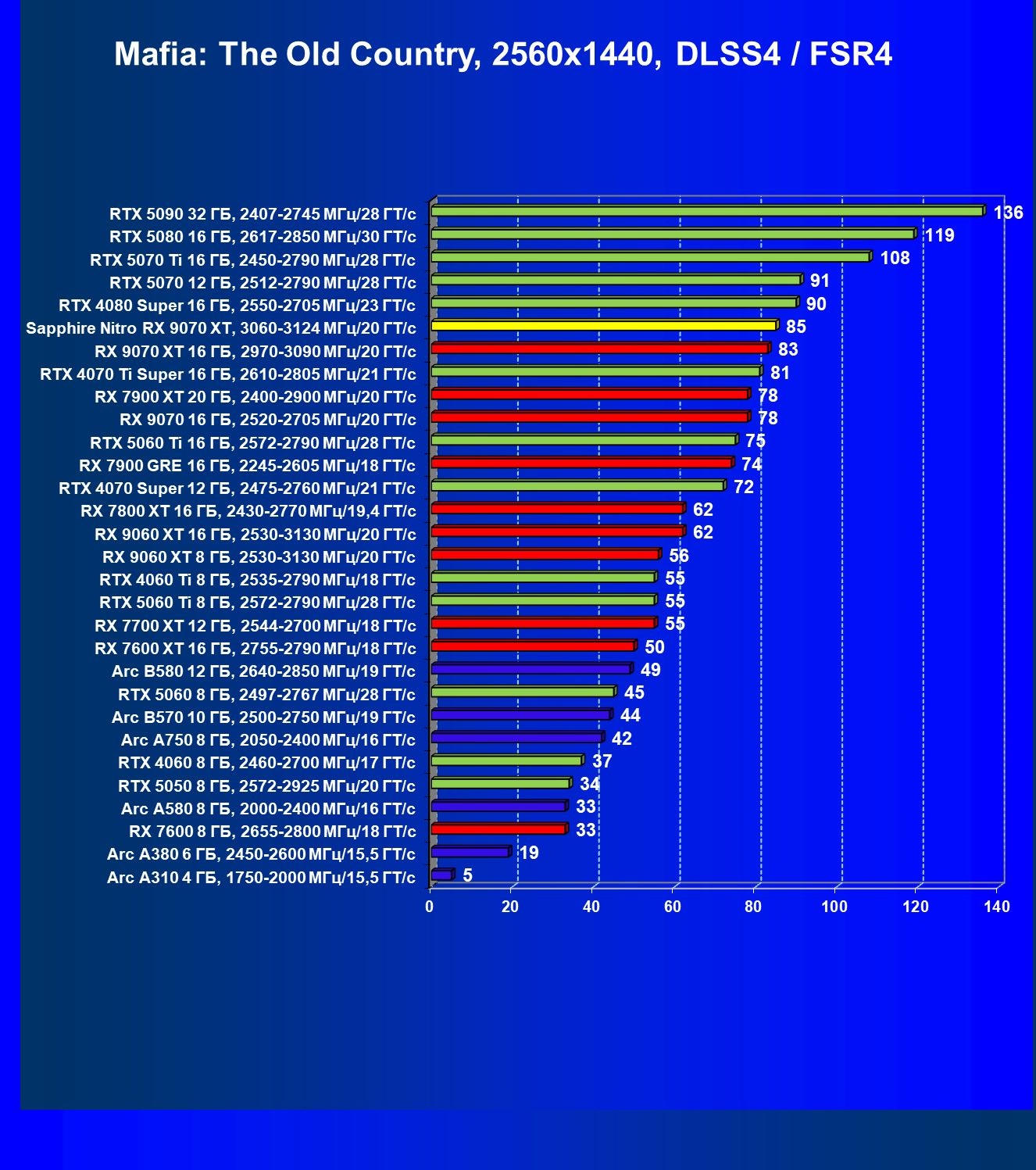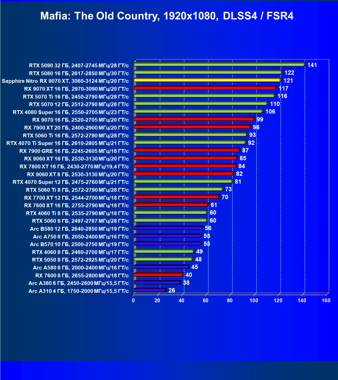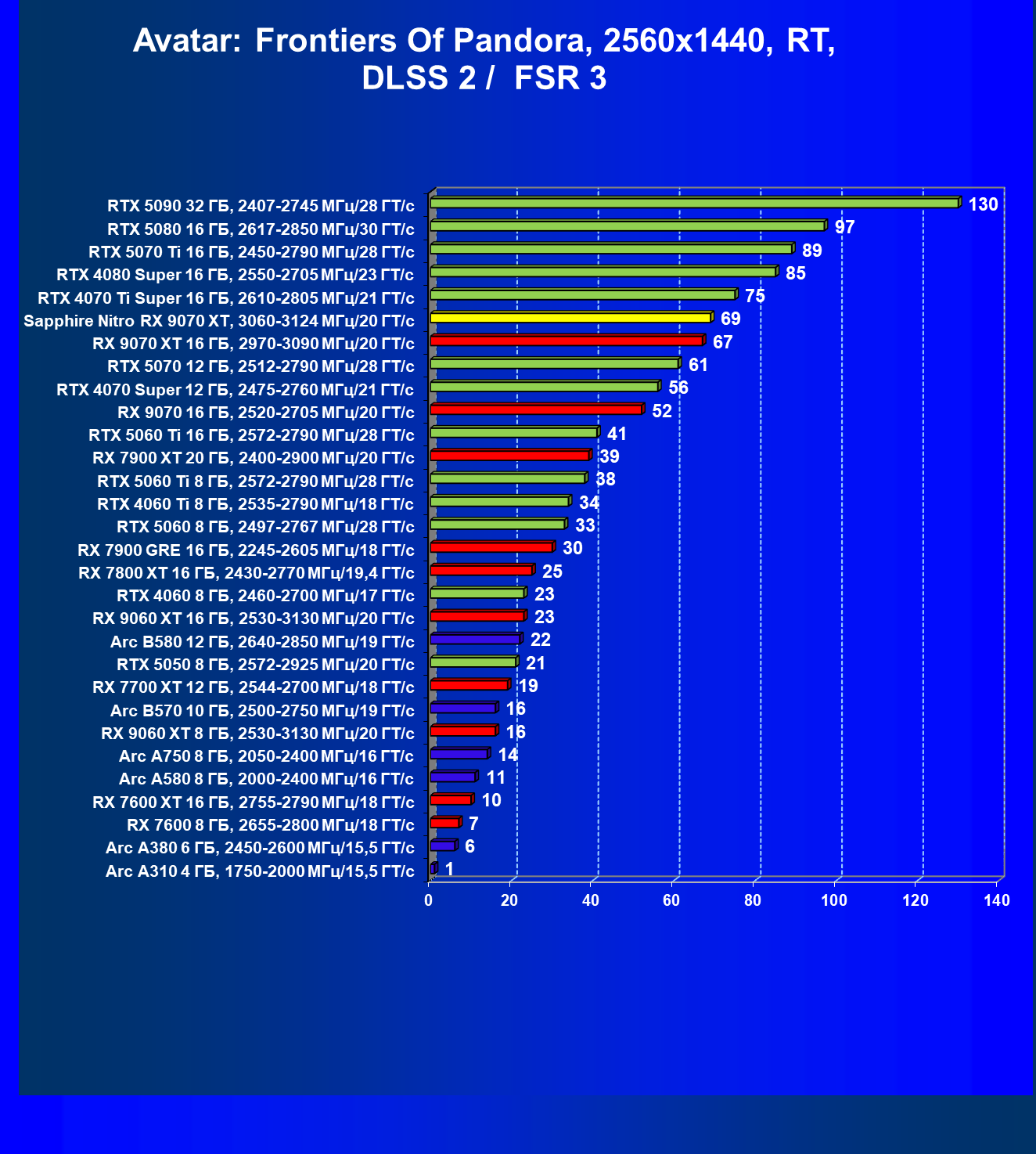 Да, RTX 5070 Ti — лидер, но при этом большого отрыва семейства GeForce от Radeon RX 9000 мы не видим. Так что, с учетом перспективности внедрения MFG в рамках FSR4 можно сказать, что Radeon RX 9070 XT уже выступает почти на уровне RTX 5070 Ti.