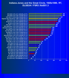 Результаты тестов со включенной аппаратной трассировкой лучей и/или DLSS/FSR/XeSS в разрешениях 1920×1080, 2560×1440 и 3840×2160