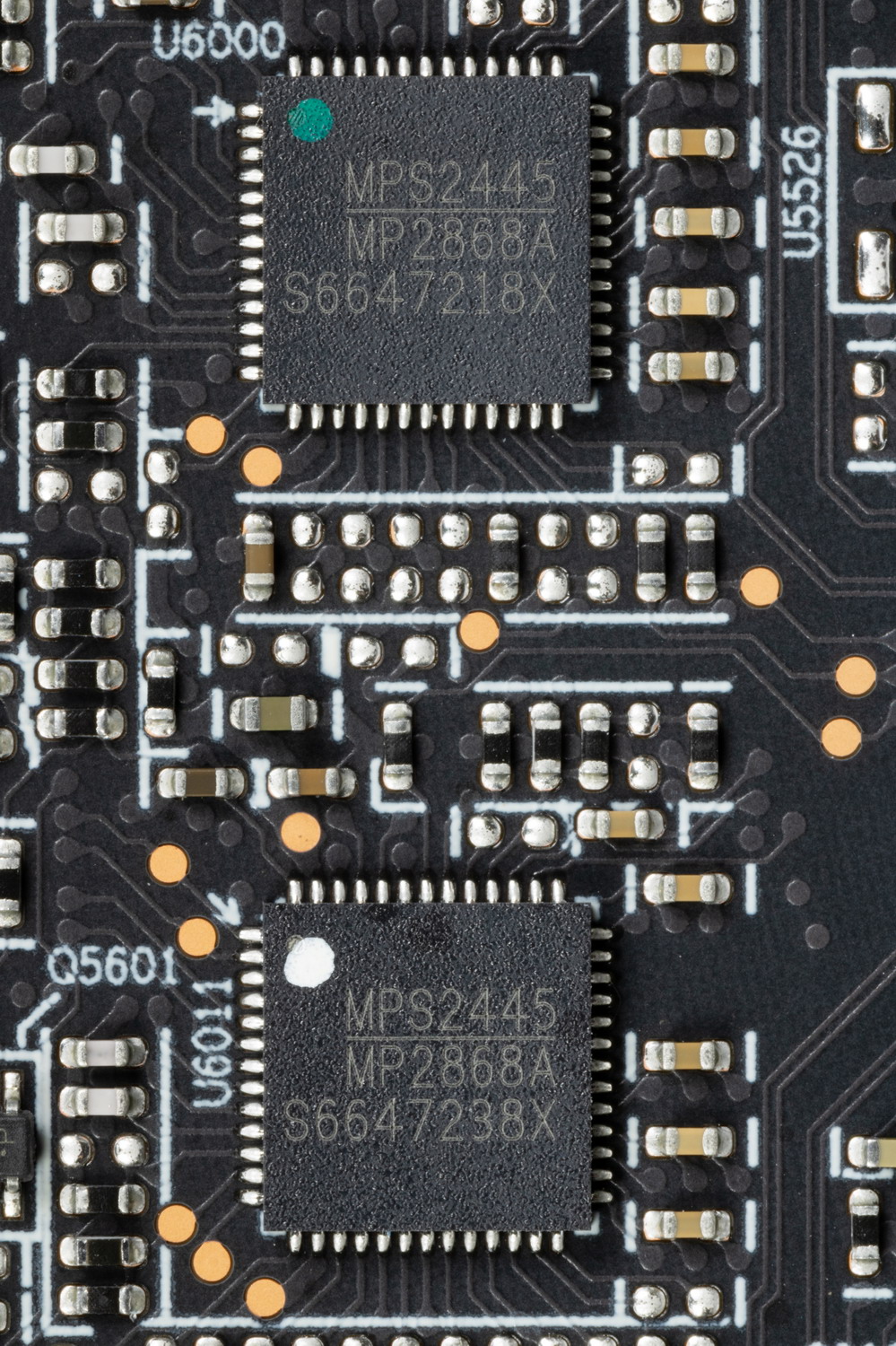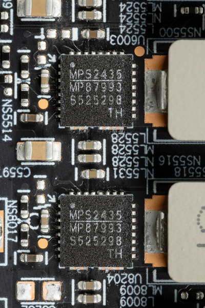 У карты имеется два ШИМ-контроллера Monolithic Power Systems MP2868, они работают в паре и управляют обеими схемами питания.