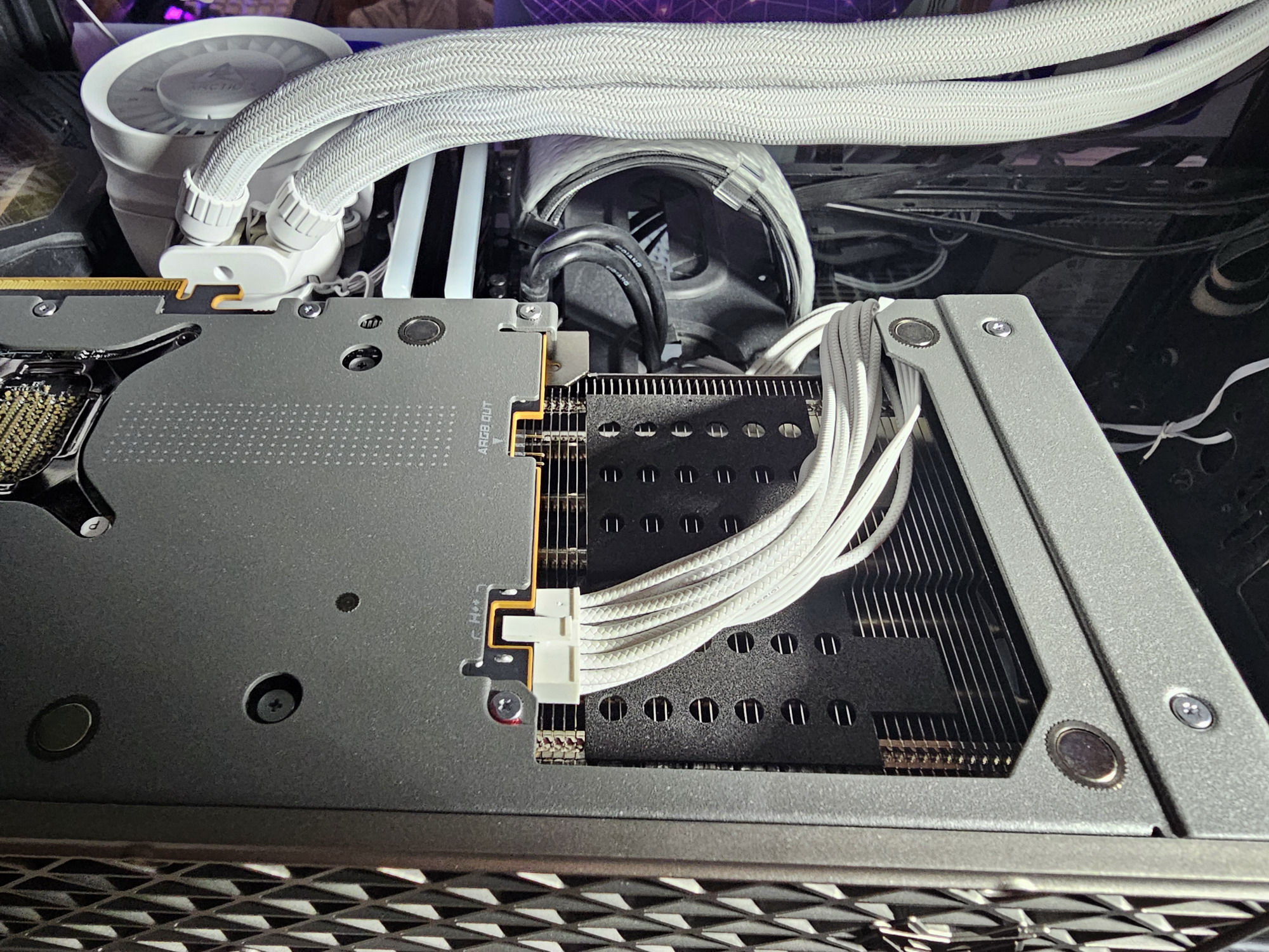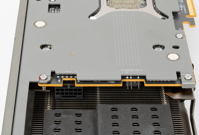 Разъем питания по сути скрыт: к нему можно подвести кабель от БП, пропустив внизу видеокарты, а сзади устанавливается дополнительная пластина на магнитах, которая маскирует кабель питания.