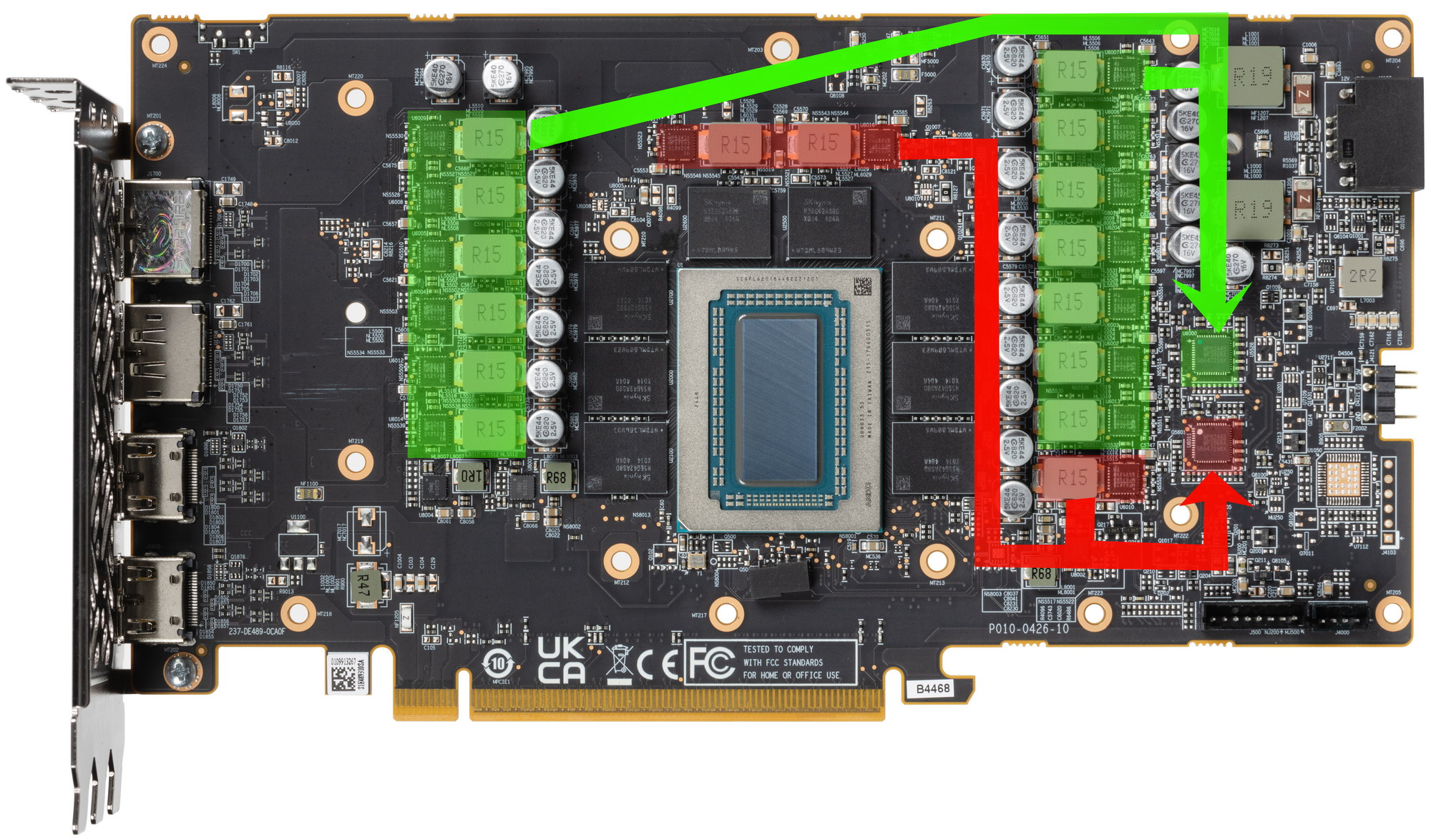 Зеленым цветом отмечена схема питания ядра (13 фаз), красным — памяти (3 фазы).
