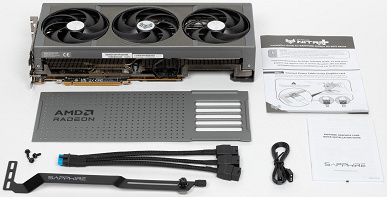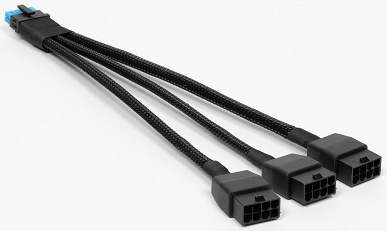 Для владельцев старых БП версии ниже ATX 3.0, не имеющих кабеля 12VHPWR, в комплекте поставки имеется адаптер-переходник на три хорошо известных 8-контактных разъема питания (его также можно спрятать за пластиной на карте).
