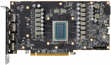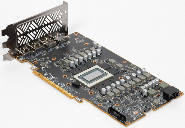 Карта имеет немного нестандартный набор видеовыходов: два DP 2.1a и два HDMI 2.1b.