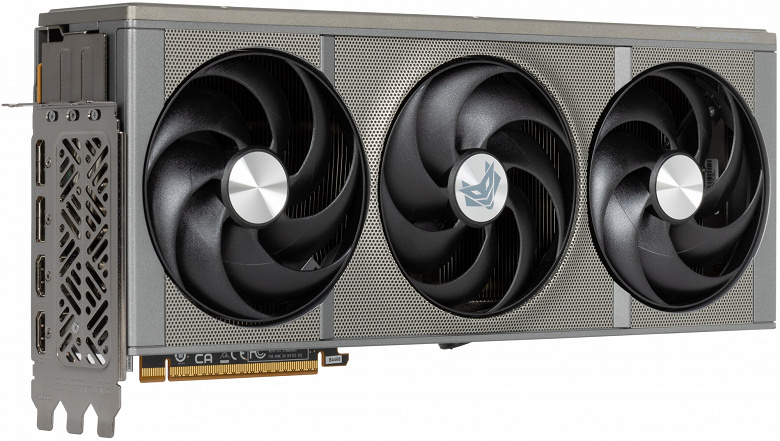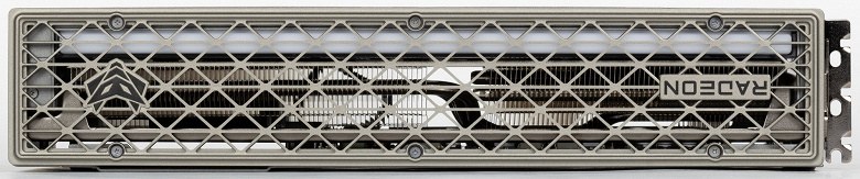 Sapphire Nitro+ Radeon RX 9070 XT OC (16 ГБ) — стильный вариант старшего ускорителя AMD последнего поколения. Общий цвет видеокарты — серый, верхний торец подсвечен, оформление симпатичное. Разъем питания спрятан под задней пластиной, так что при сборке на основе материнской платы с оборотным расположением коннекторов можно спрятать и кабель питания видеокарты.