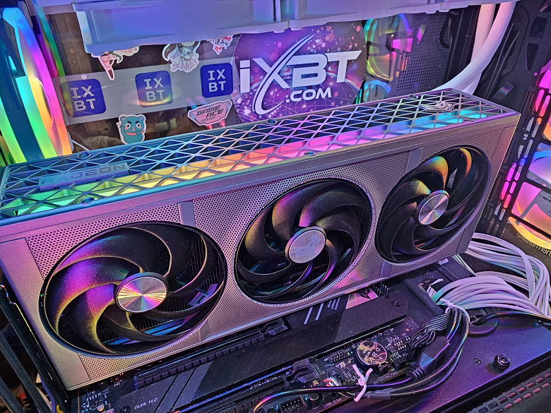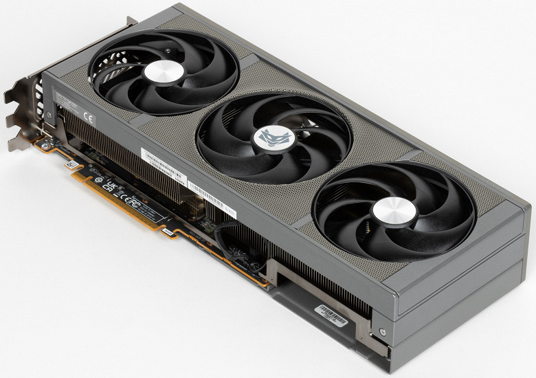 Конечно, главная особенность этой модели — очень крупная система охлаждения (33 см в длину, де-факто 4 слота по толщине), которая оправдывает свой размер: кулер работает тихо, а эффективность охлаждения высокая. Набор видеовыходов: 2 DP 2.1b и 2 HDMI 2.1b. Максимальная потребляемая мощность составляет 331 Вт, питание осуществляется через один 16-контактный разъем питания 12VHPWR стандарта PCIe 5.0 (в комплекте поставки имеется переходник с трех 8-контактных разъемов версии PCIe 2.0).